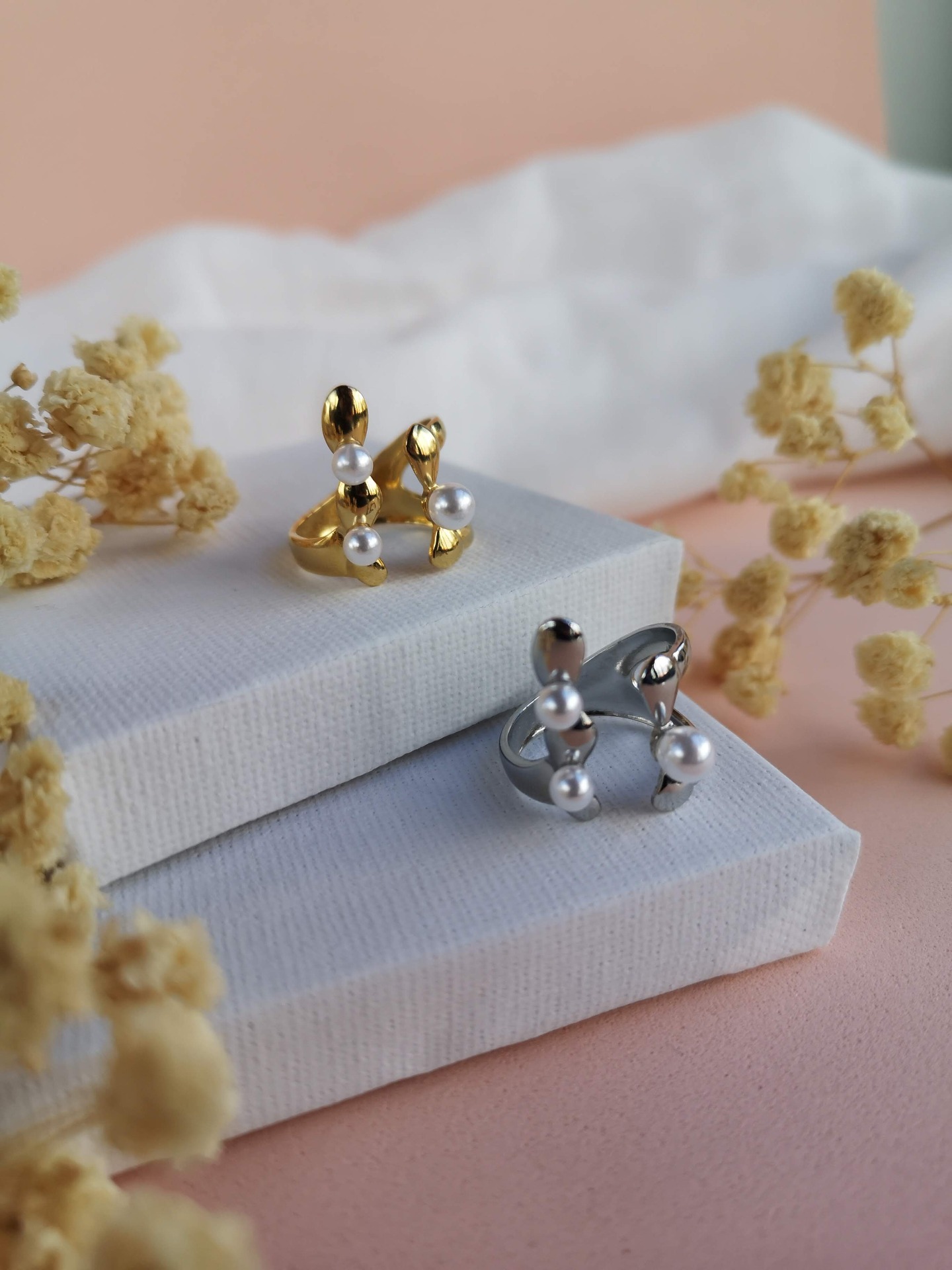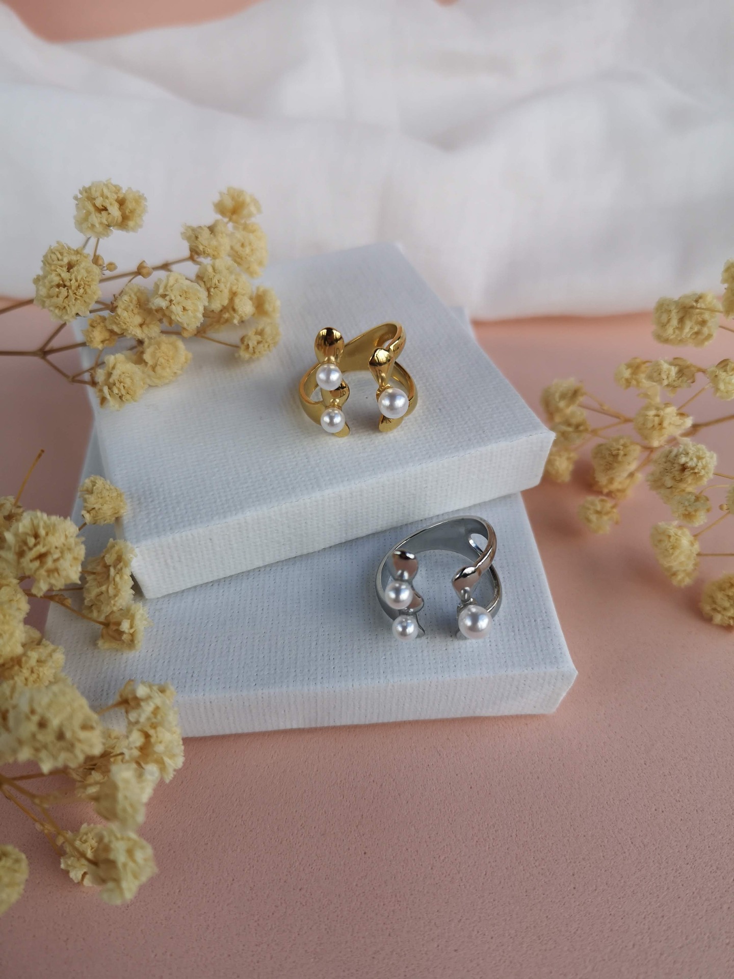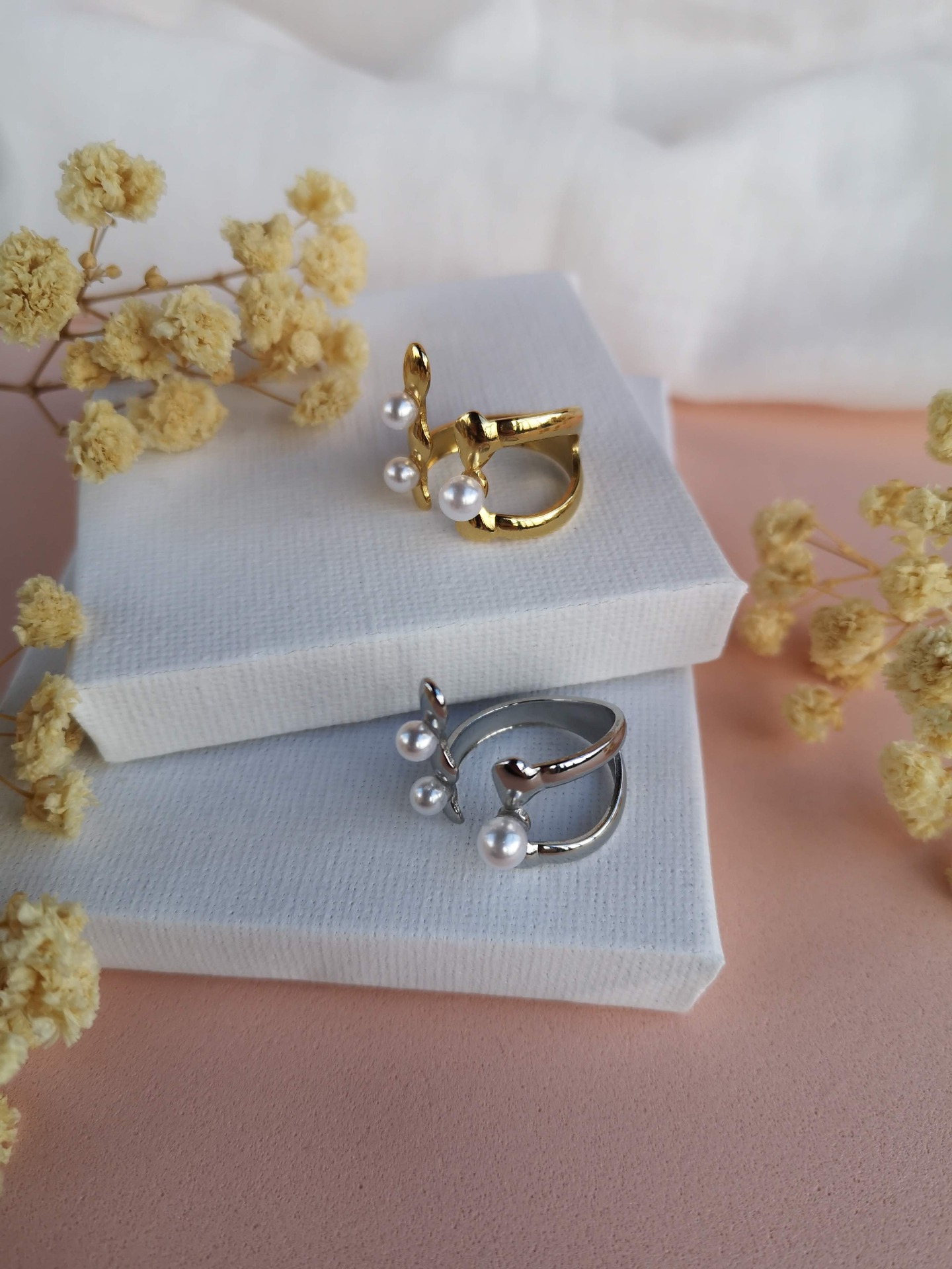 Anel com pérolas ajustável em aço inóxidável garantindo um encaixe confortável em diferentes tamanhos de dedo.