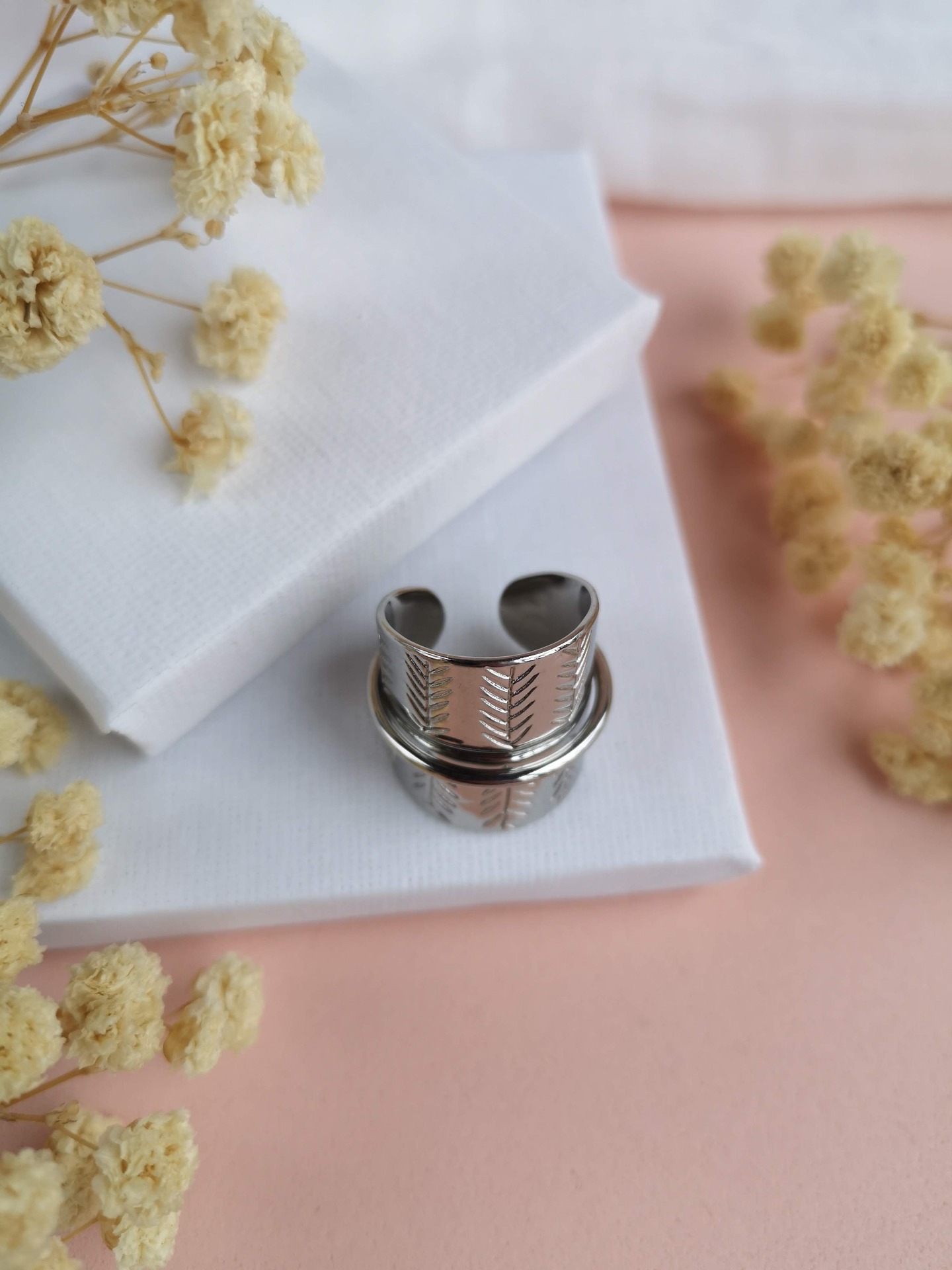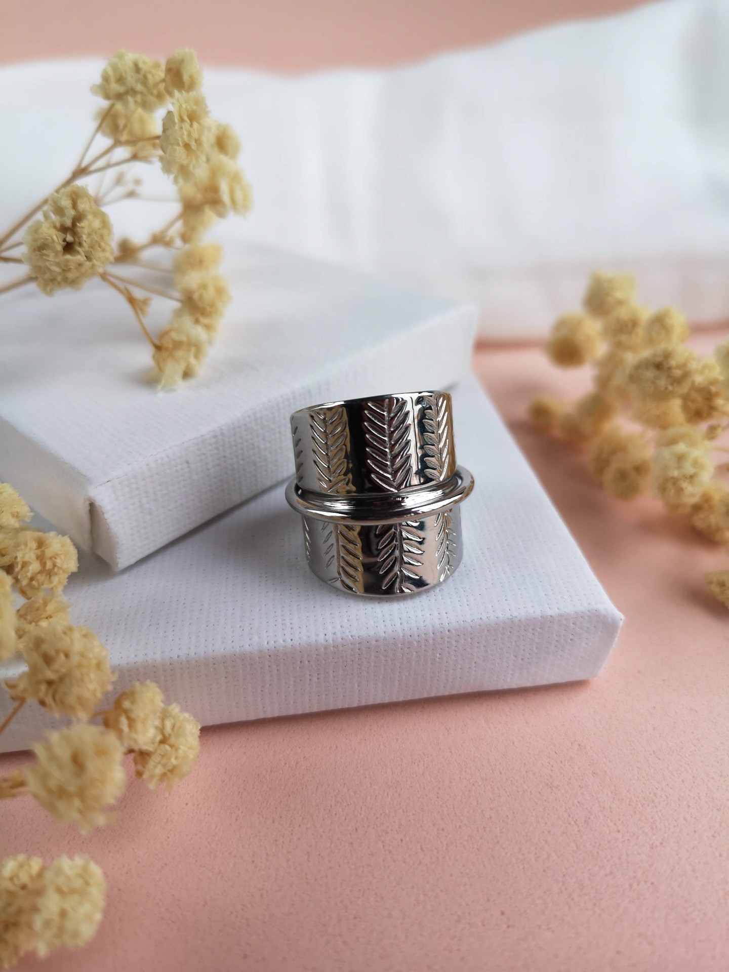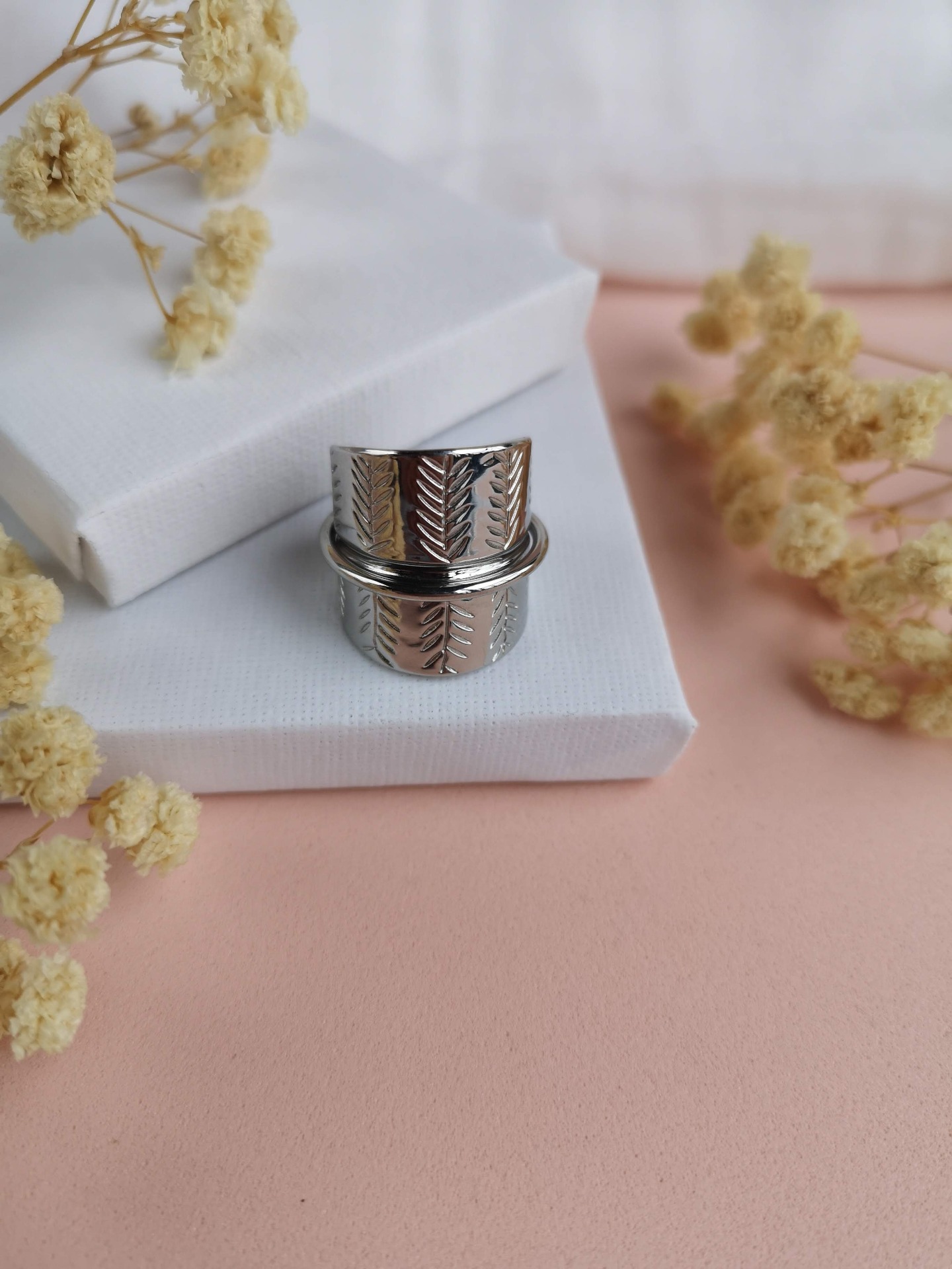 Anel largo em aço inoxidável prateado, ideal para quem procura um toque marcante e ousado, combina perfeitamente com diversos estilos.