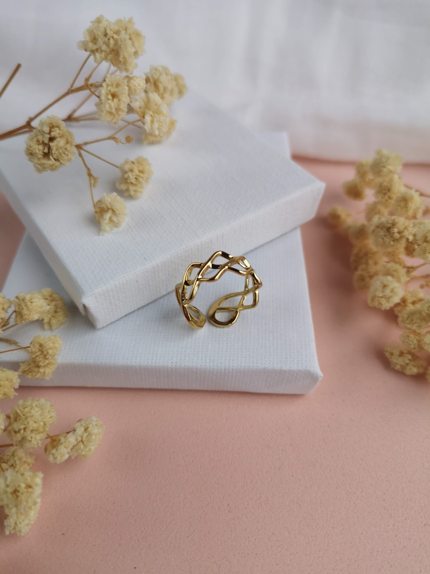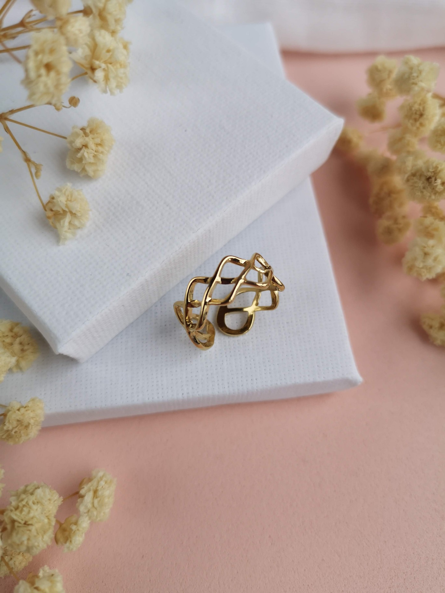 Anel ajustável em aço inóxidável dourado garantindo um encaixe confortável em diferentes tamanhos de dedo.
