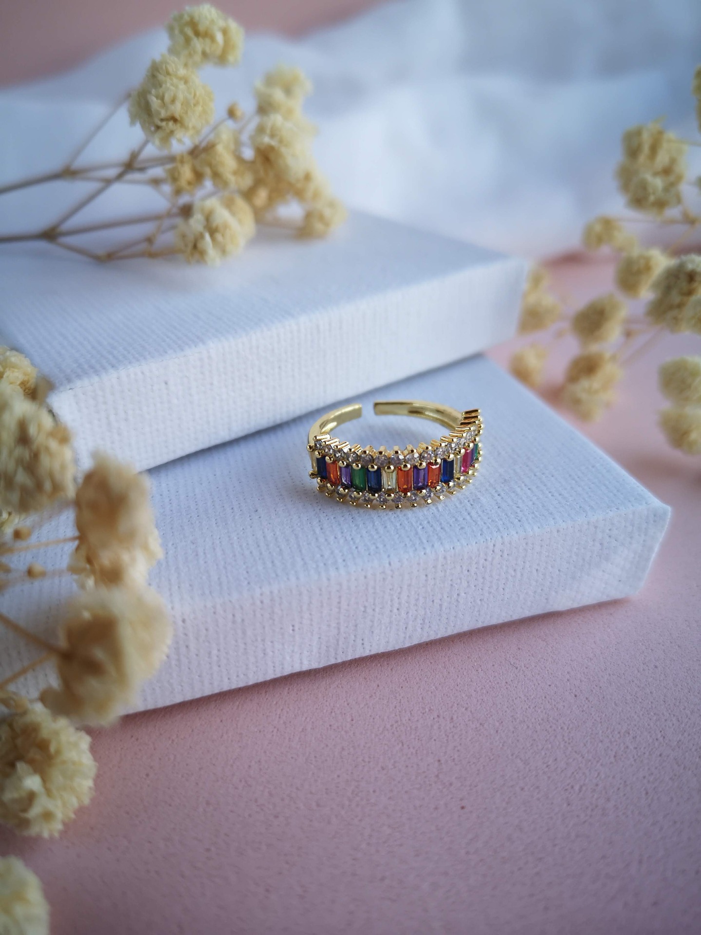 Anel com zircónias de várias cores, ajustável em aço inóxidável dourado garantindo um encaixe confortável em diferentes tamanhos de dedo.