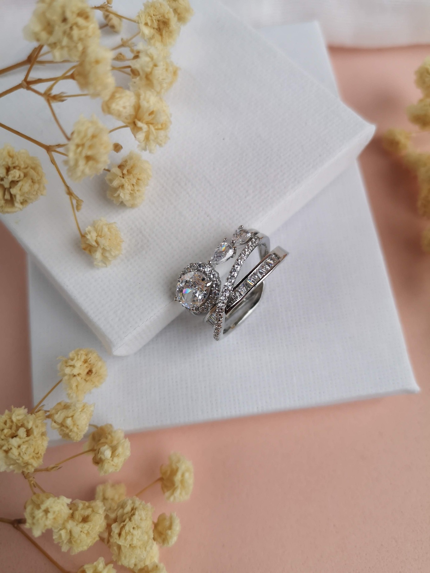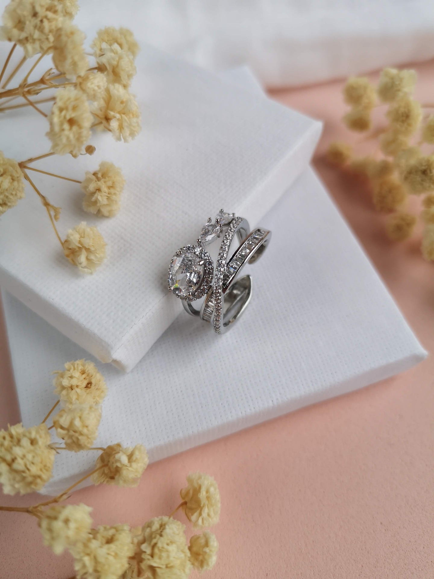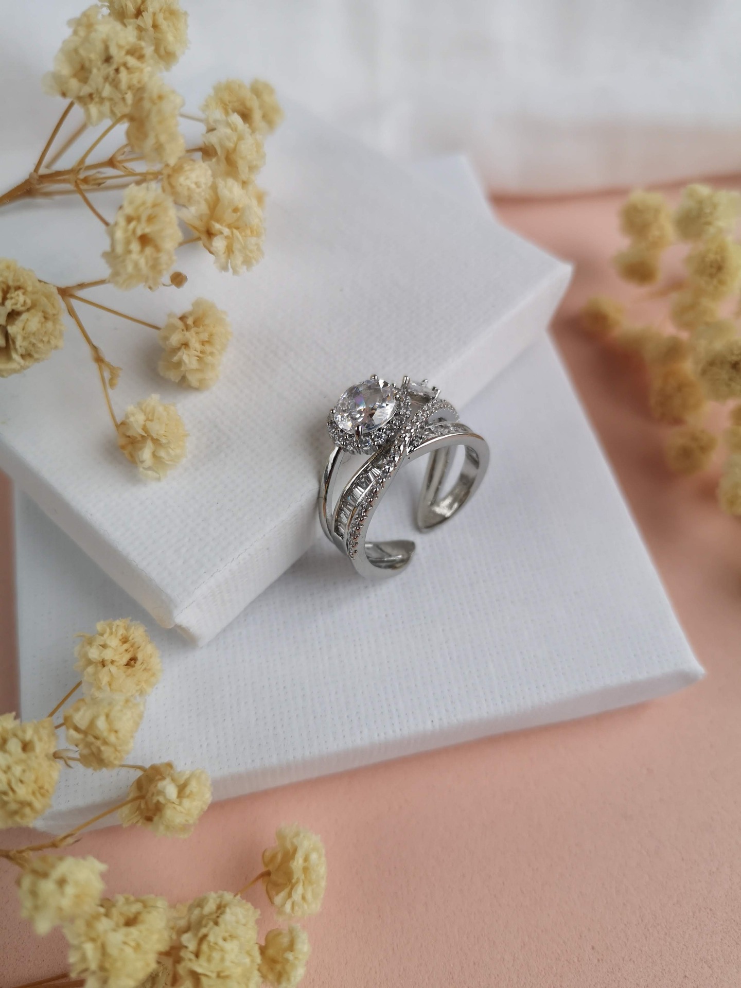 Anel com brilhante grande e zircónias brancas em aço inoxidável prateado apresenta um design ousado e moderno, perfeito para quem procura um toque de personalidade em seus acessórios.