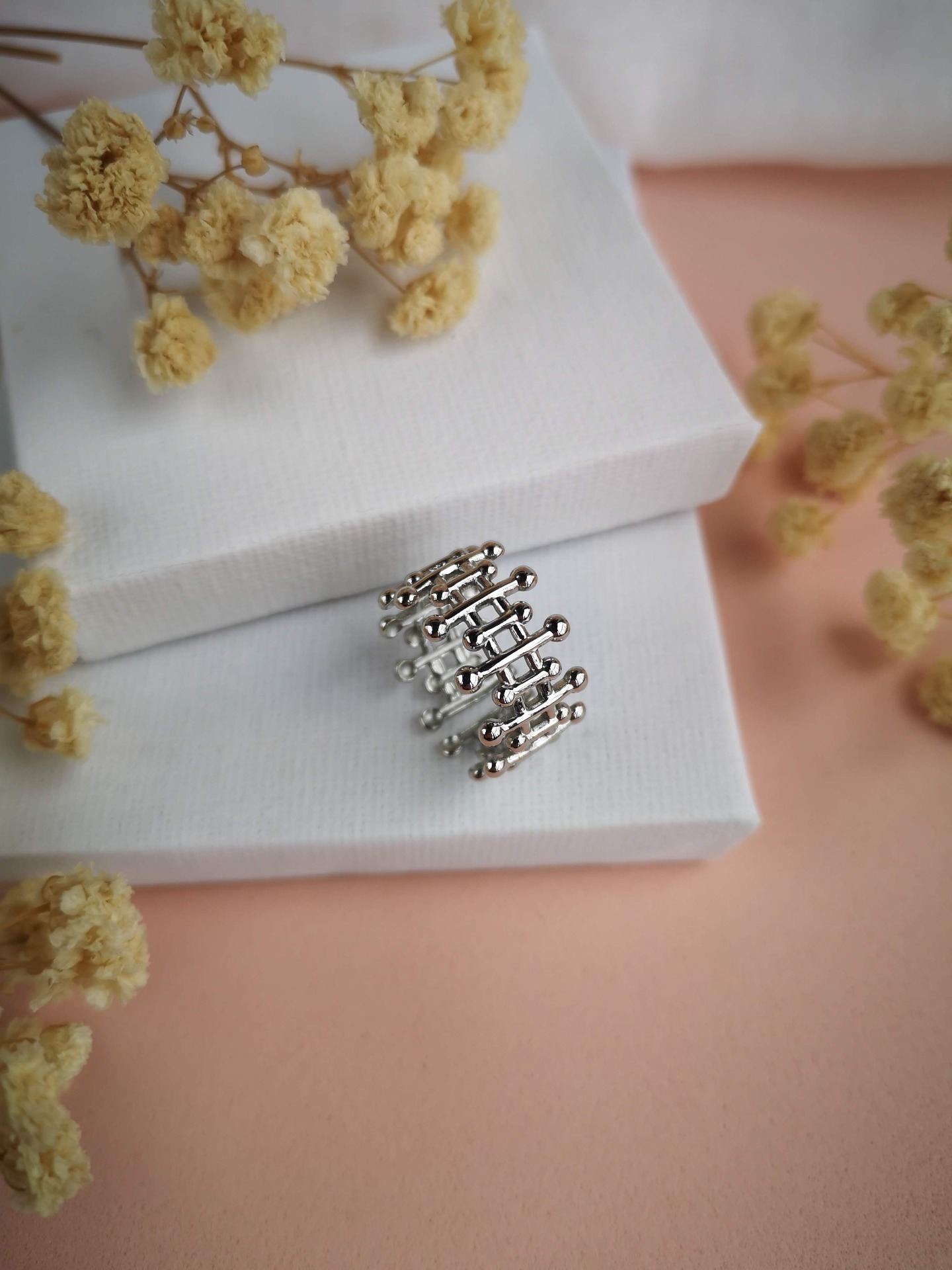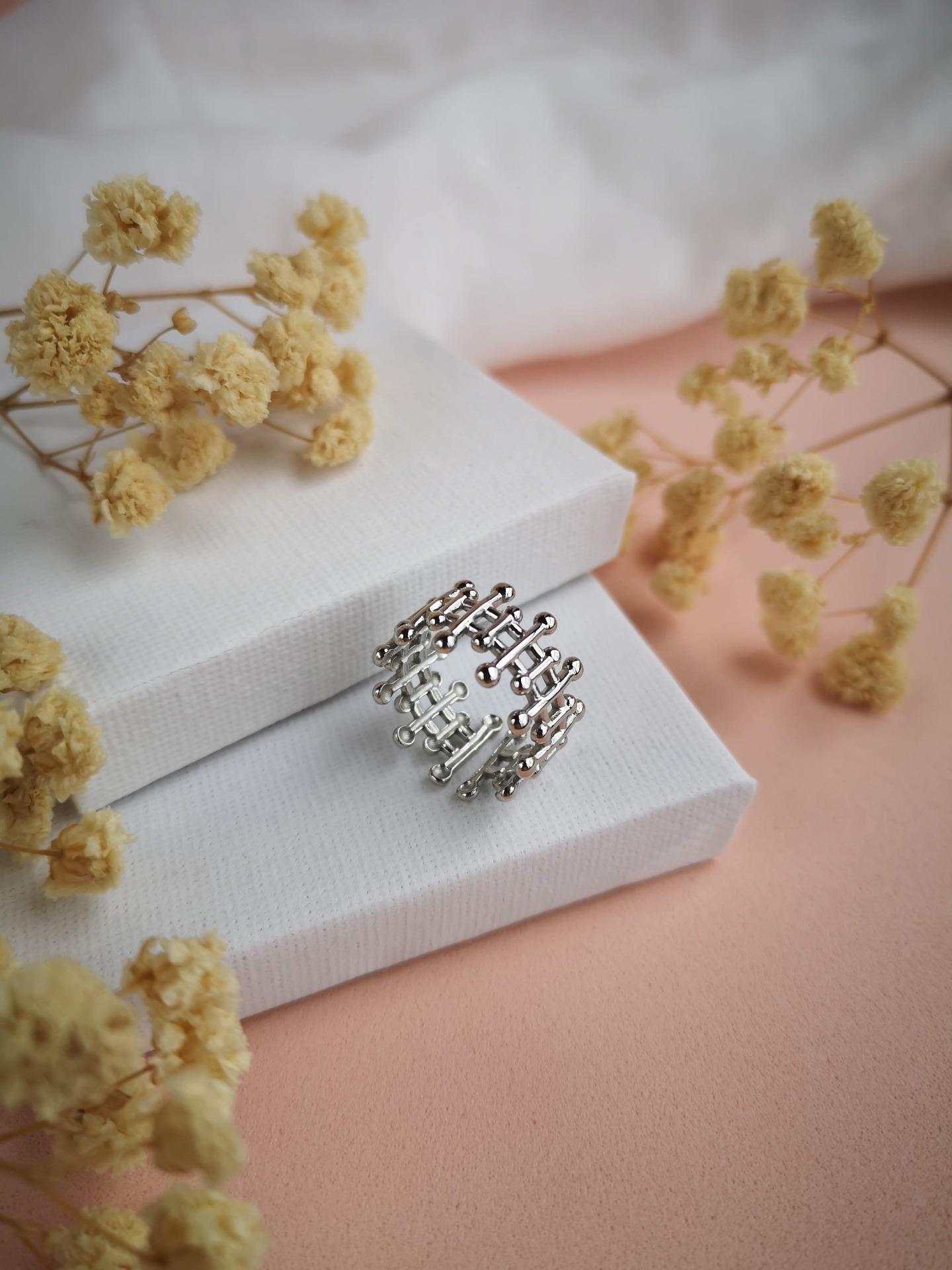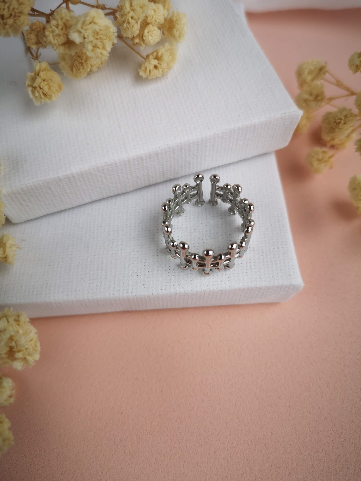 Anel ajustável em aço inóxidável prateado garantindo um encaixe confortável em diferentes tamanhos de dedo.