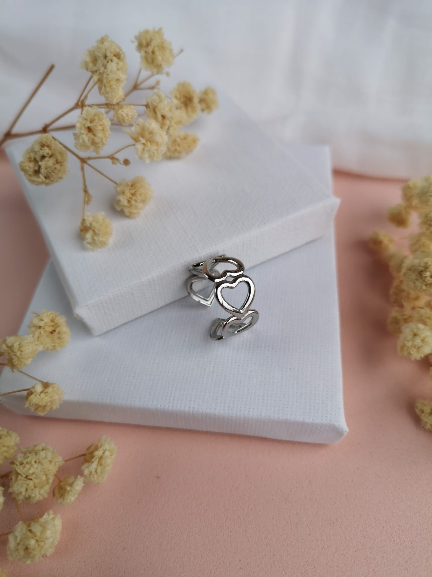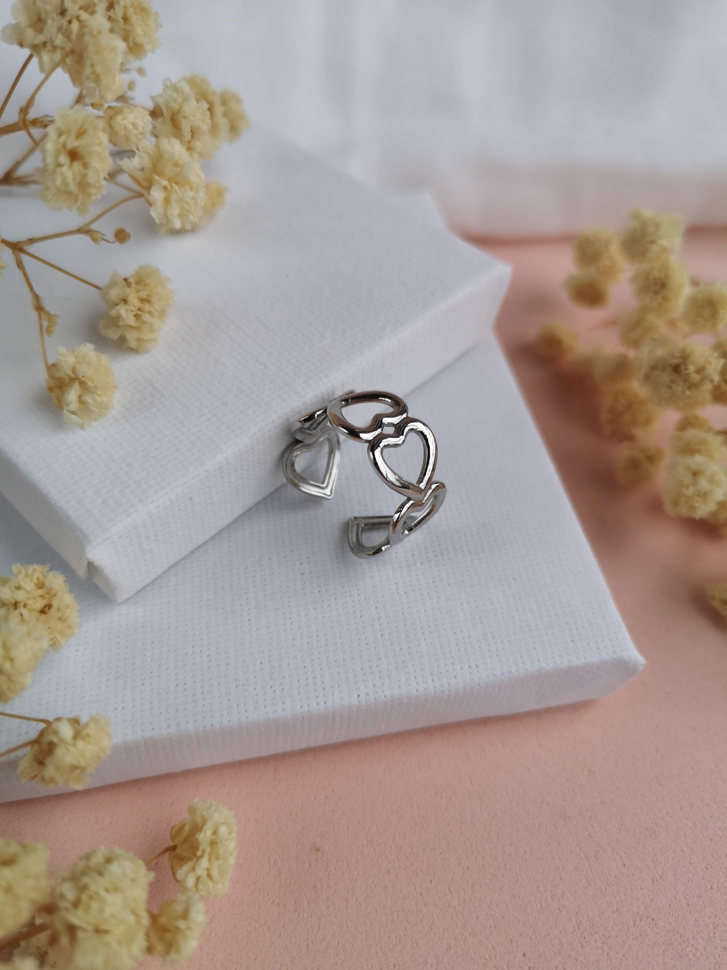 Anel ajustável em aço inóxidável prateado garantindo um encaixe confortável em diferentes tamanhos de dedo.