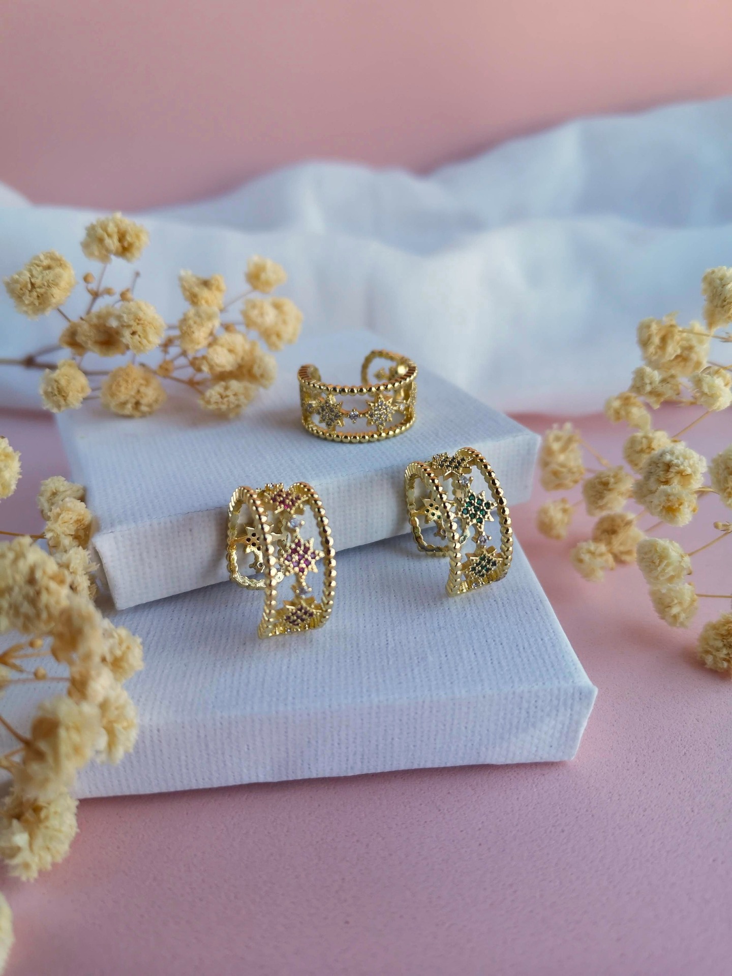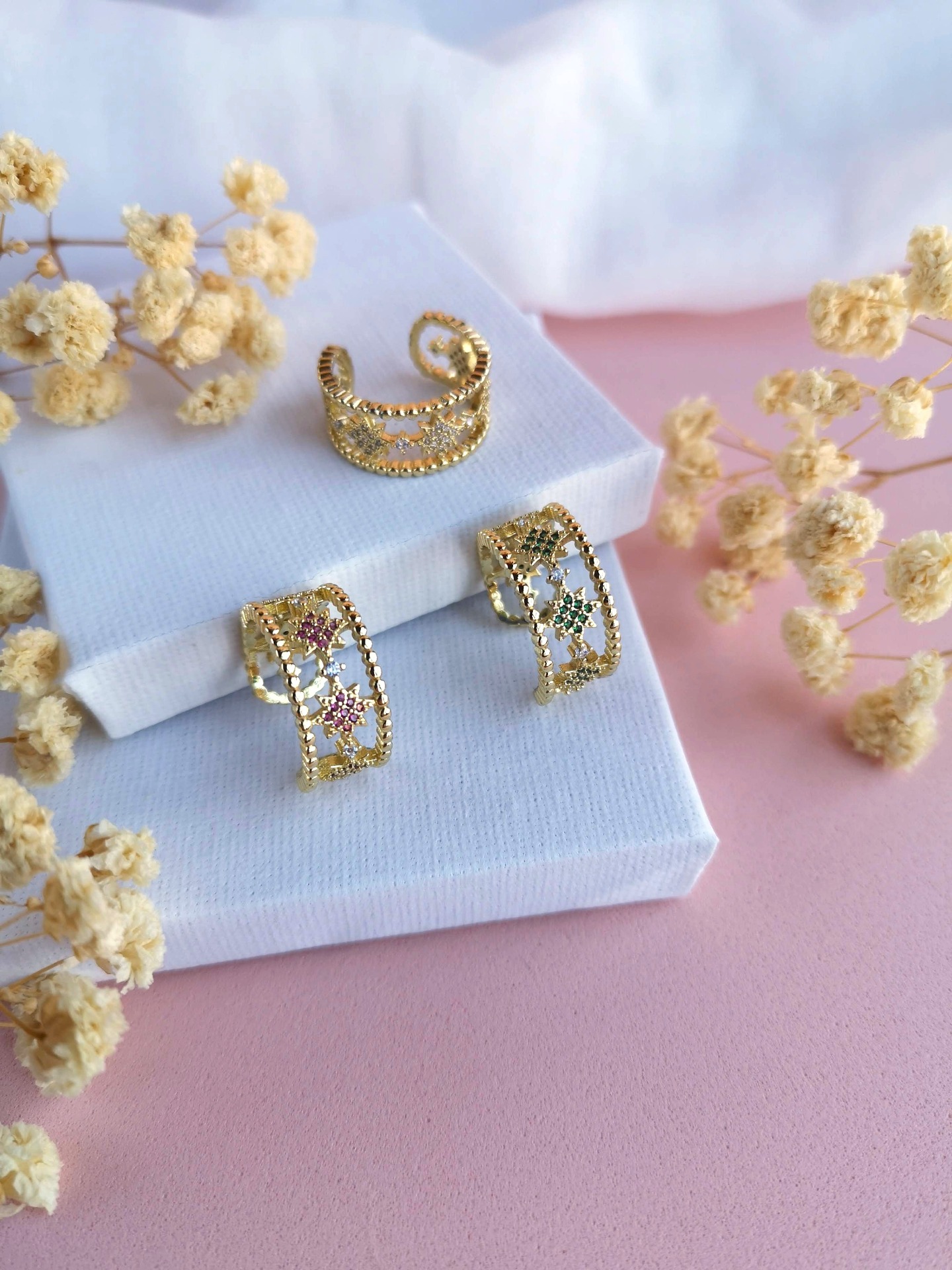Disponível em zircónias brancas, verdes e rosa.