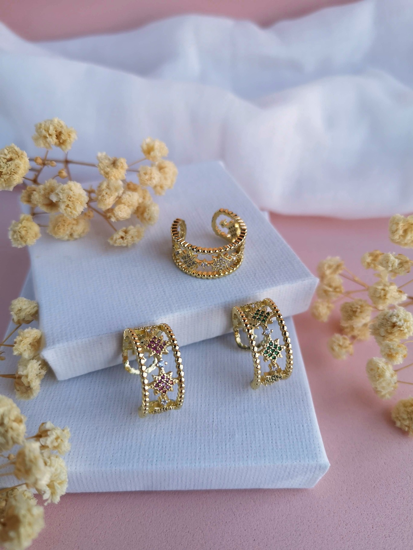 Anel com zircónias brancas, verdes e rosa ajustável em aço inóxidável dourado garantindo um encaixe confortável em diferentes tamanhos de dedo.