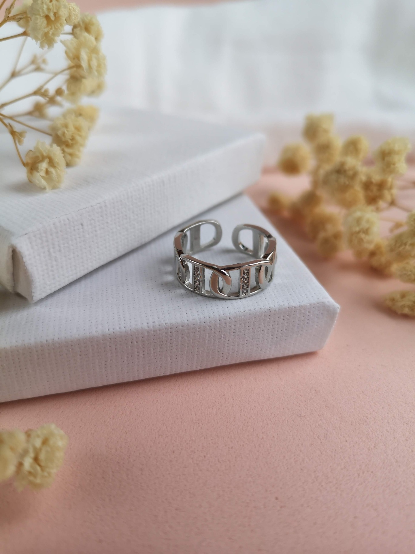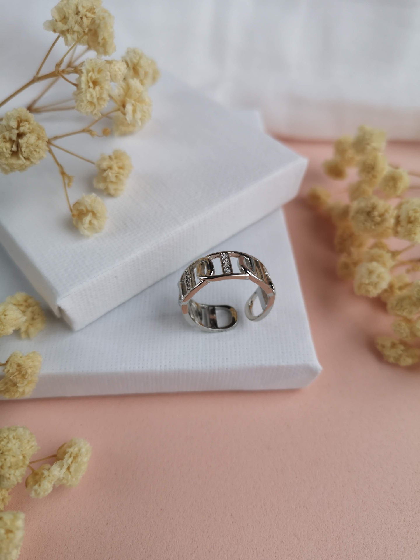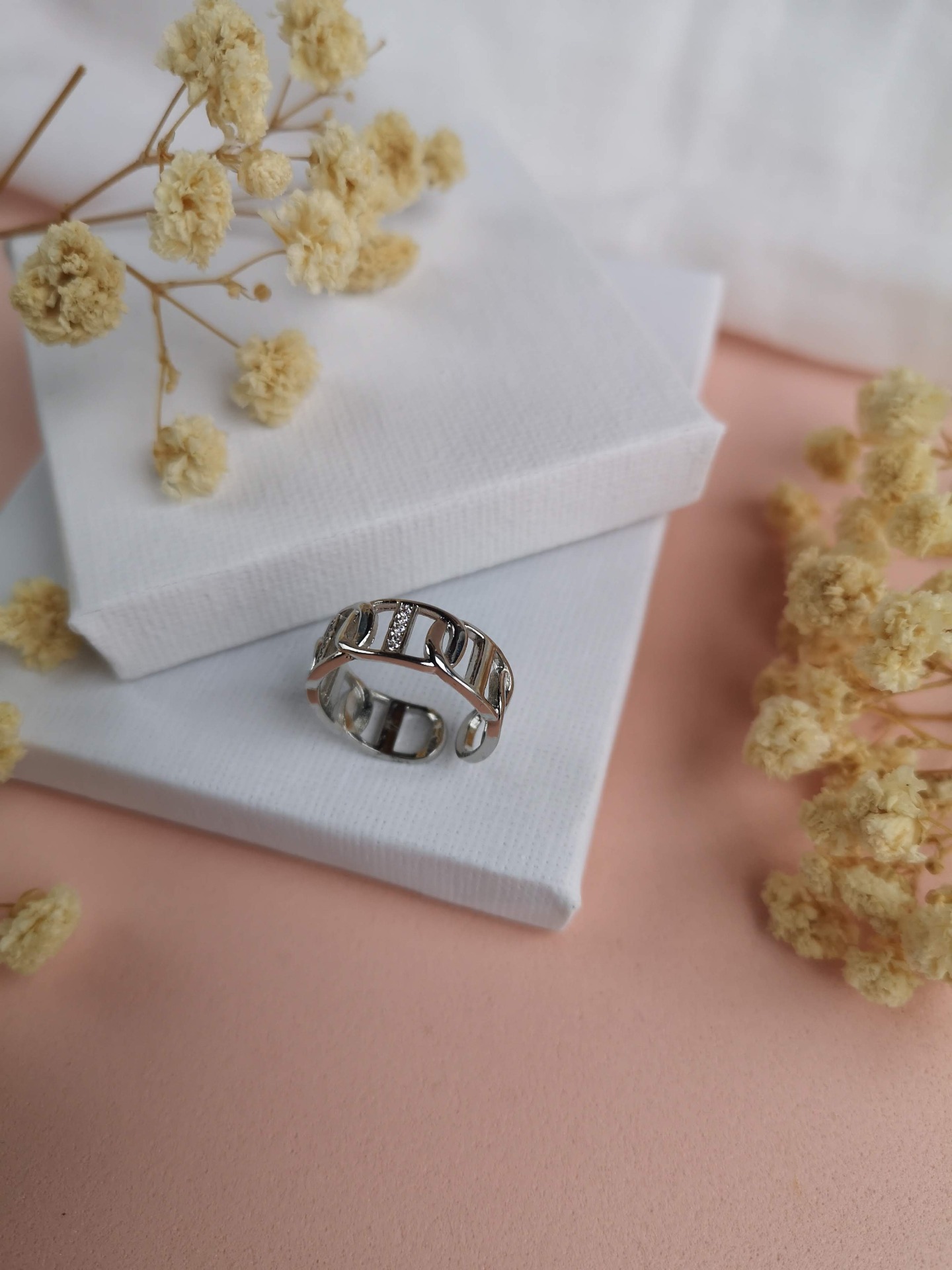 Anel com zicórnias brancas, ajustável em aço inoxidável prateado, com aplicação de zircônias brancas que acrescentam brilho e cor à peça.