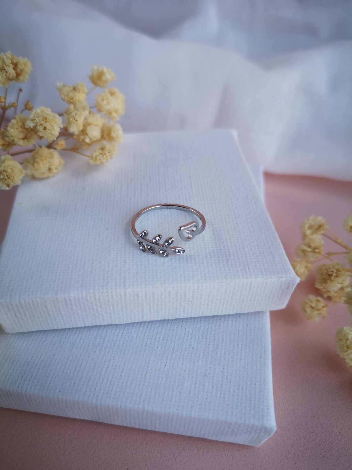 Anel com zircónias brancas, ajustável em aço inóxidável prateado garantindo um encaixe confortável em diferentes tamanhos de dedo.