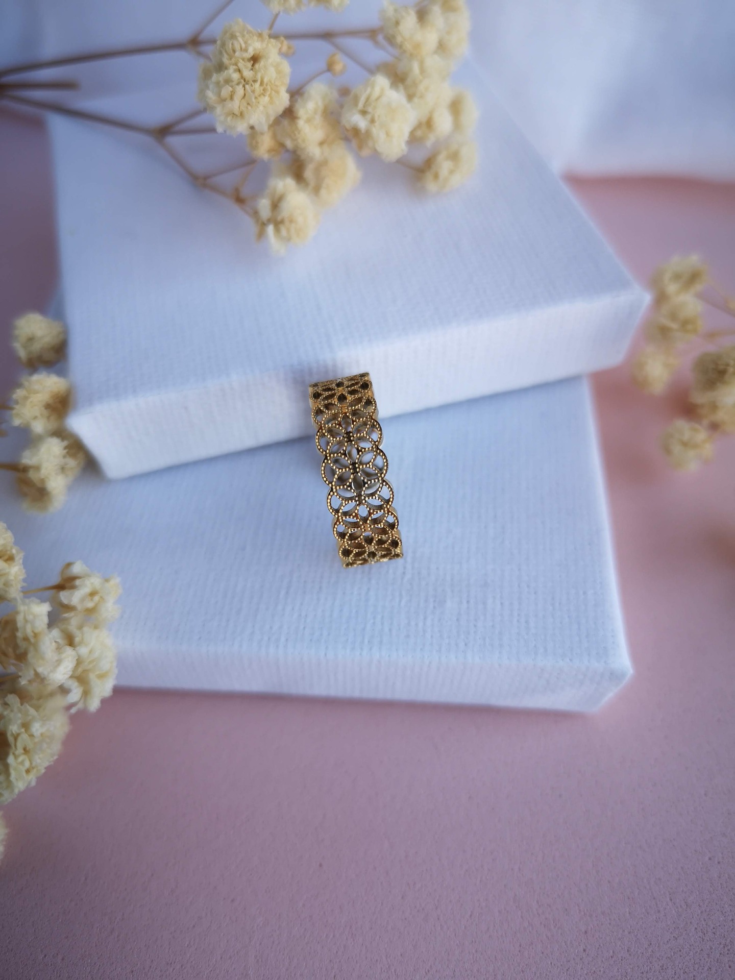 Anel ajustável em aço inóxidável dourado garantindo um encaixe confortável em diferentes tamanhos de dedo.