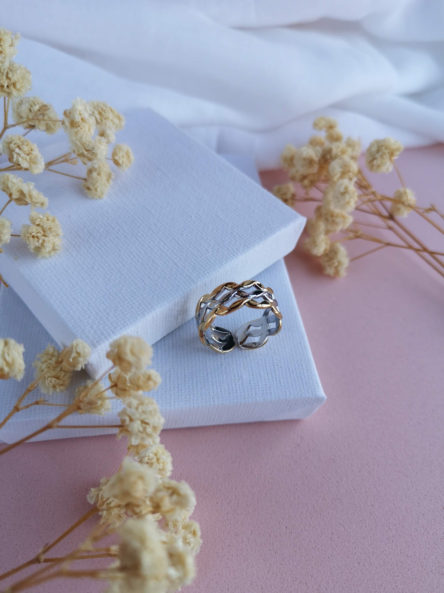 Anel ajustável em aço inóxidável dourado e prateado garantindo um encaixe confortável em diferentes tamanhos de dedo.