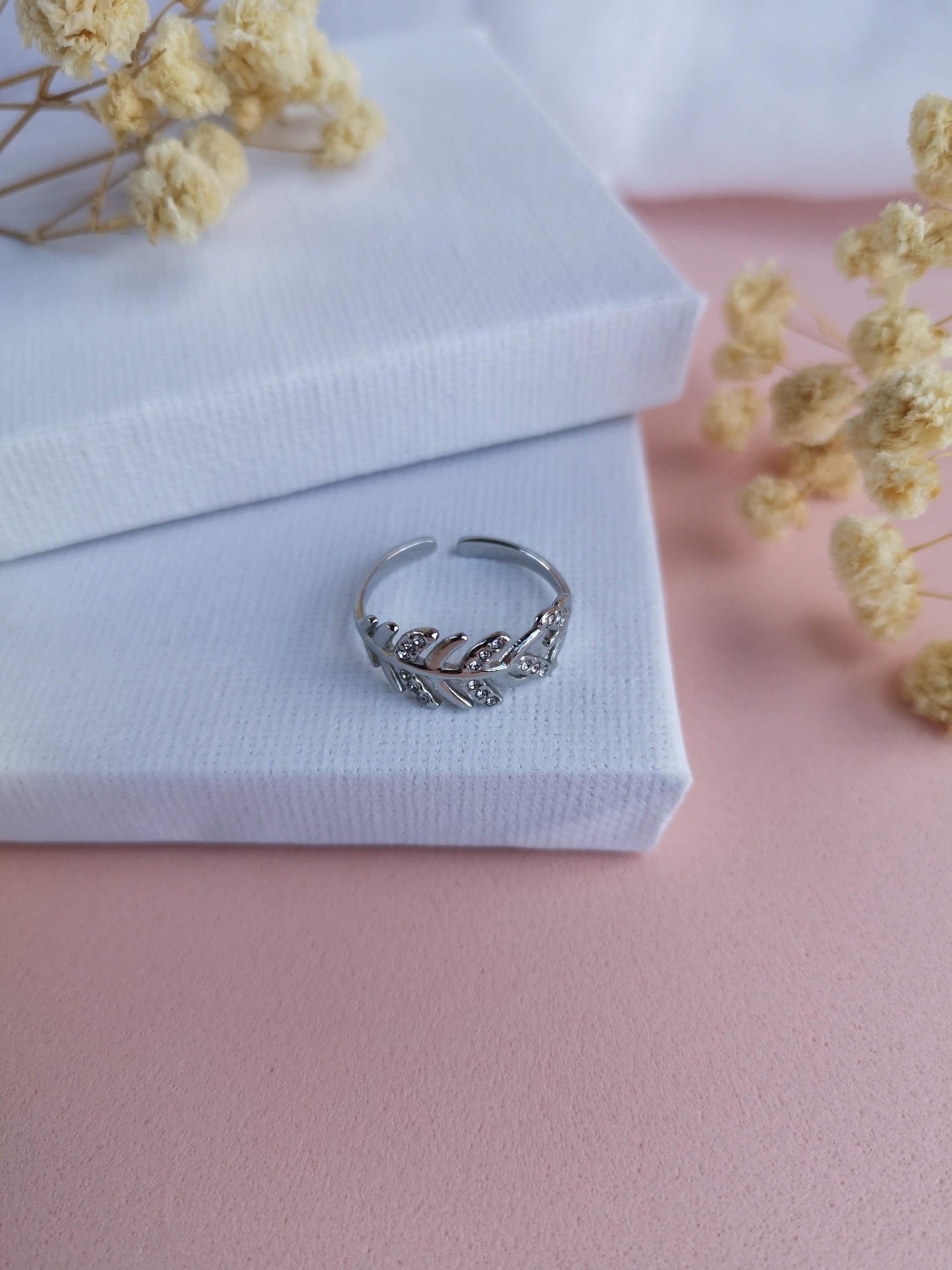 Anel com zicórnias brancas, ajustável em aço inoxidável prateado, com aplicação de zircônias brancas que acrescentam brilho e cor à peça.