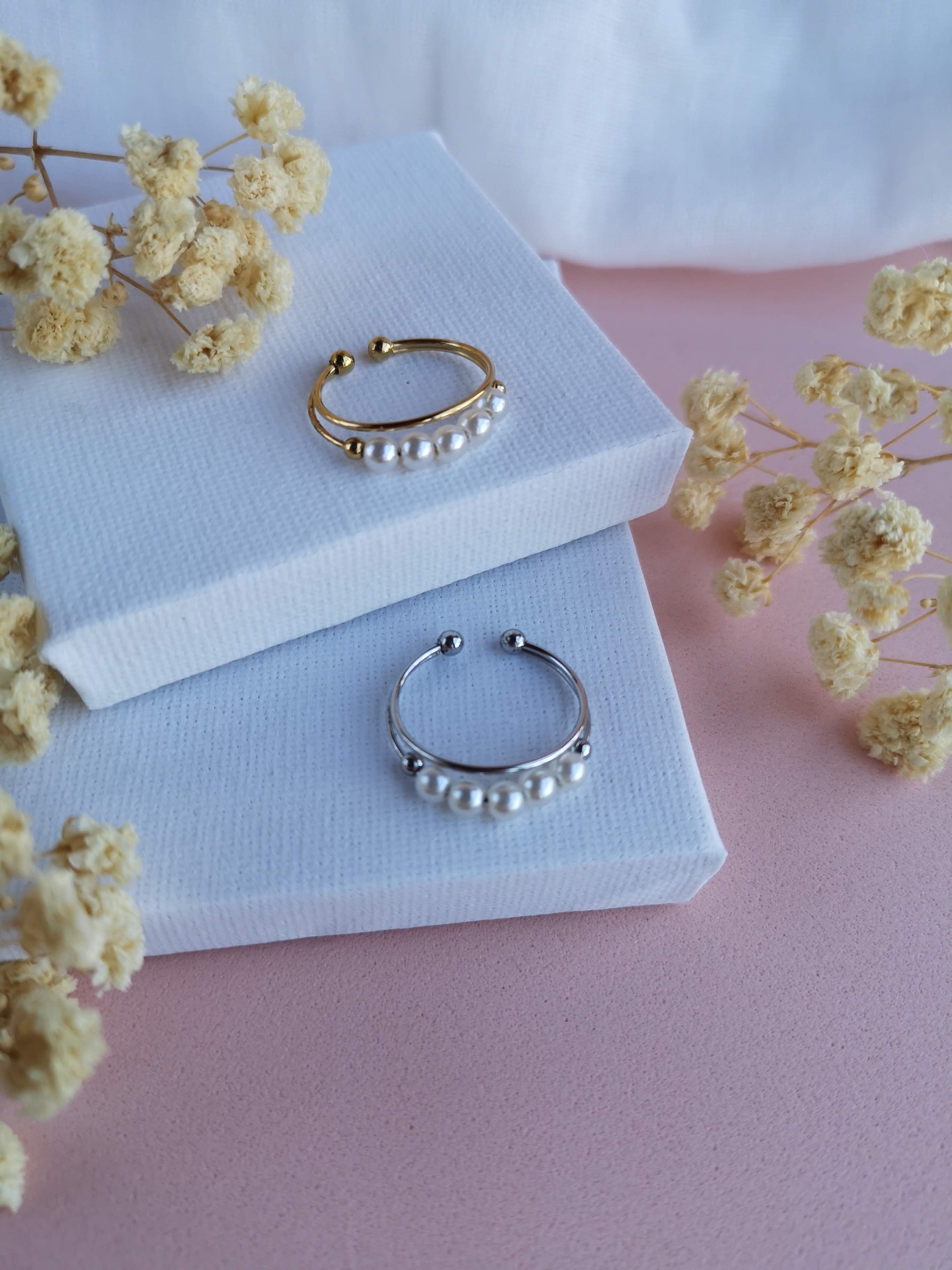Anel com pérolas, ajustável em aço inóxidável garantindo um encaixe confortável em diferentes tamanhos de dedo.