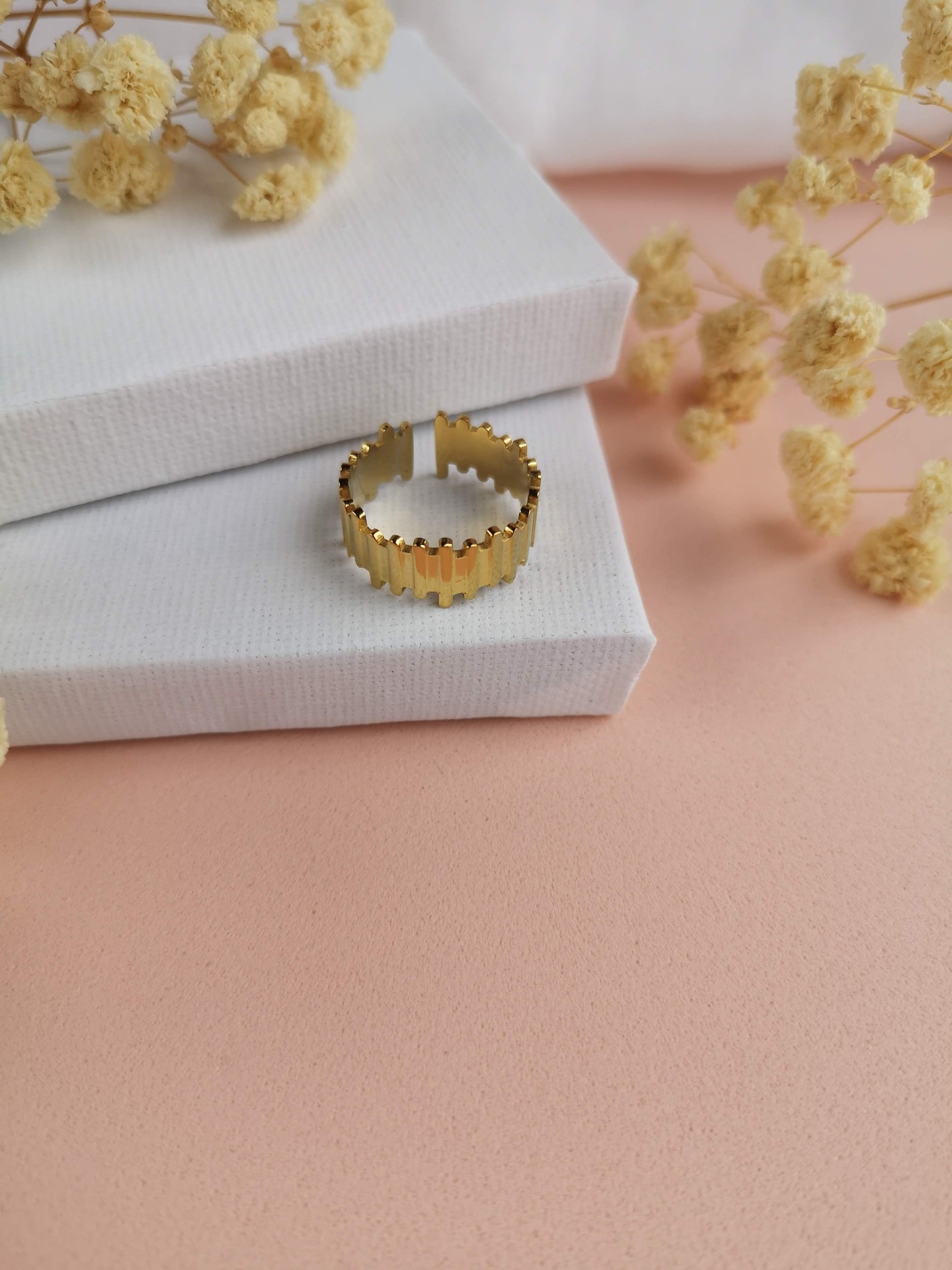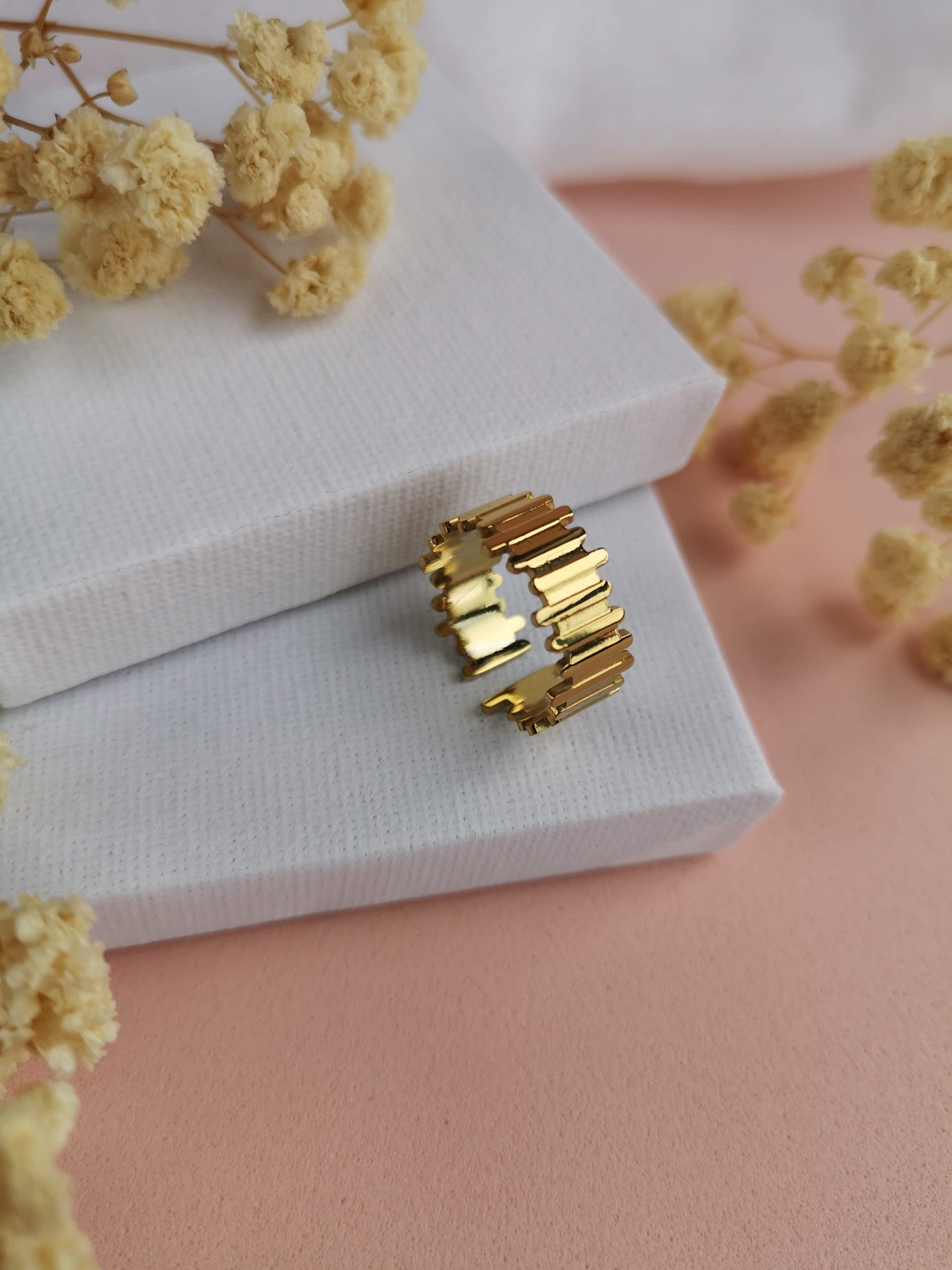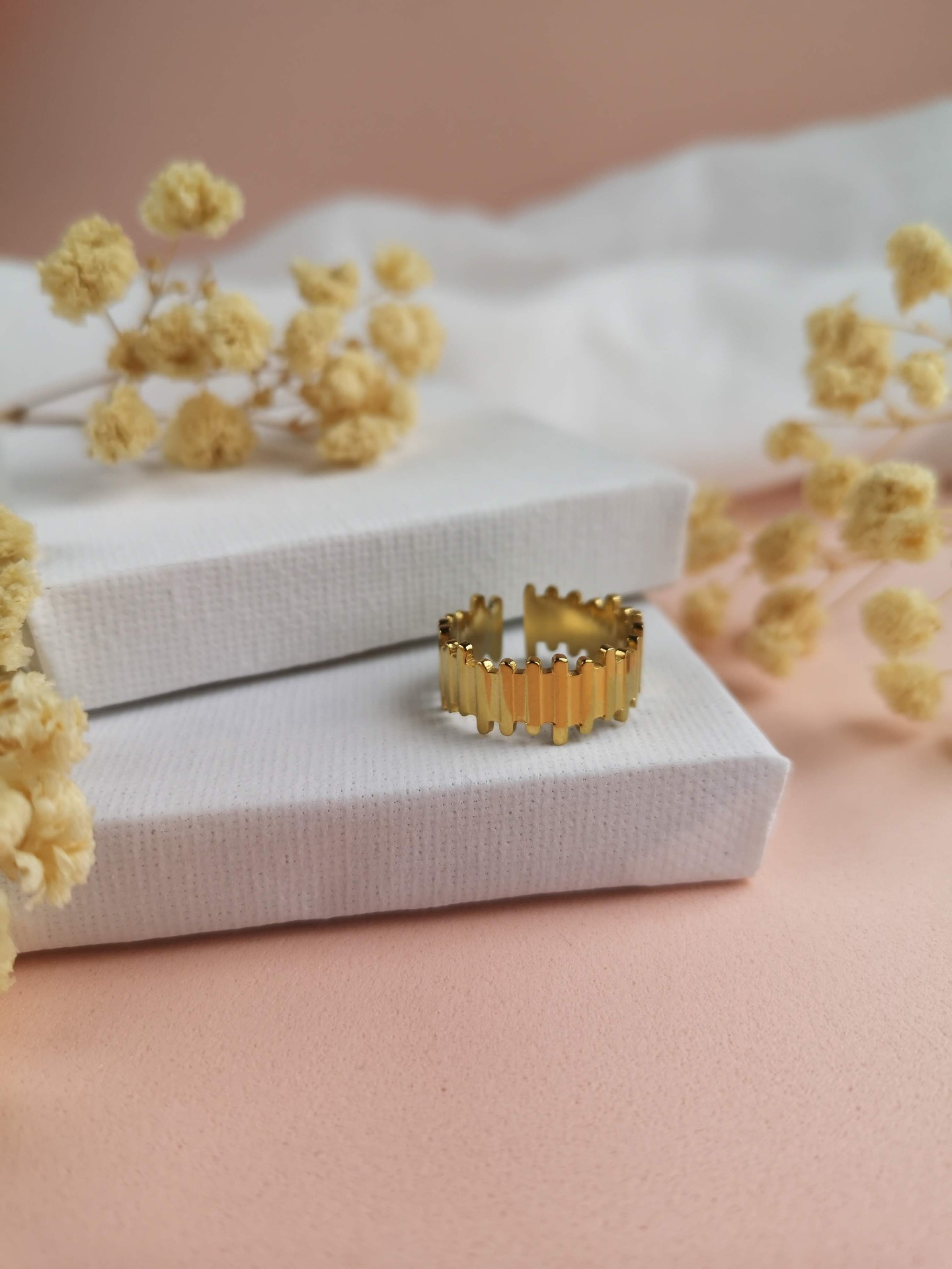 Anel ajustável em aço inóxidável dourado garantindo um encaixe confortável em diferentes tamanhos de dedo.