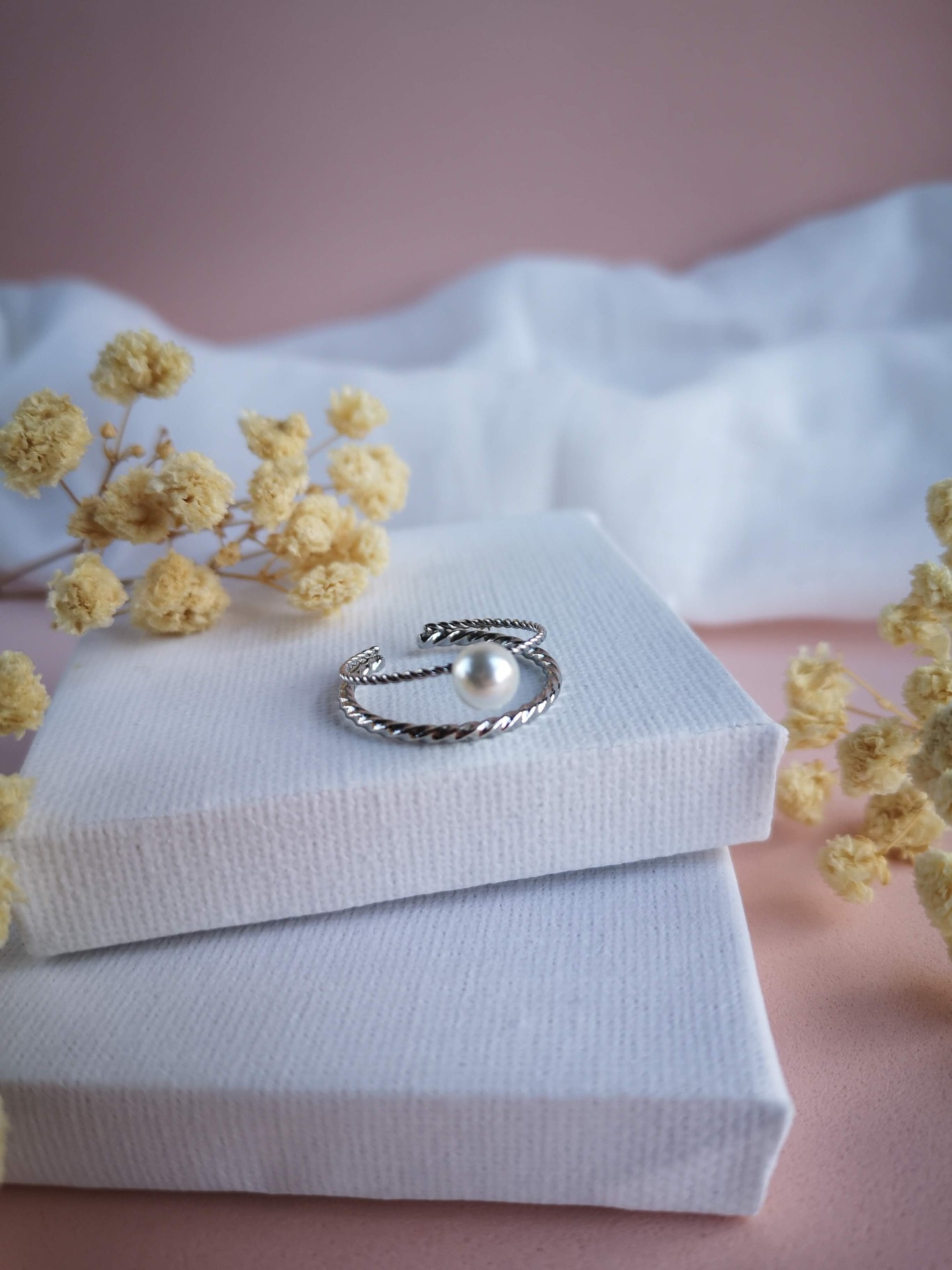 Anel com uma pérola, ajustável em aço inóxidável prateado garantindo um encaixe confortável em diferentes tamanhos de dedo.