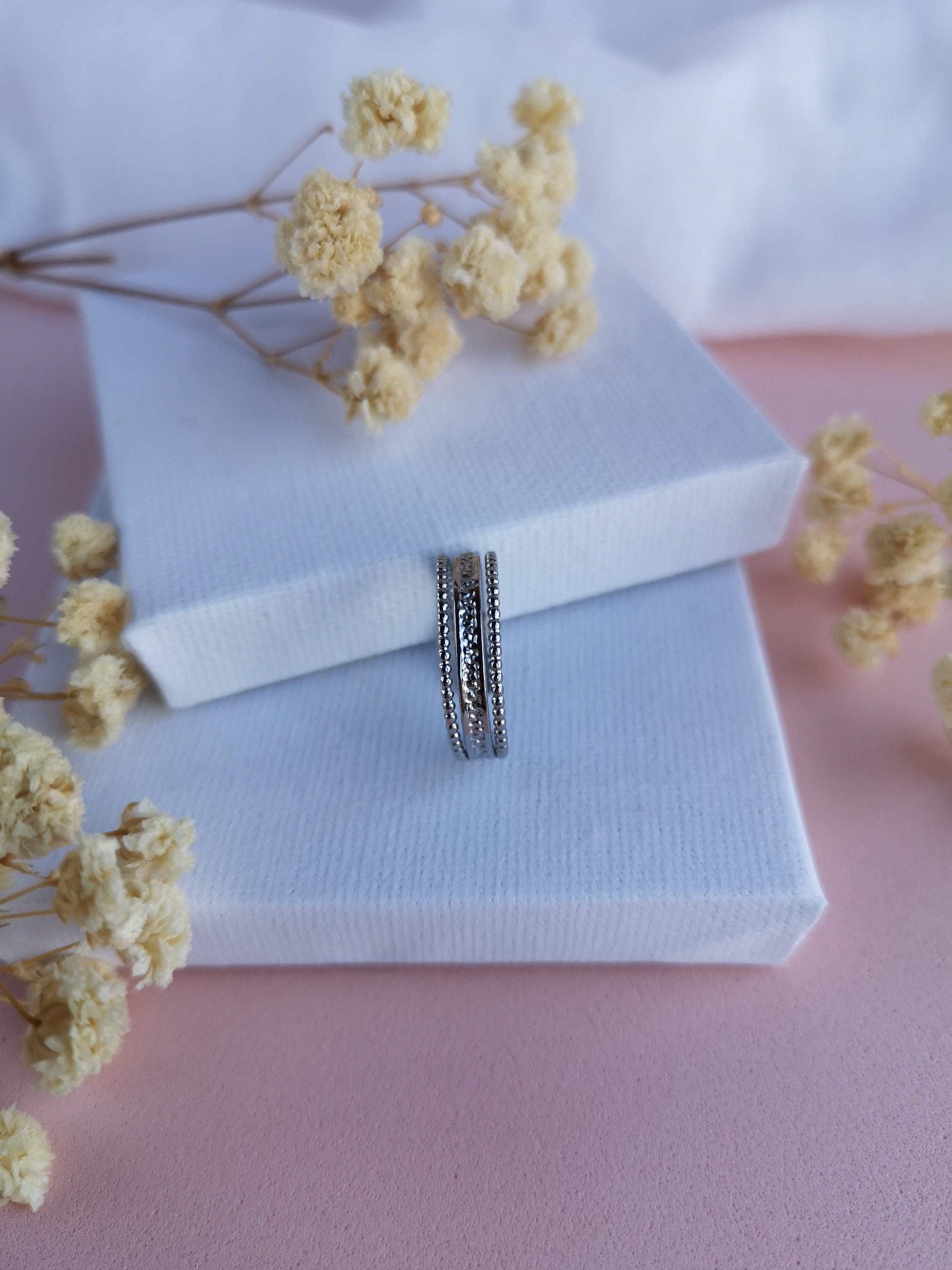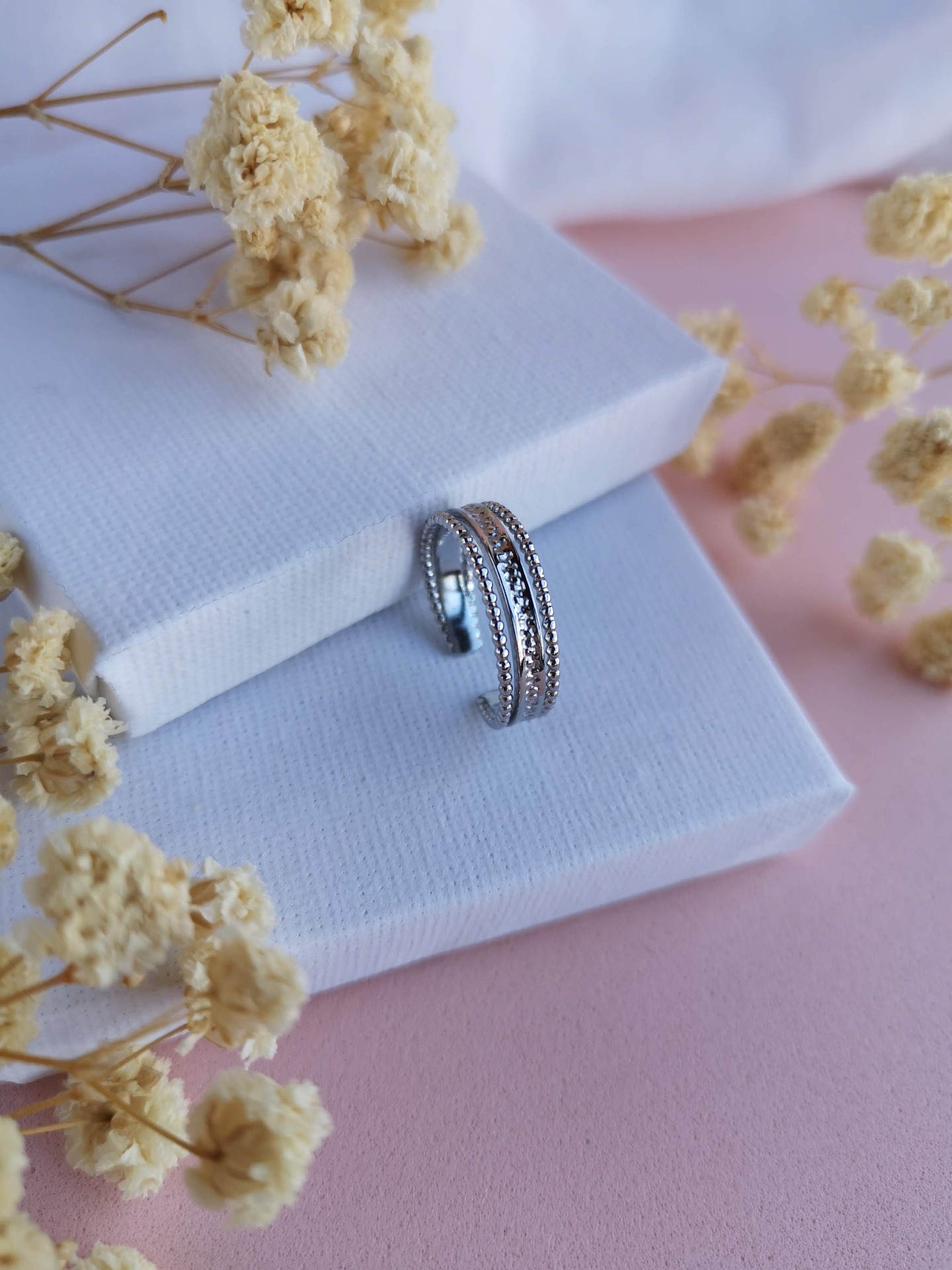 Anel ajustável em aço inoxidável prateado, com aplicação de zircônias brancas que acrescentam brilho e cor à peça.