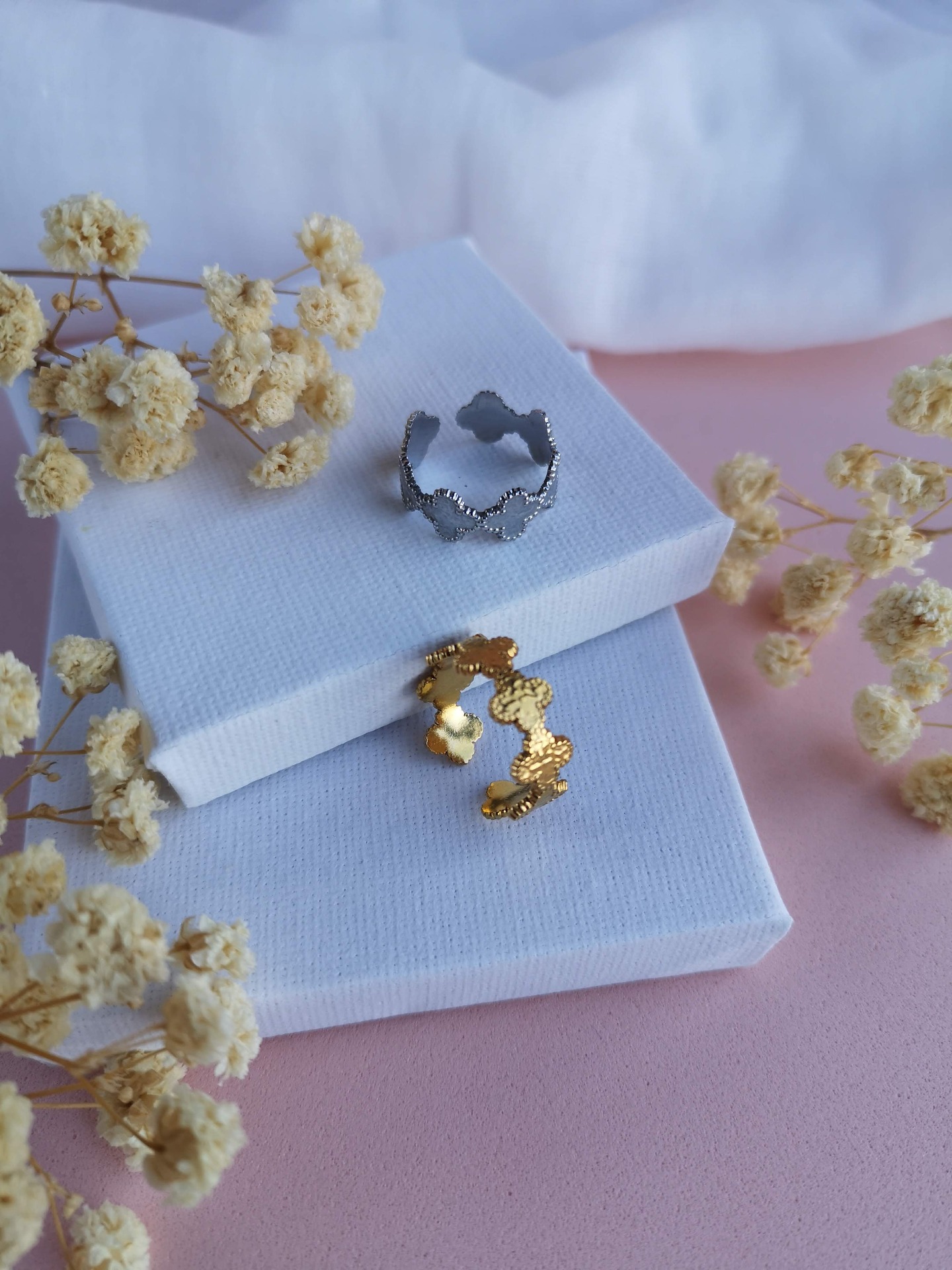 Anel ajustável em aço inóxidável garantindo um encaixe confortável em diferentes tamanhos de dedo.