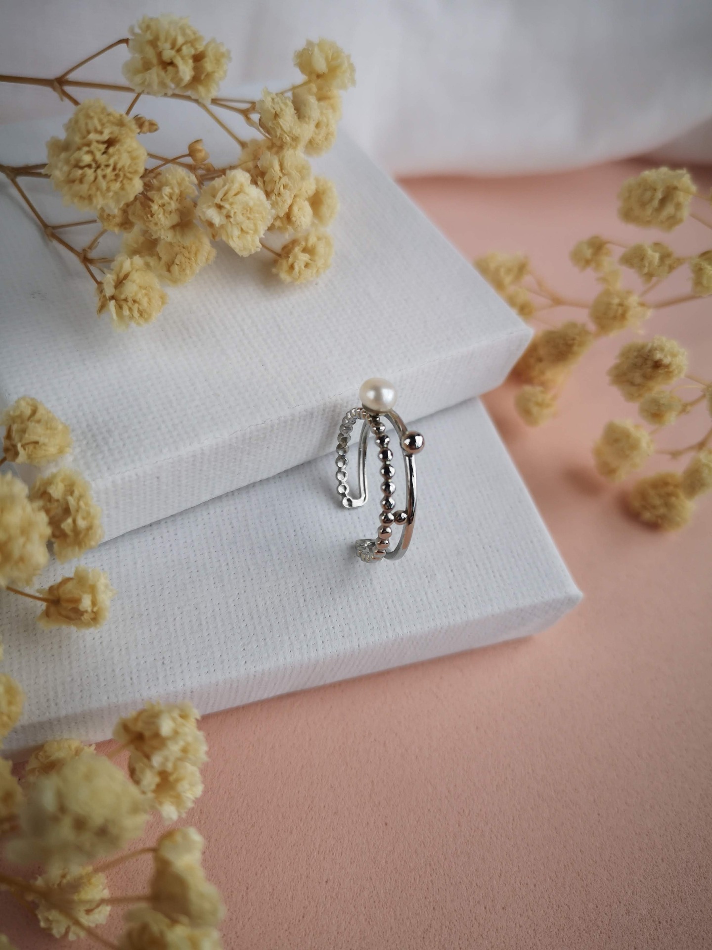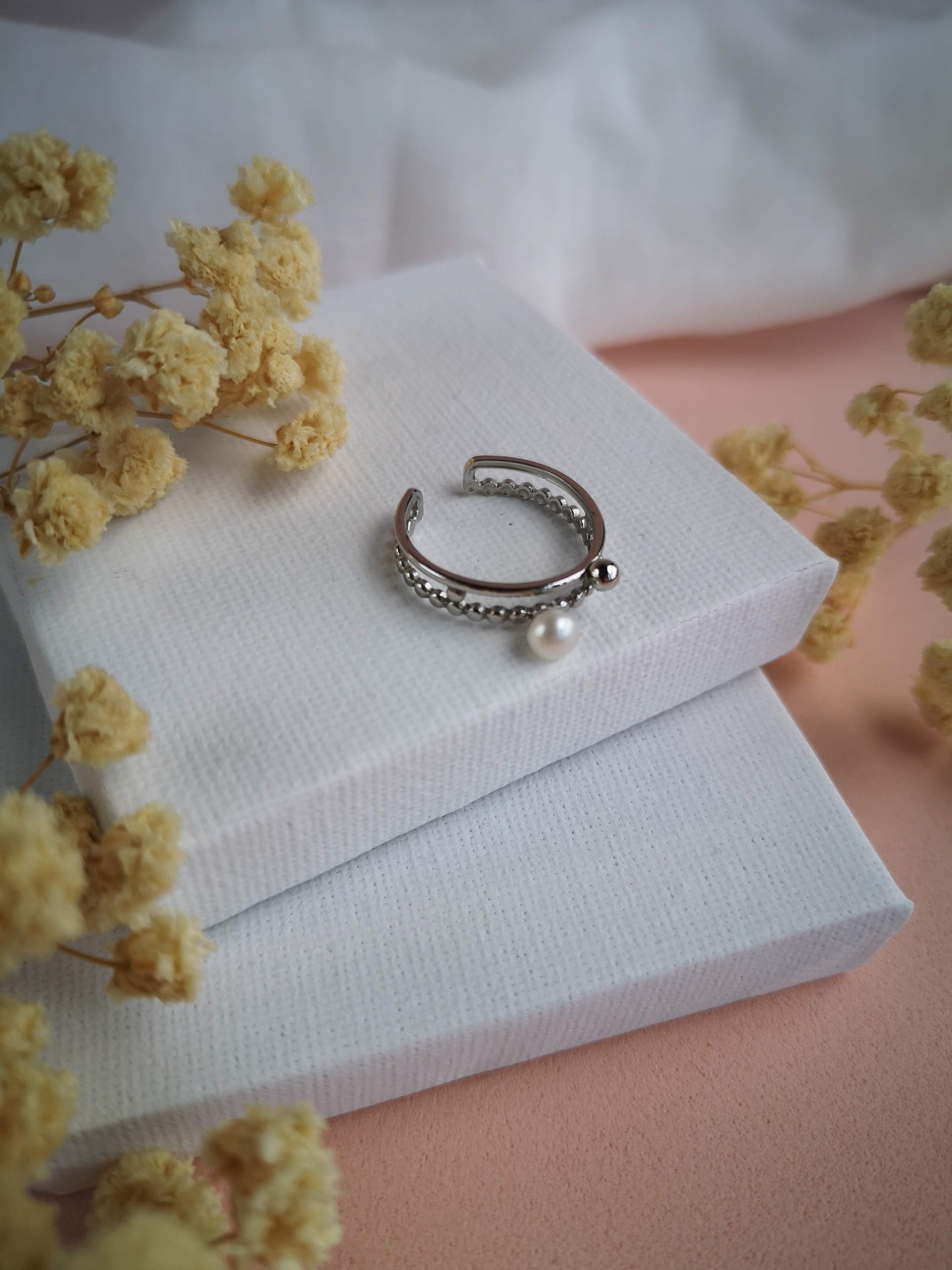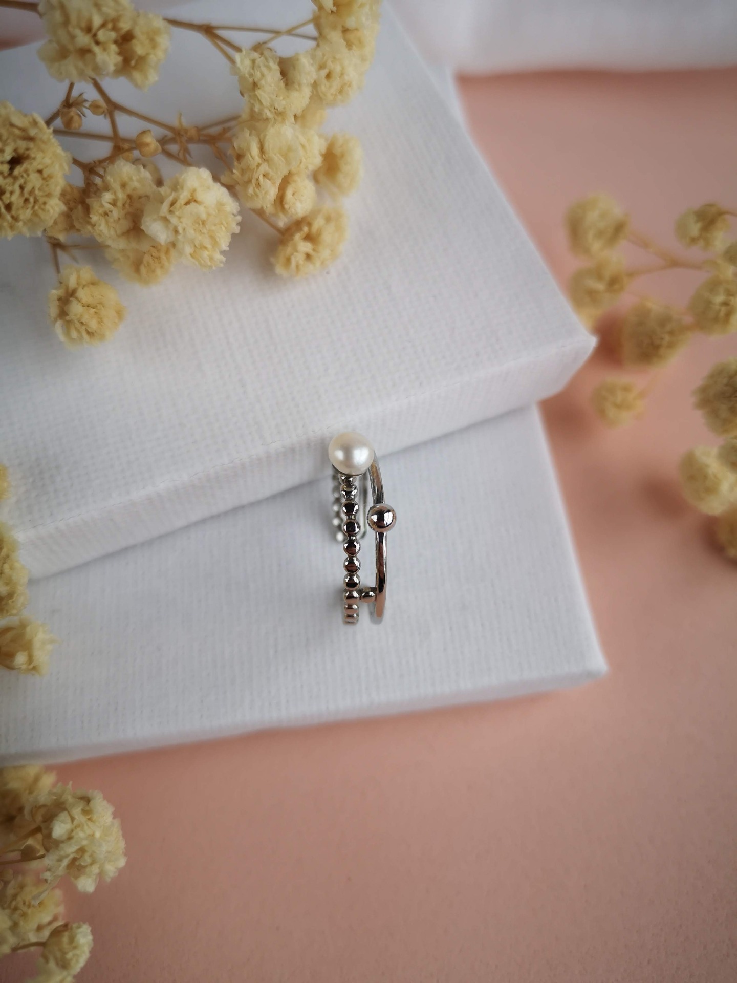 Anel com uma pérola, ajustável em aço inóxidável prateado garantindo um encaixe confortável em diferentes tamanhos de dedo.