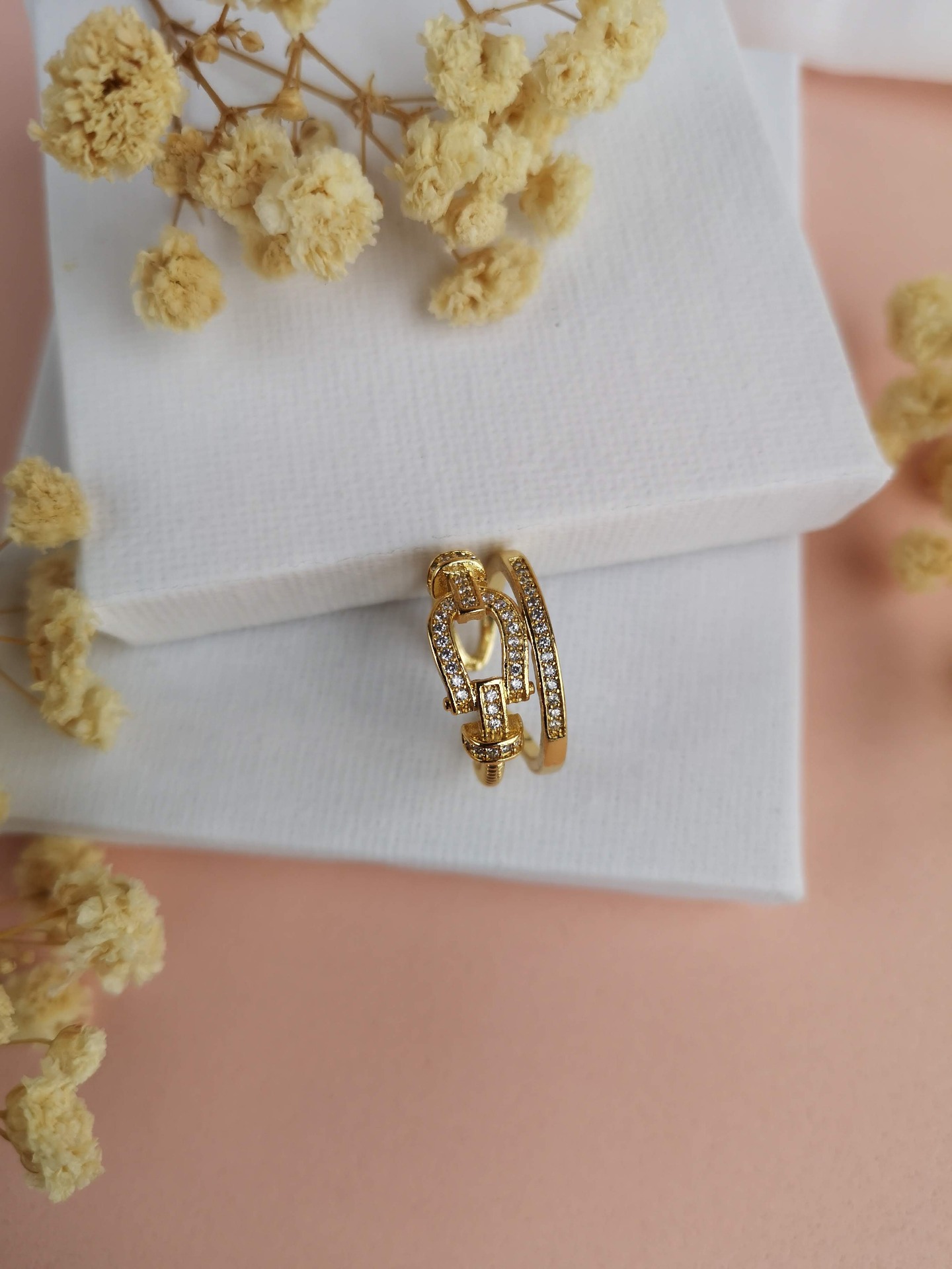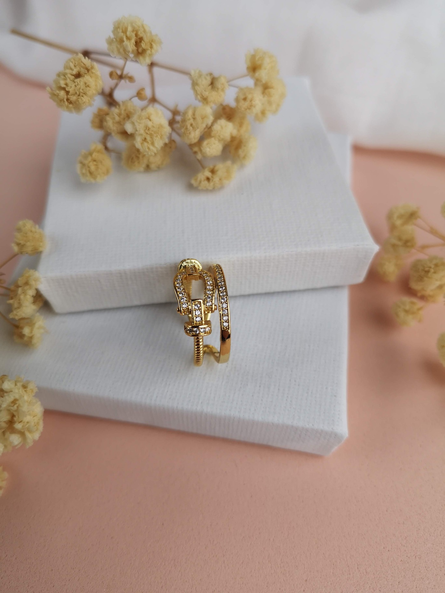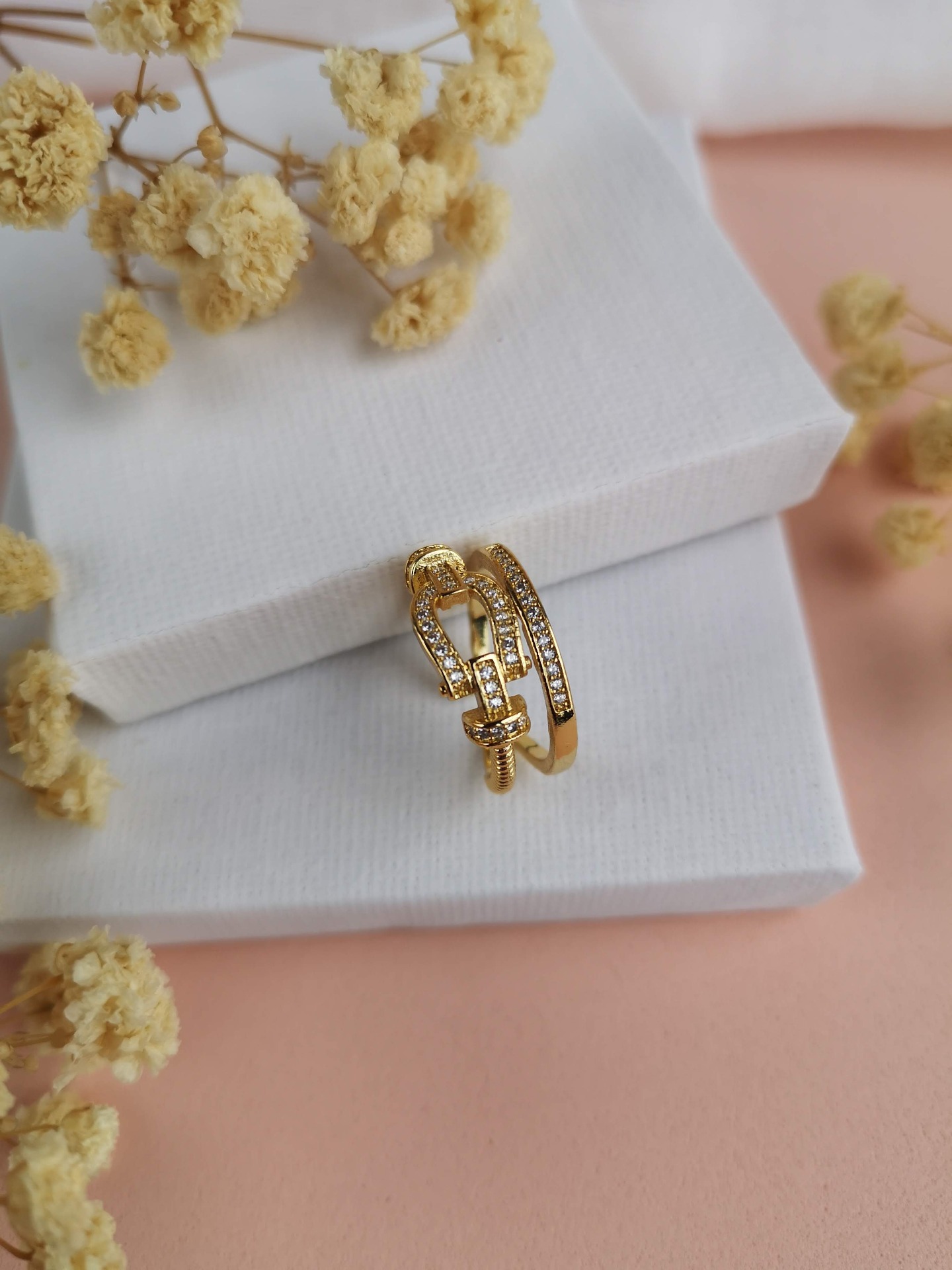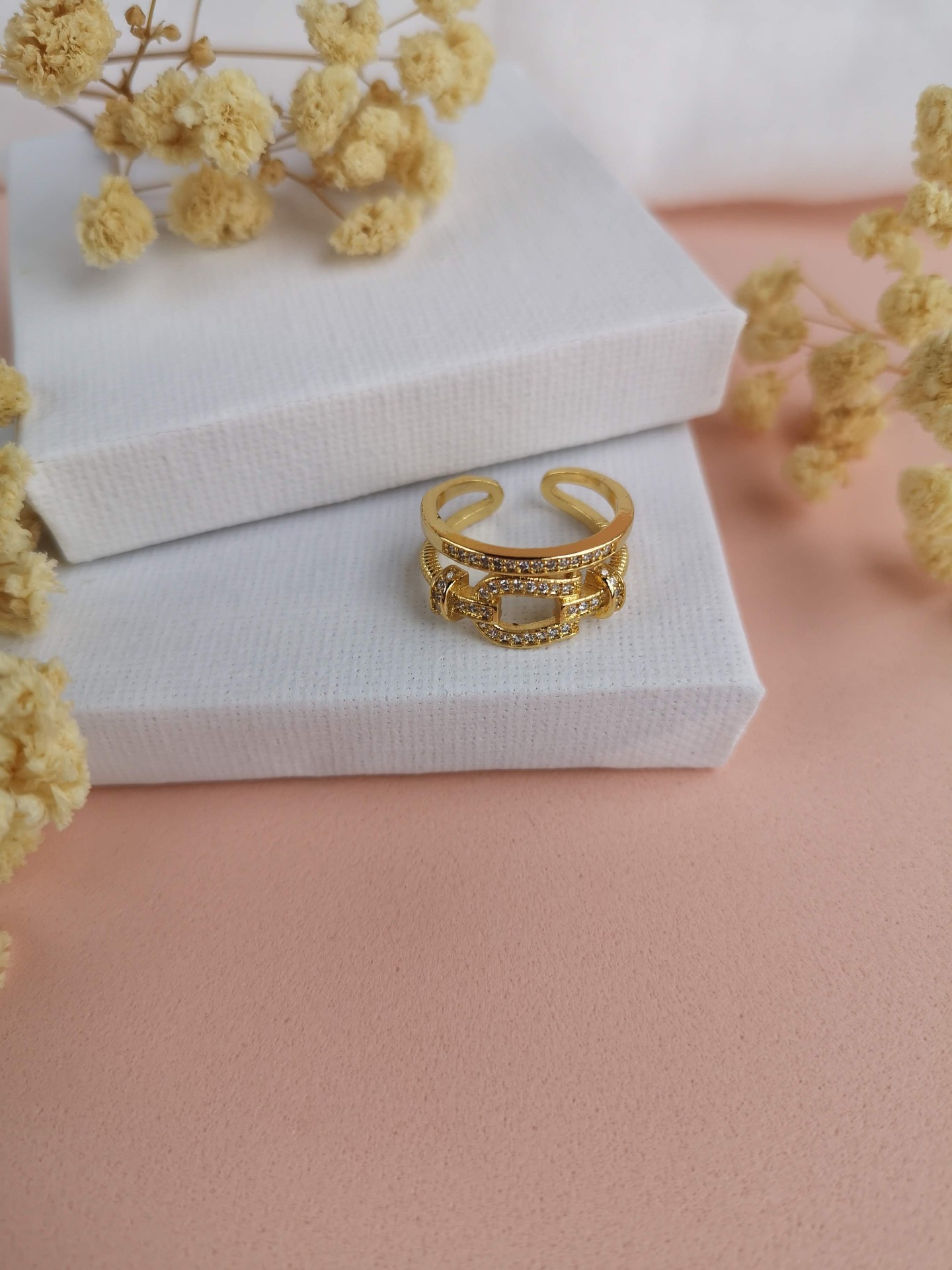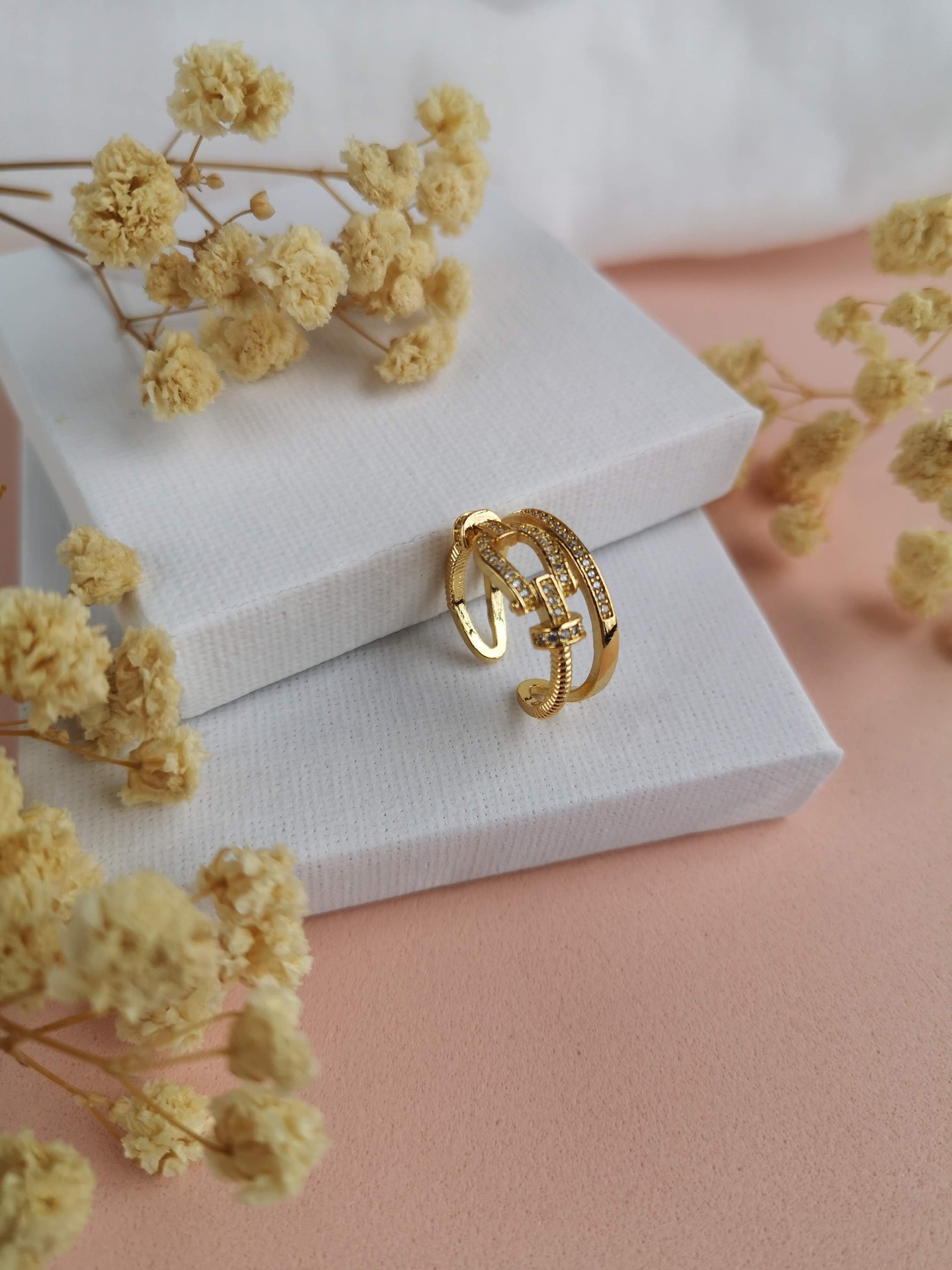Anel com zircónias brancas, ajustável em aço inóxidável dourado garantindo um encaixe confortável em diferentes tamanhos de dedo.