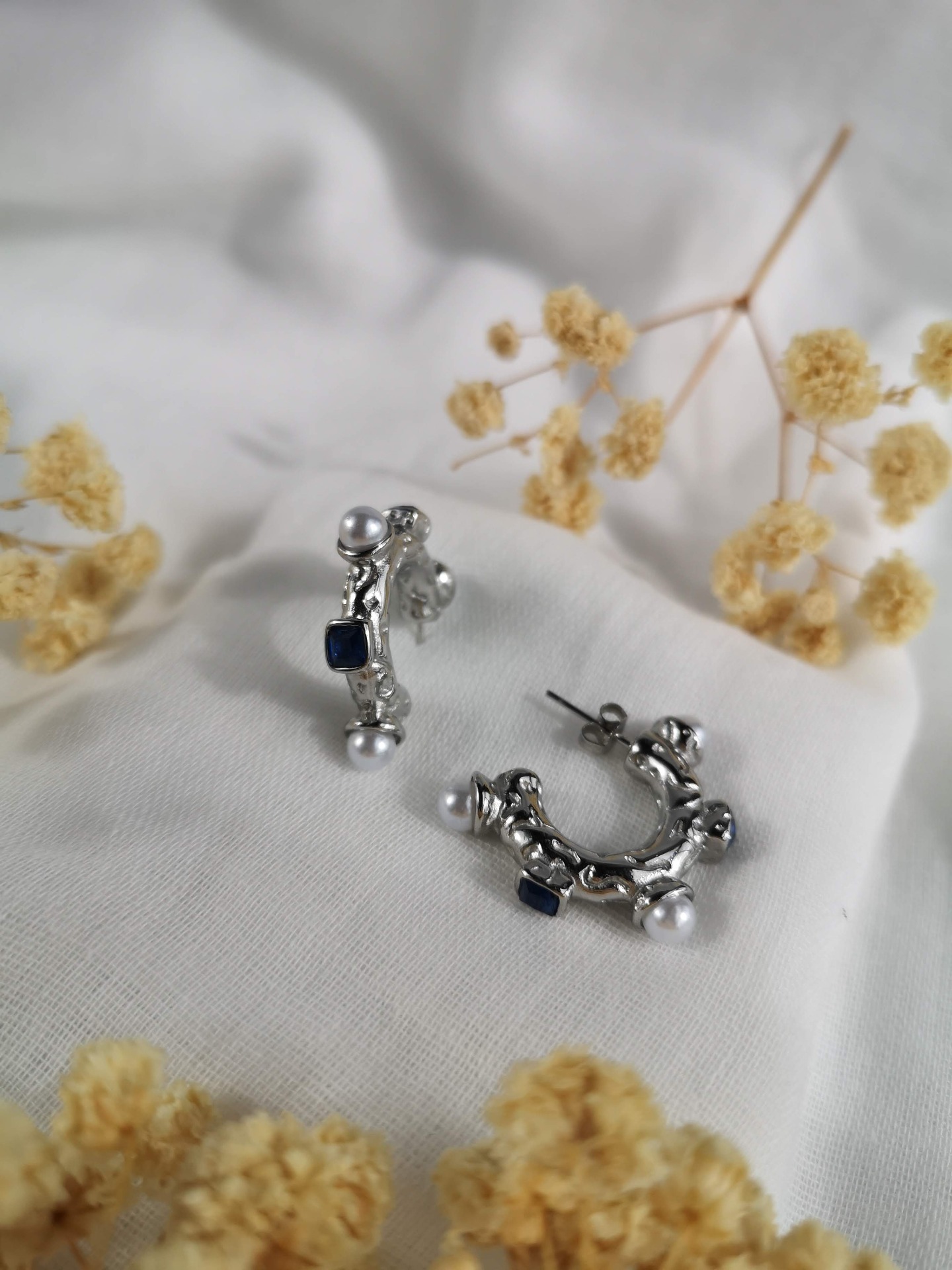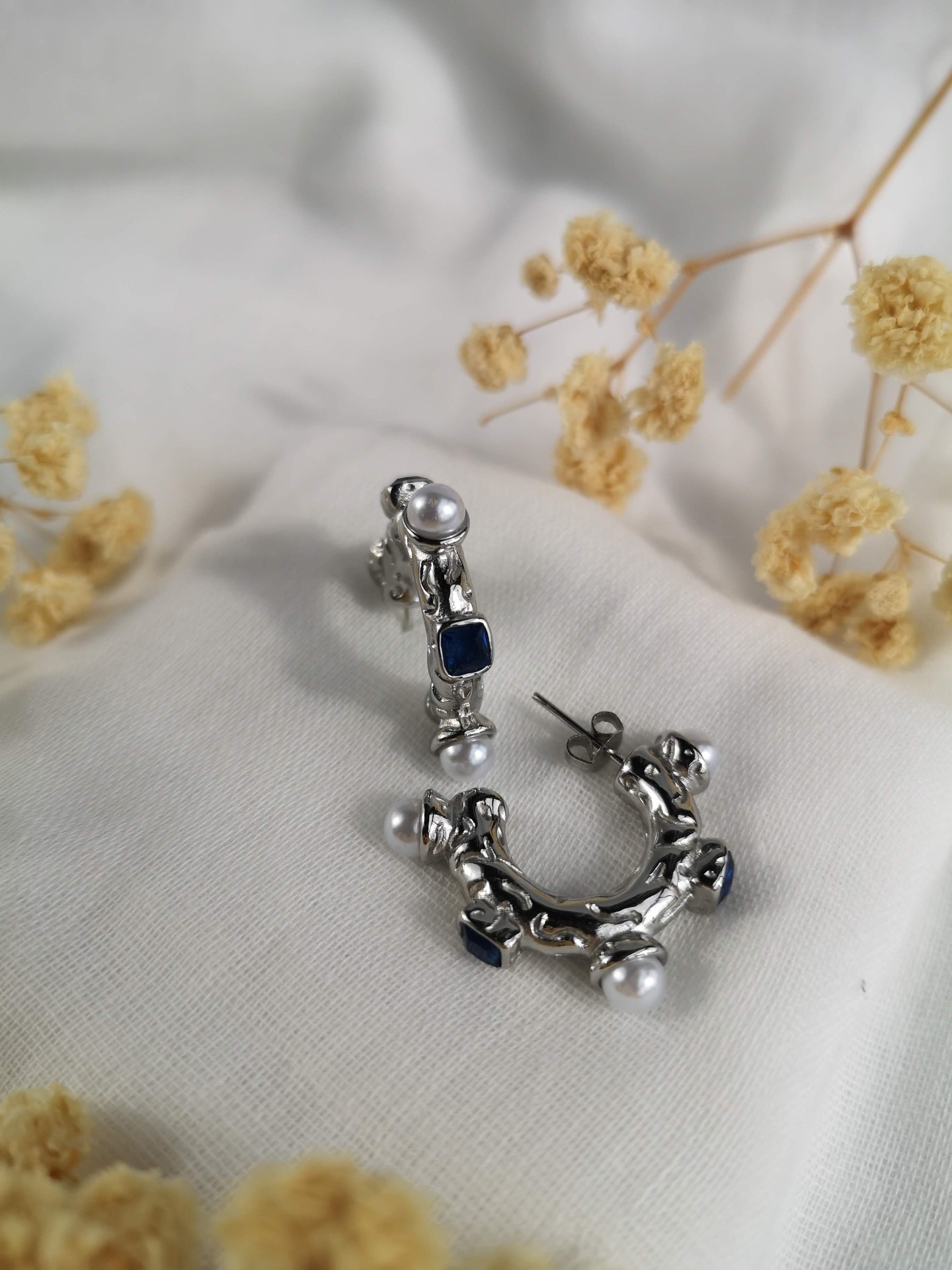 Argolas em aço inoxidável prateado com pérolas e brilhantes azul.