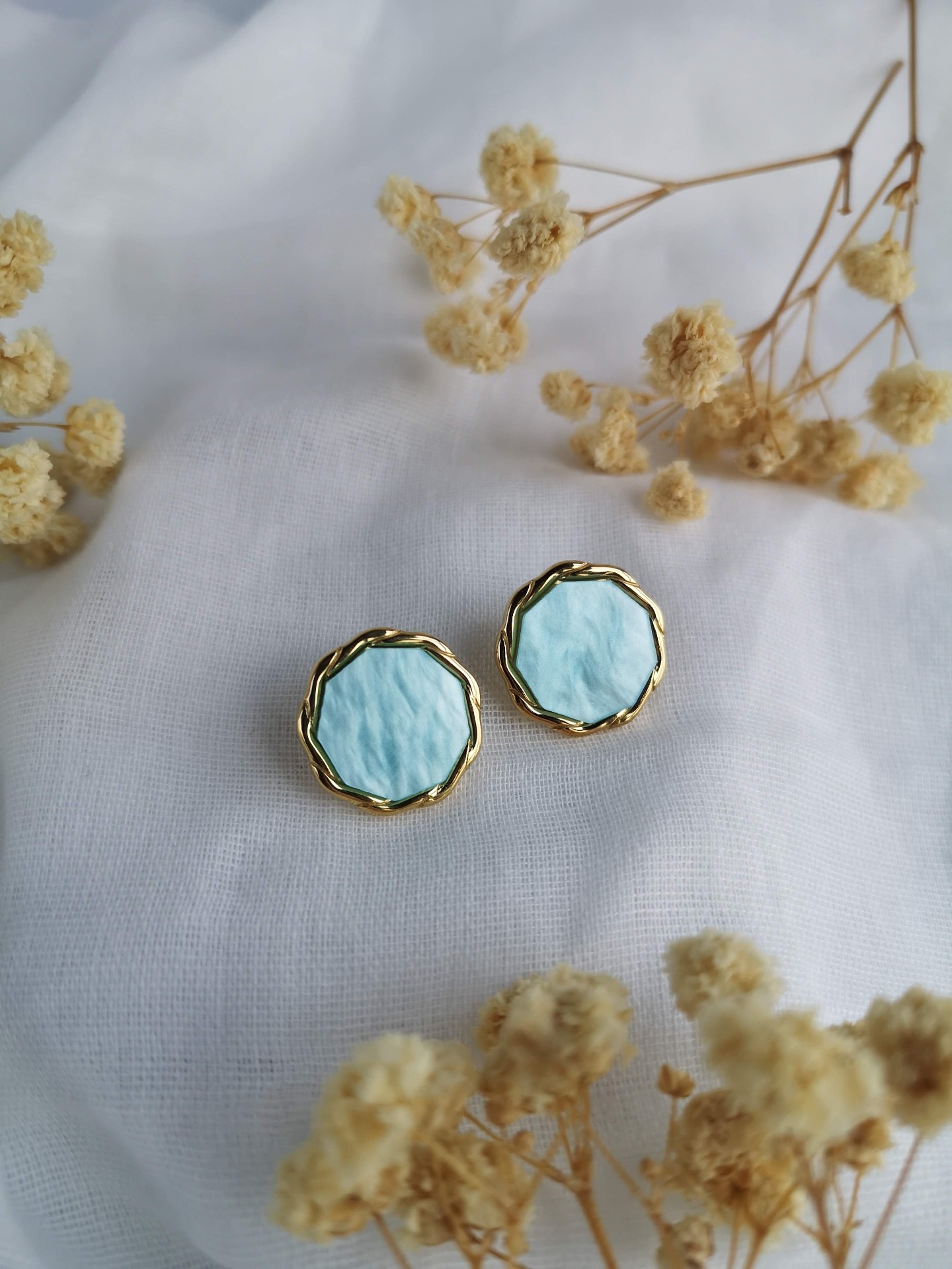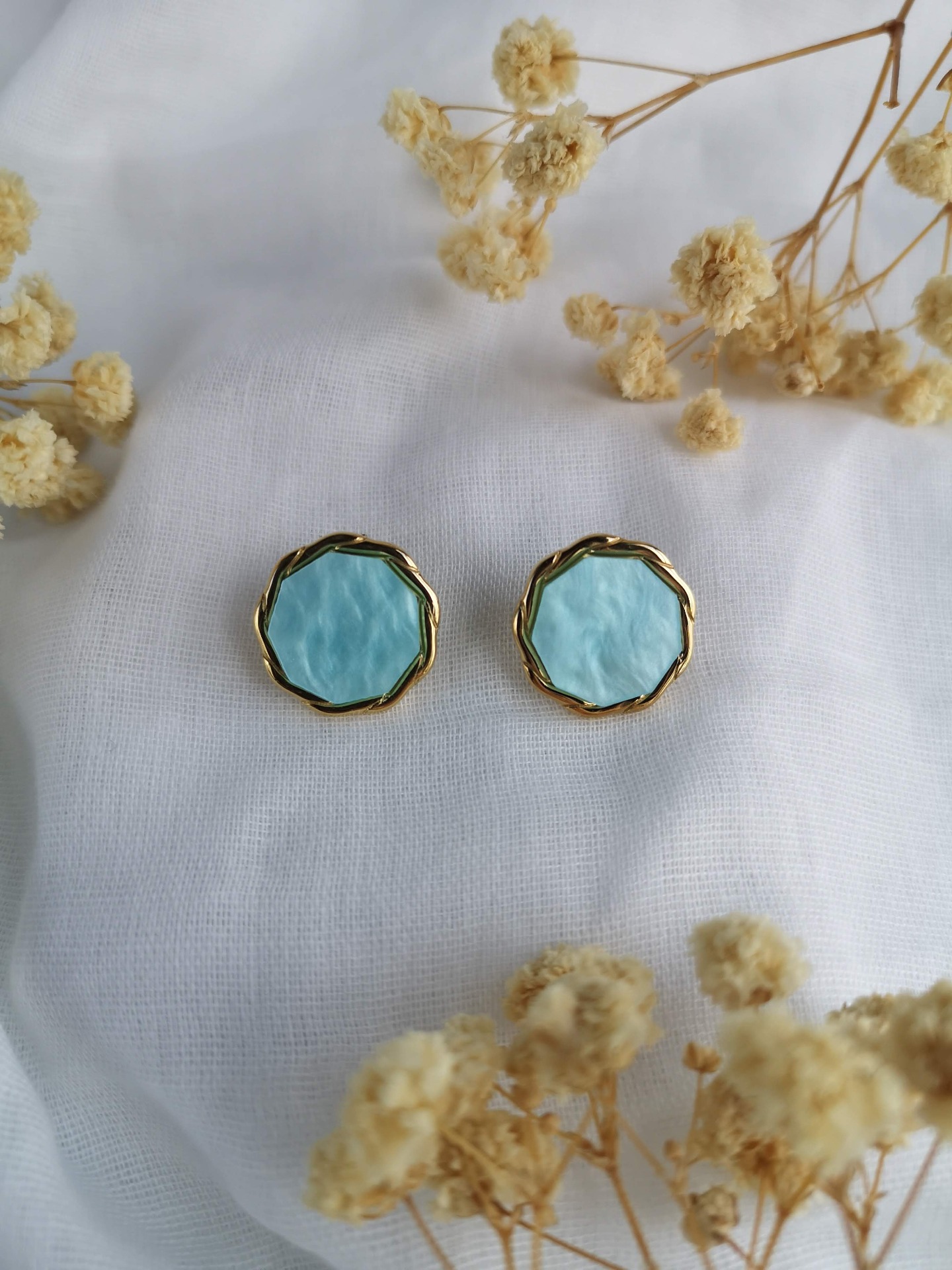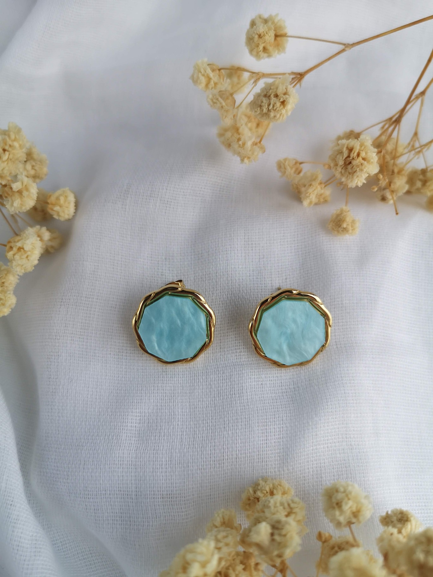 Brincos em aço inoxidável dourado com madrepérola azul água.