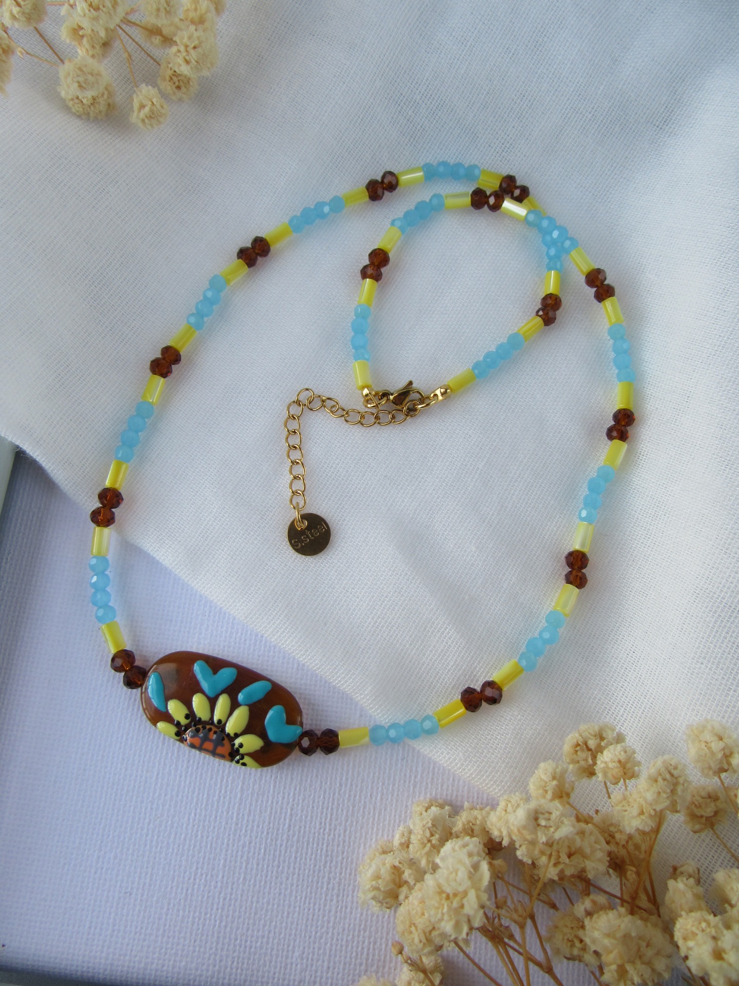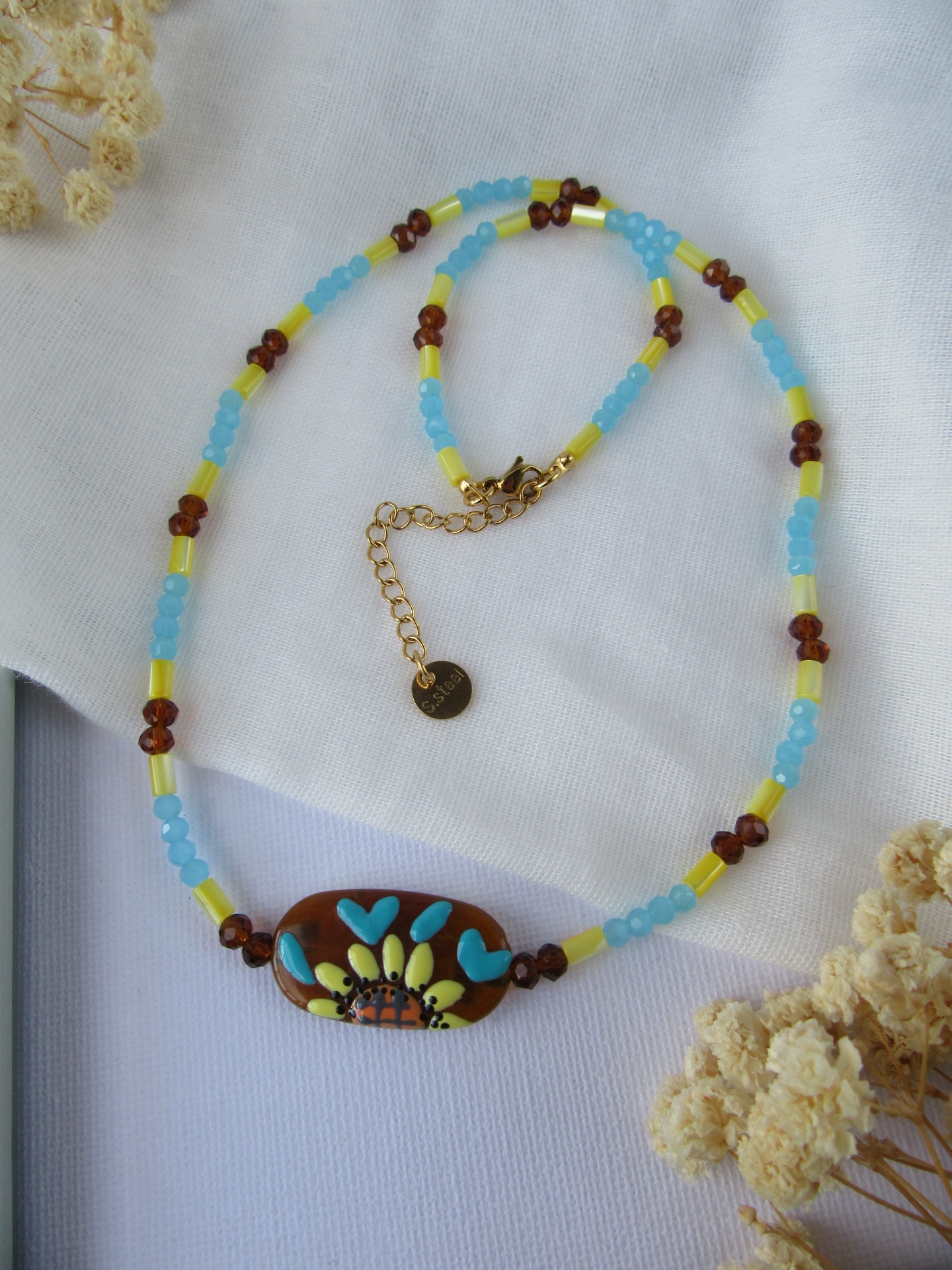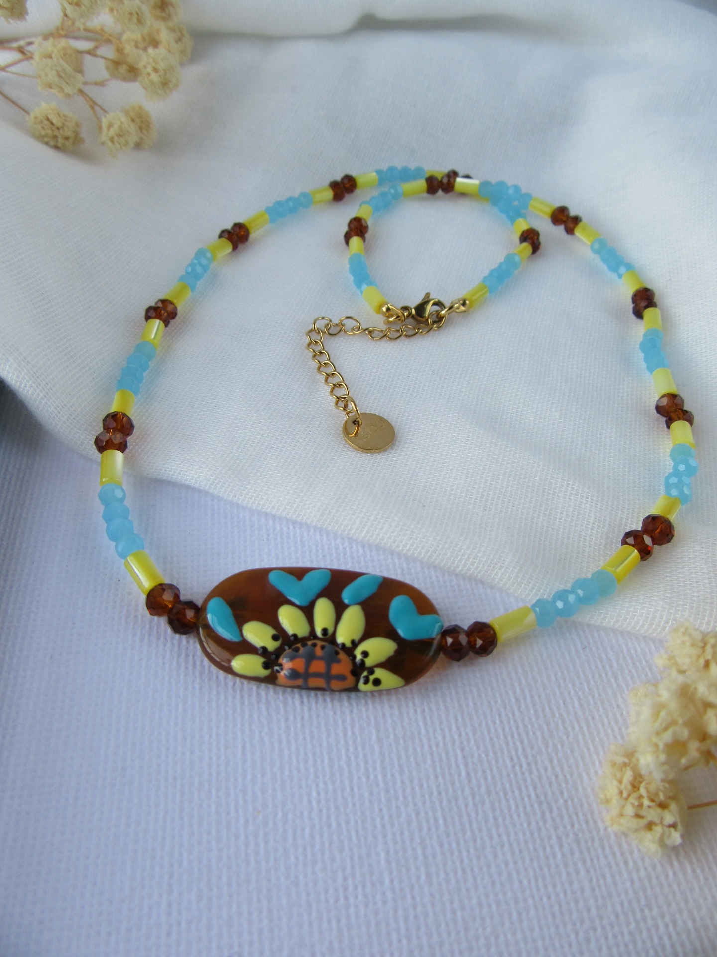 Colar feito à mão com cristais facetados castanho, azul claro e tubinhos amarelos, com medalha oval acrílica, e com terminais de fecho e com extensor de 5 cm em aço inoxidável dourados garatindo o ajuste perfeito, a durabilidade e o conforto.