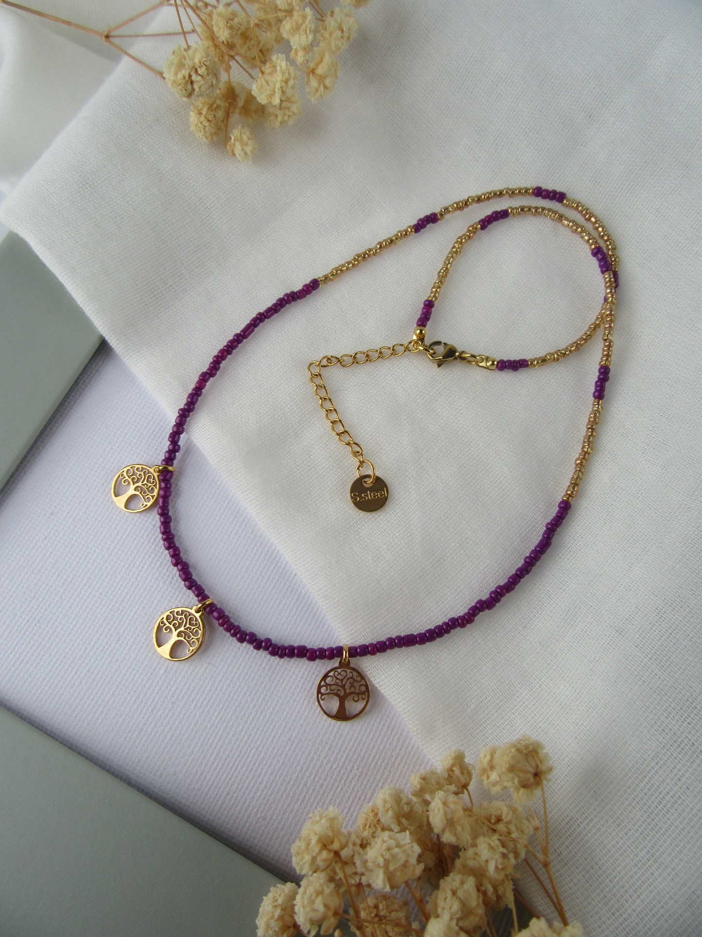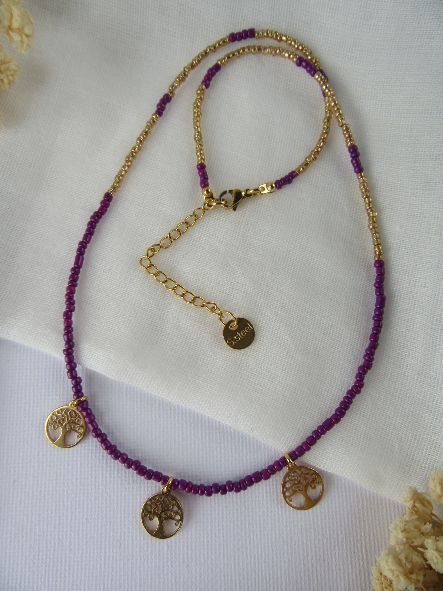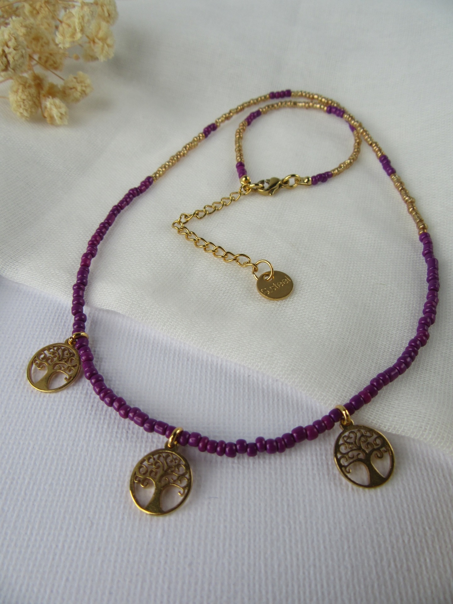 Colar feito à mão com missangas roxas e douradas, com medalhinhas árvore da vida douradas, e com terminais de fecho e com extensor de 5 cm em aço inoxidável dourados garatindo o ajuste perfeito, a durabilidade e o conforto.