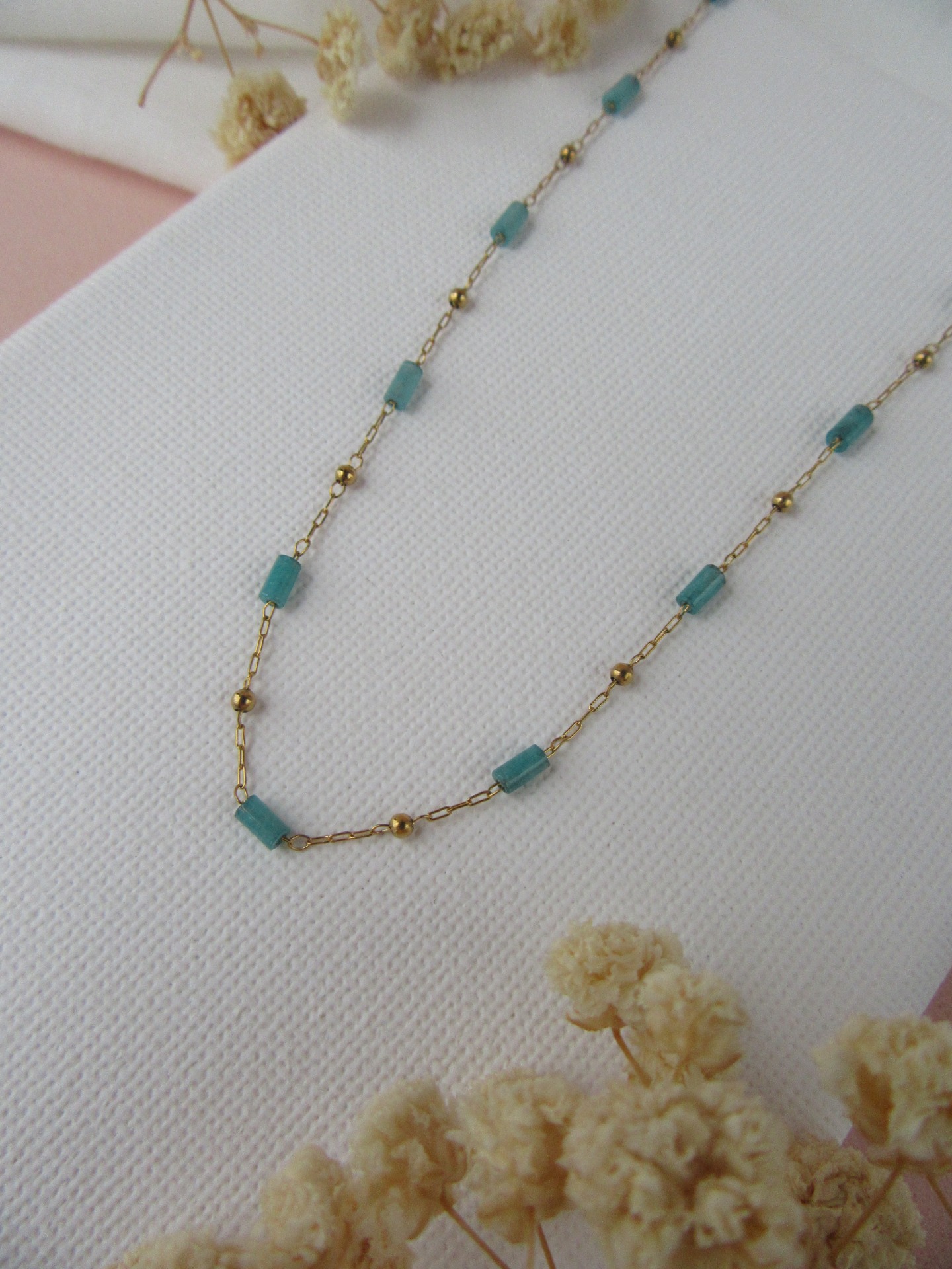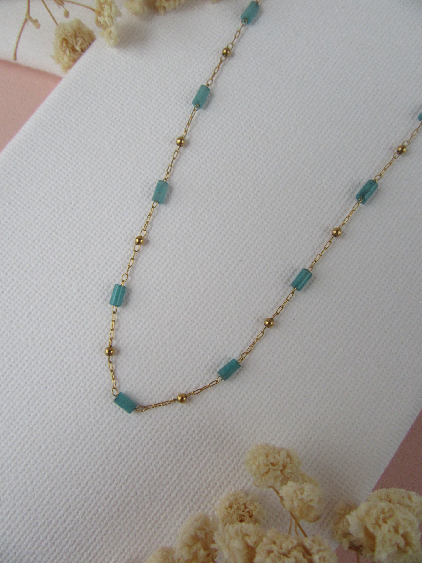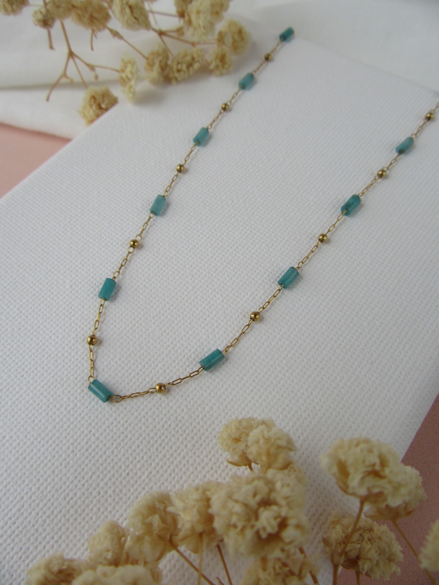 Colar simples em aço inoxidável dourado com detalhe em azul turquesa e com extensor de 5 cm garatindo o ajuste perfeito, a durabilidade e o conforto.
