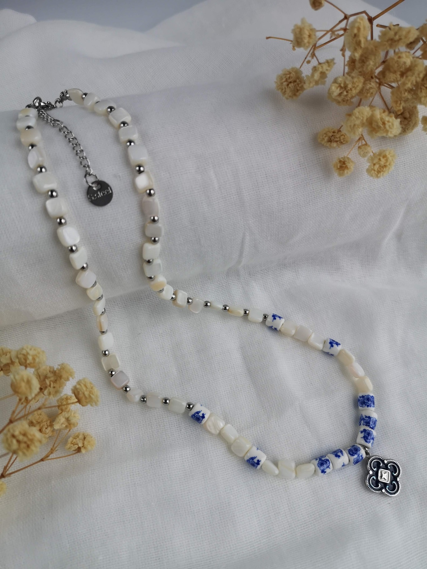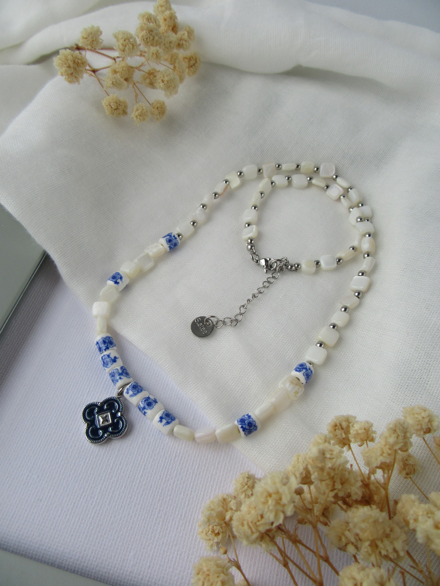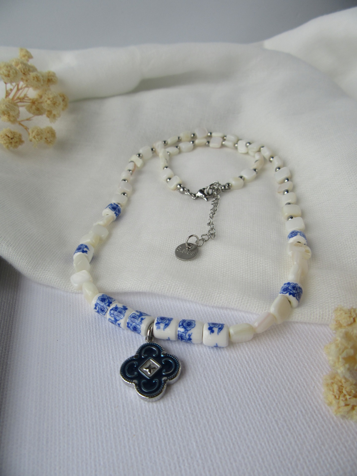Colar feito à mão com madrepérola em forma de quadrado, com detalhes florais azuis e medalha azul em aço inoxidável, e com terminais de fecho e com extensor de 5 cm em aço inoxidável prateados garatindo o ajuste perfeito, a durabilidade e o conforto.