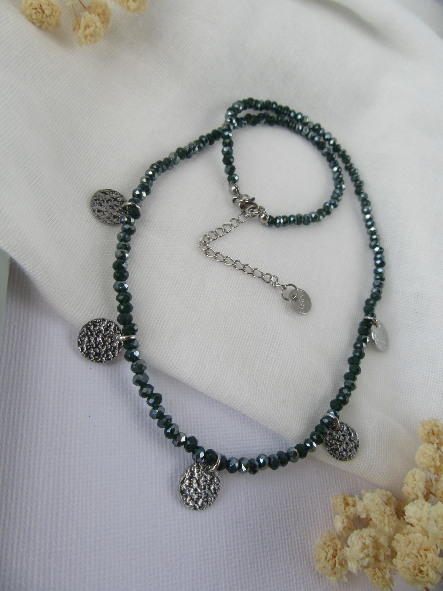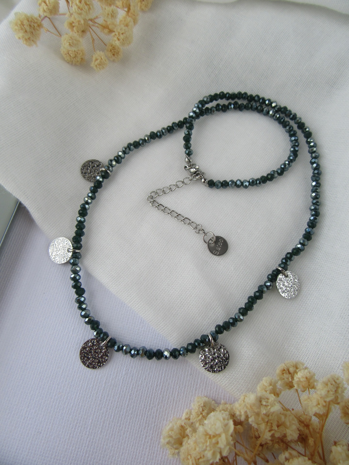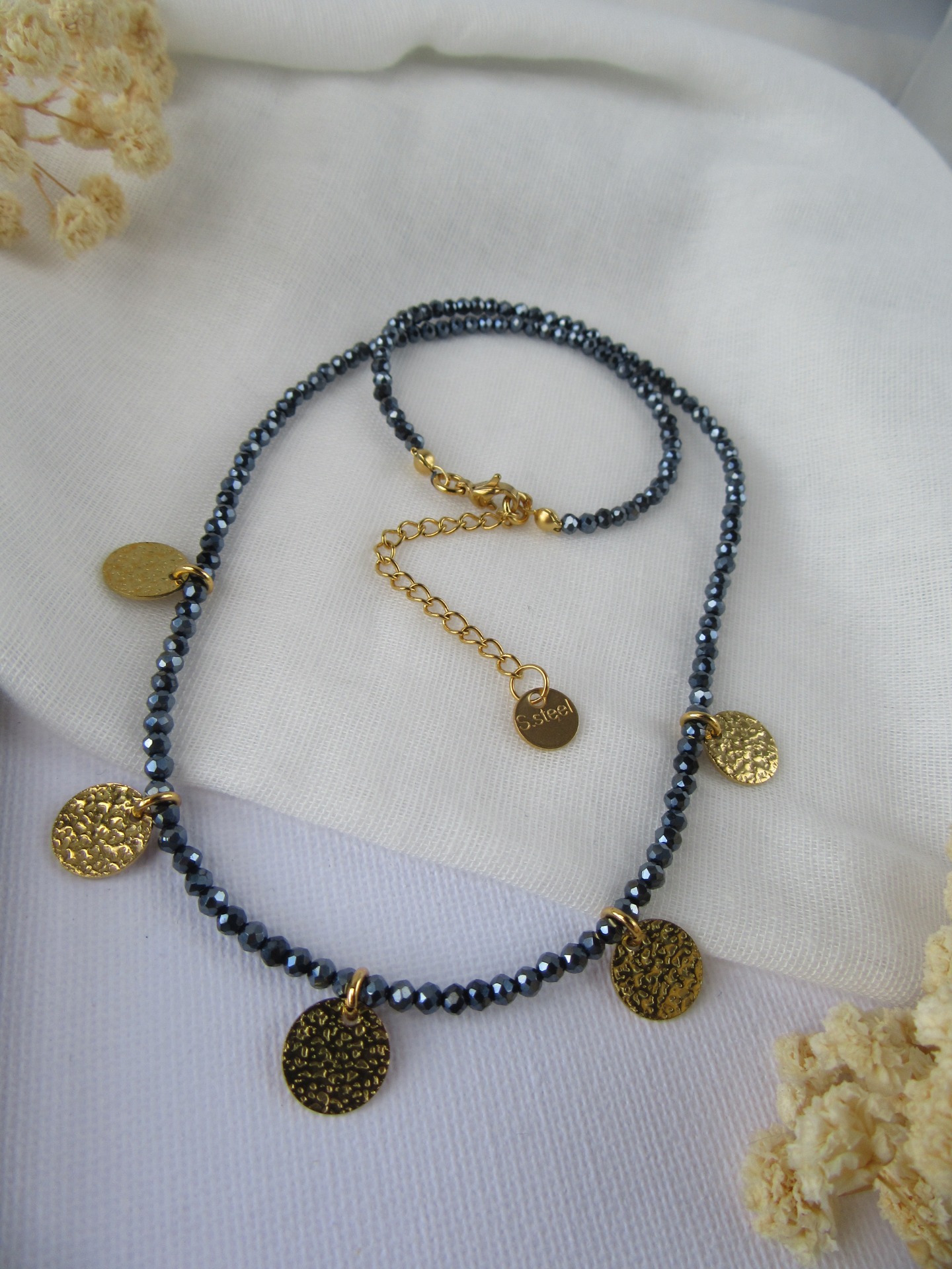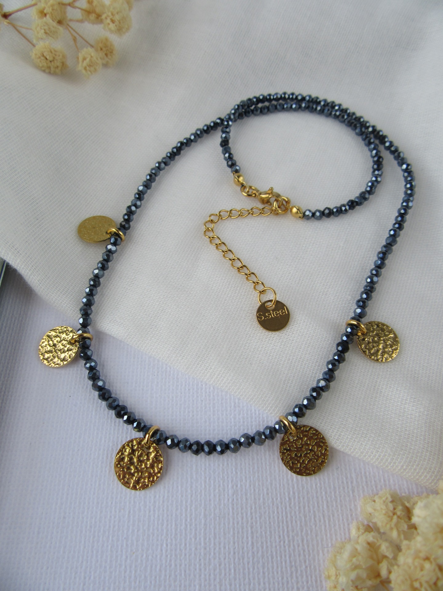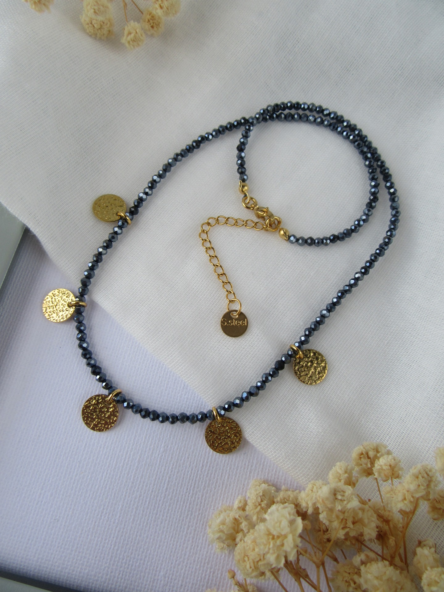 Colar feito à mão com cristais facetados azul escuro e medalhas em chapinha douradas, e com terminais de fecho e com extensor de 5 cm em aço inoxidável dourados garatindo o ajuste perfeito, a durabilidade e o conforto.