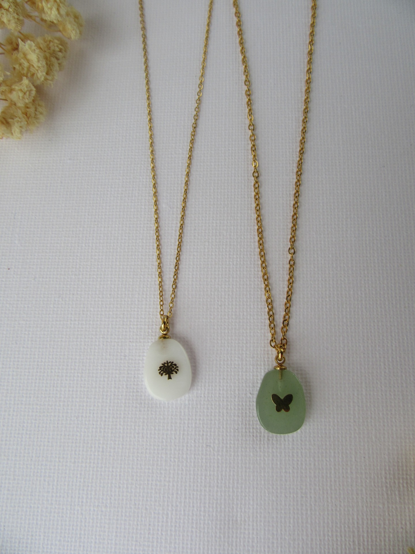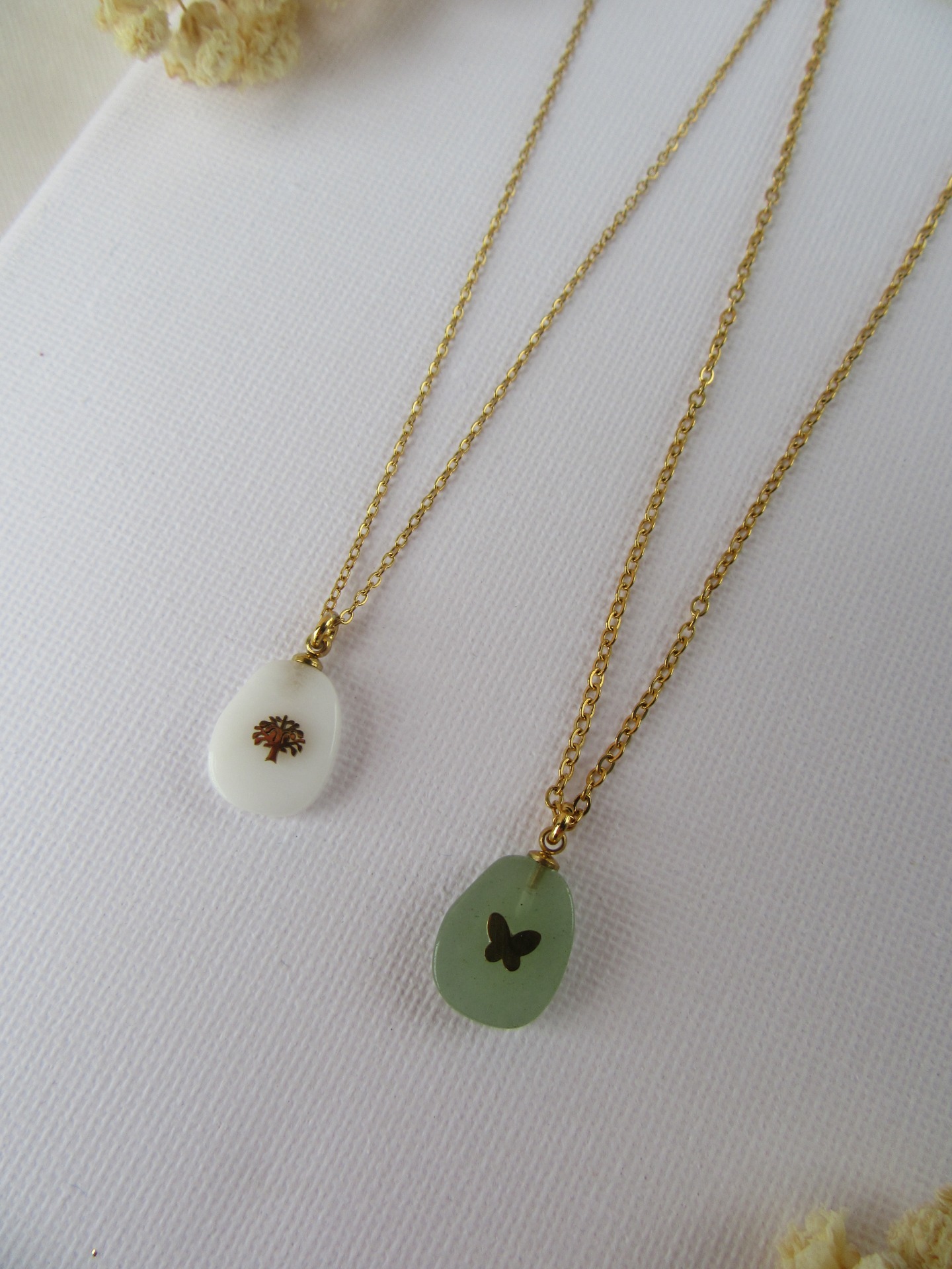 Colares simples feitos à mão em aço inoxidável dourado, com medalhas em pedra natural com detalhe dourado, e com extensor de 5 cm garatindo o
