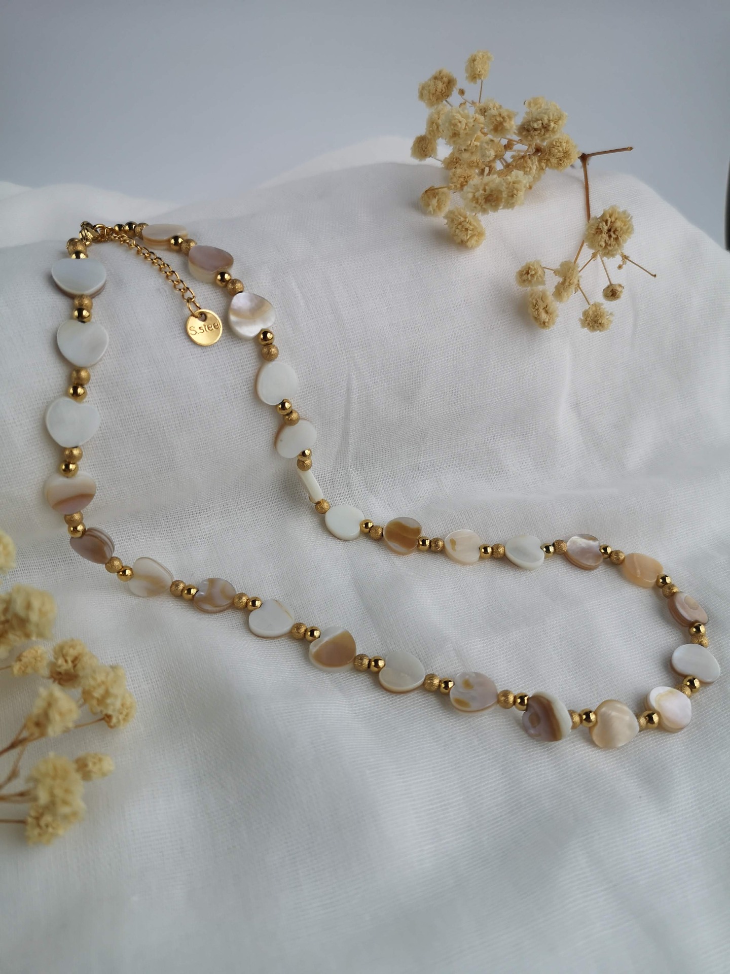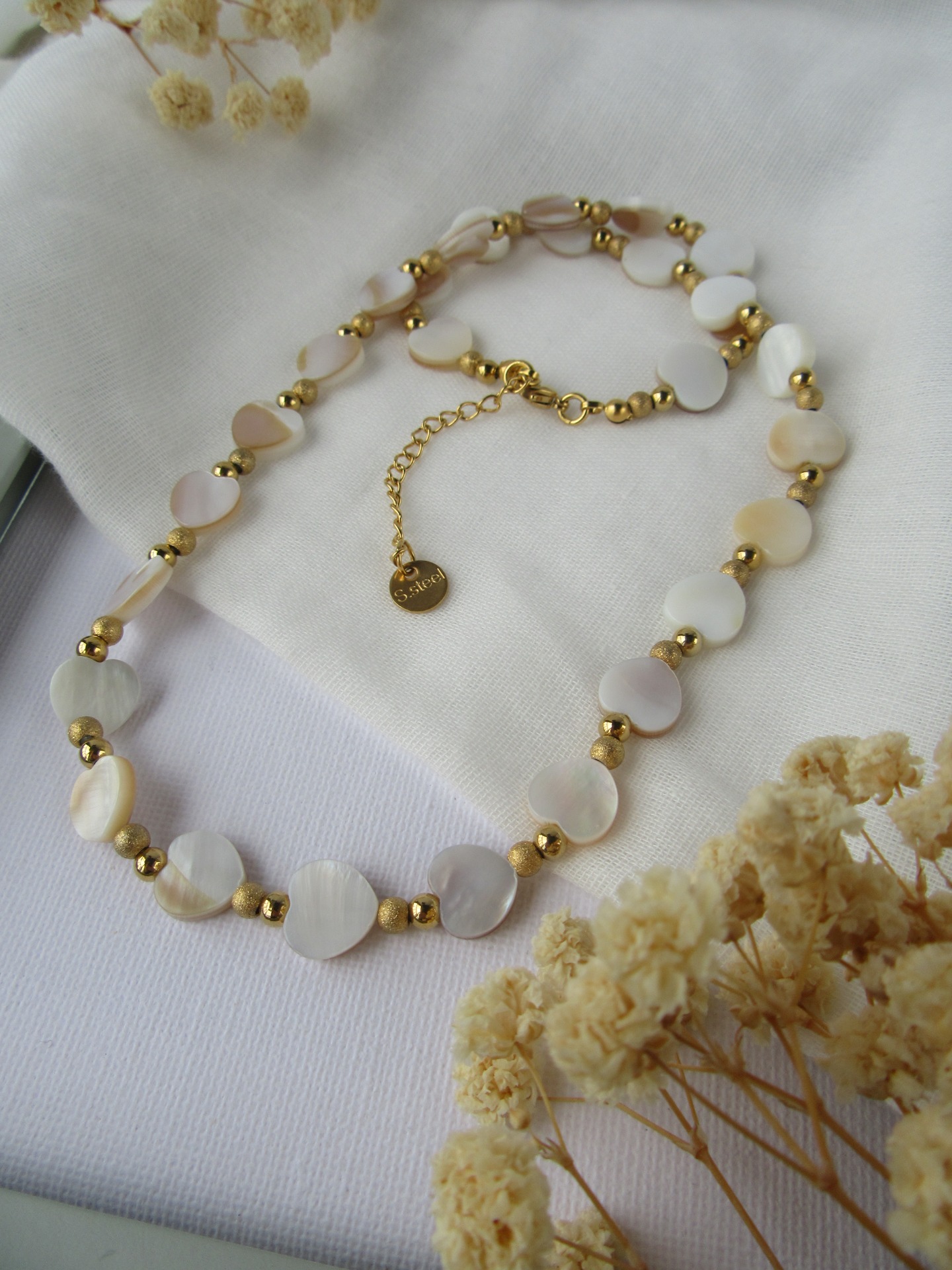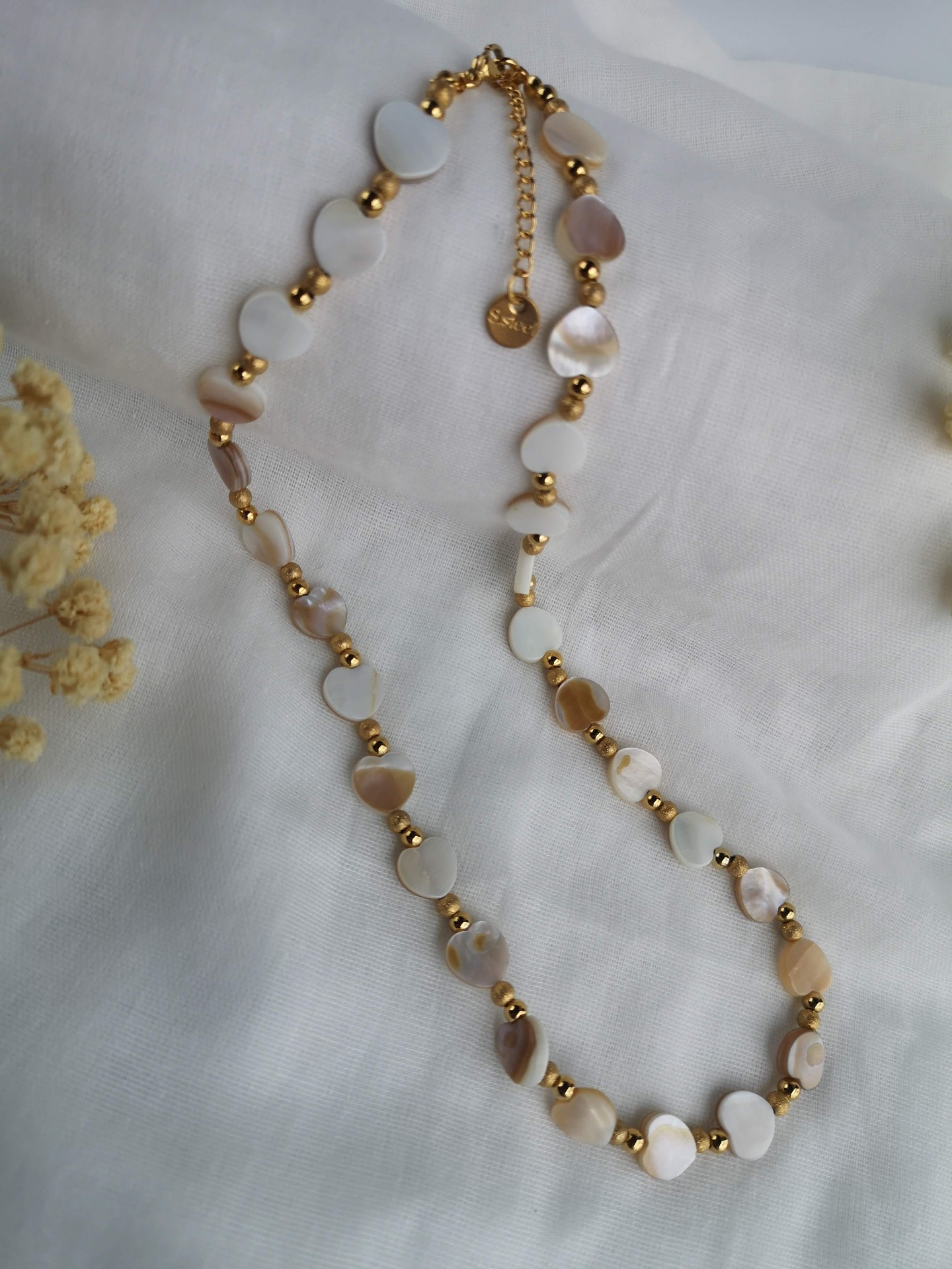 Colar feito à mão com entremeios em coração de madrepérola e com bolinhas lisas e baças douradas, e com terminais de fecho e com extensor de 5 cm em aço inoxidável dourado garatindo o ajuste perfeito, a durabilidade e o conforto.