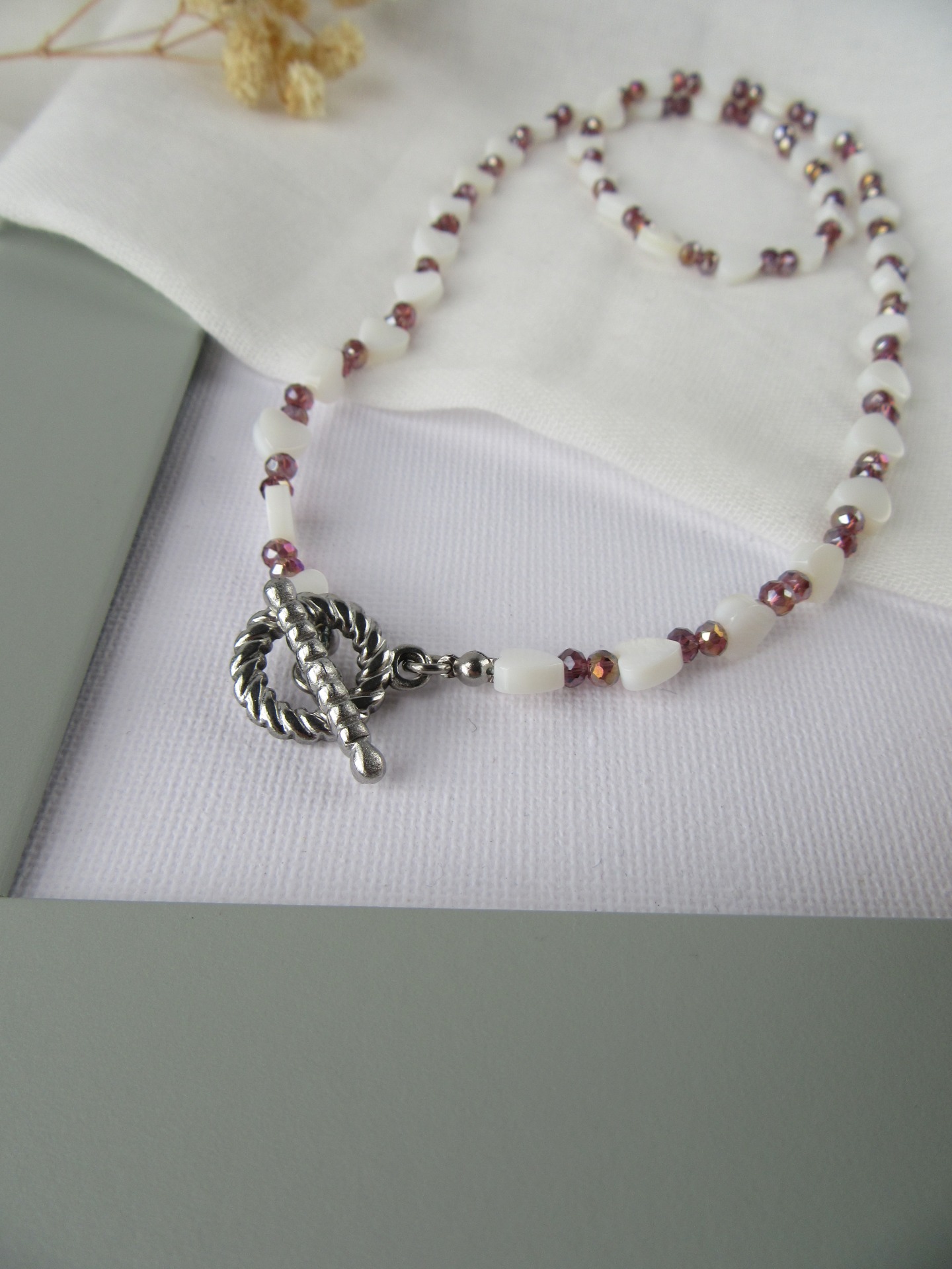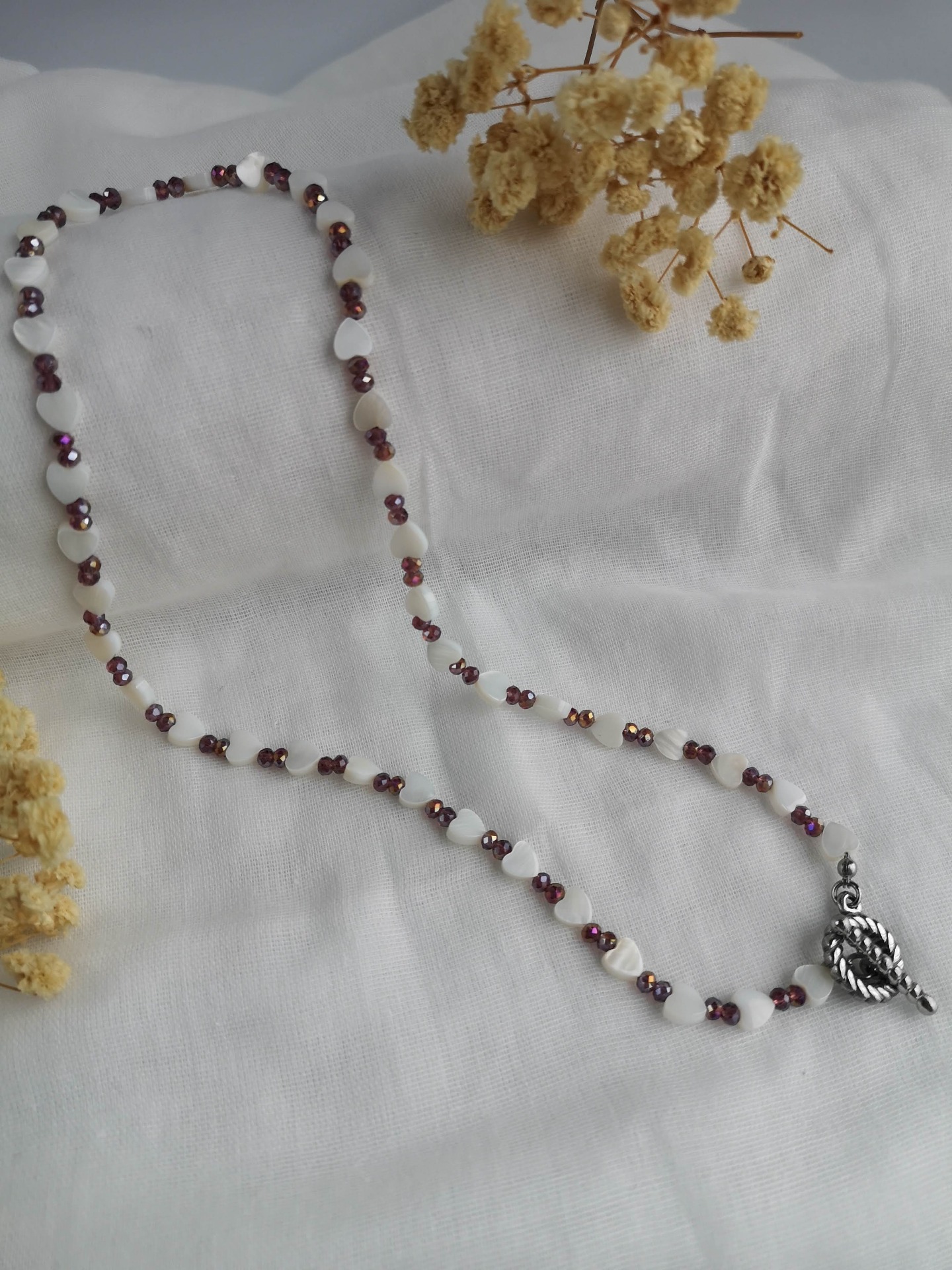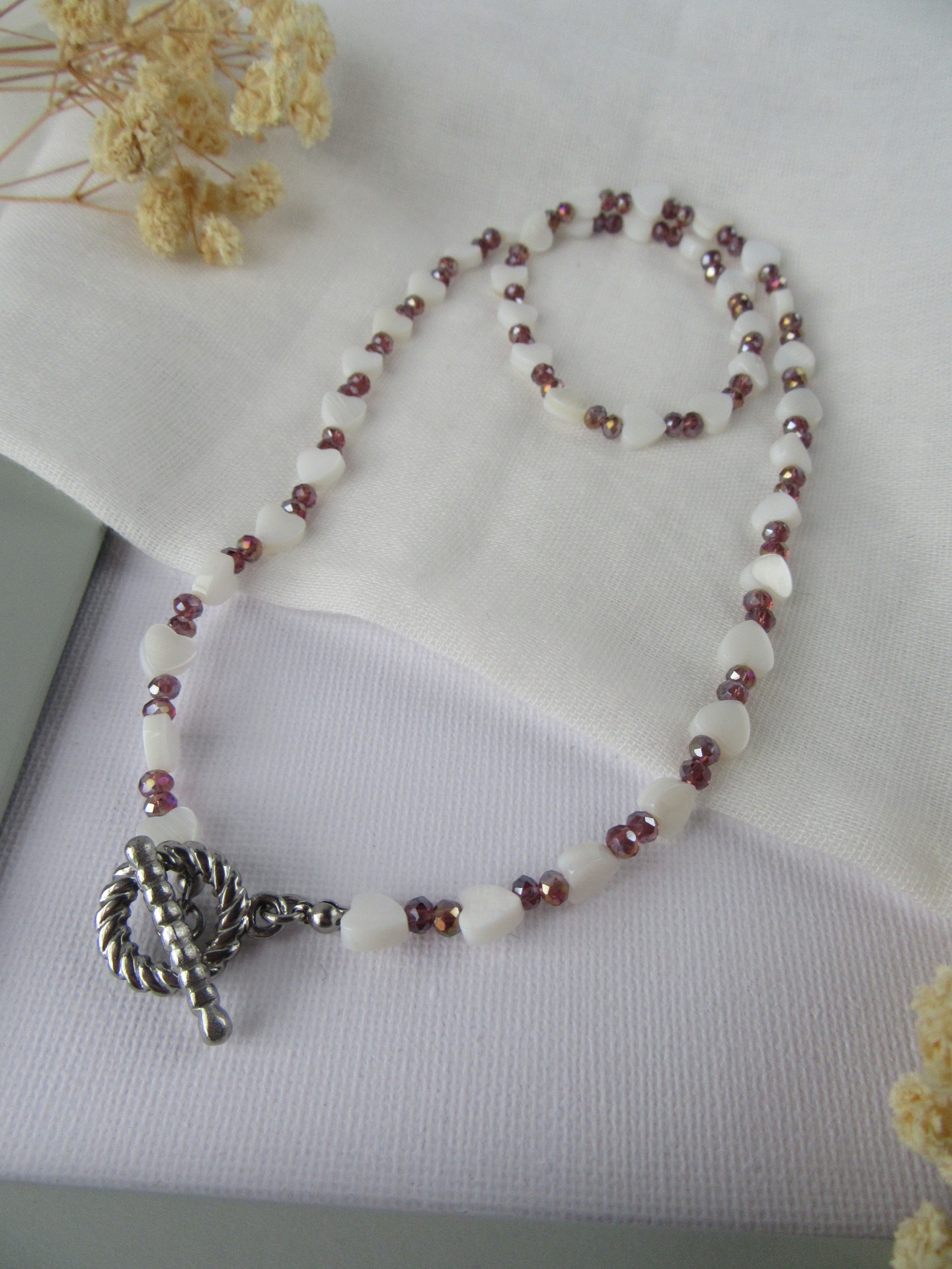 Colar feito à mão com corações madrepérola e cristais facetados bordeaux, com fecho em aço inoxidável, e com terminais de fecho em aço inoxidável prateados garatindo o ajuste perfeito, a durabilidade e o conforto.