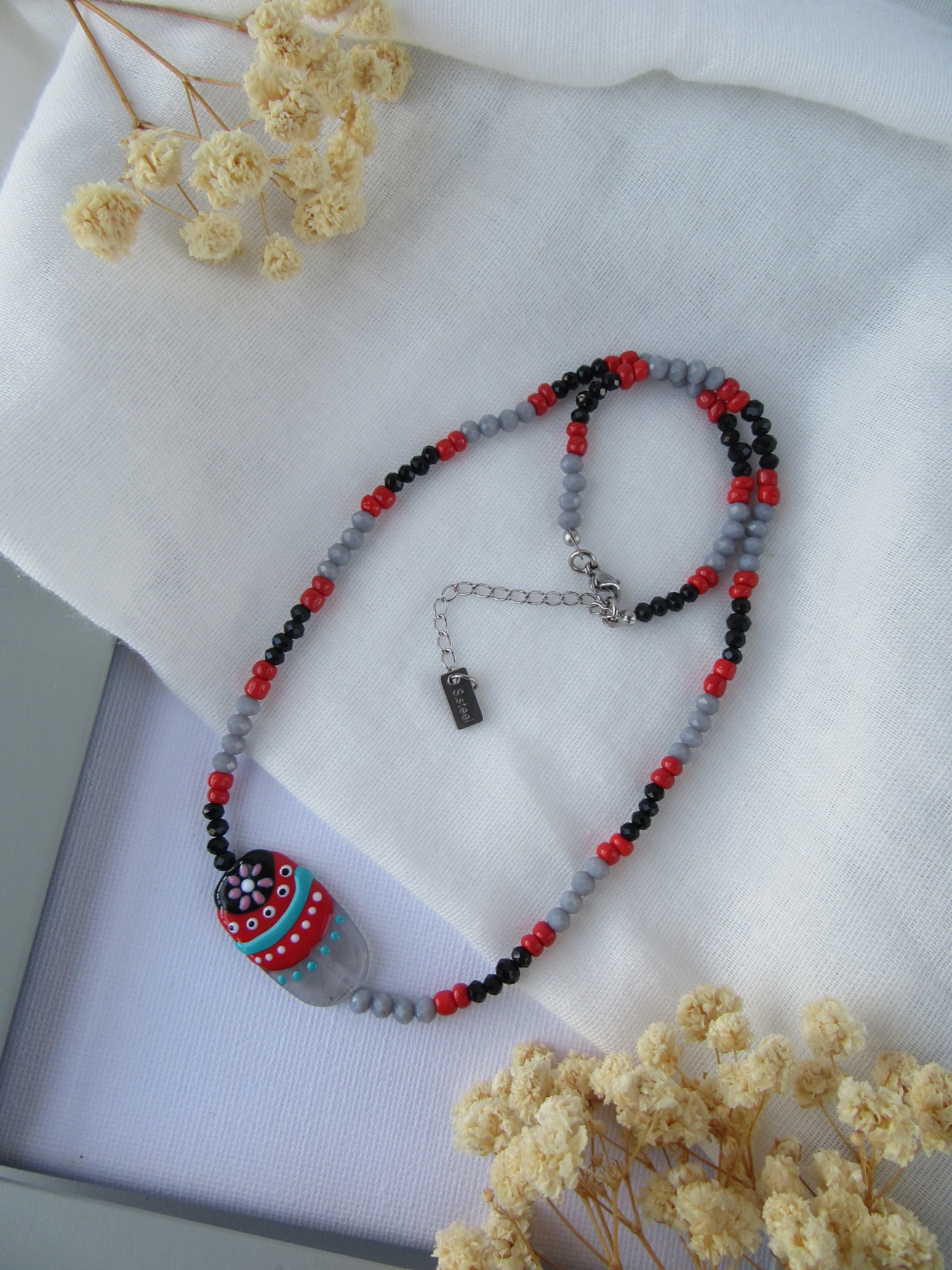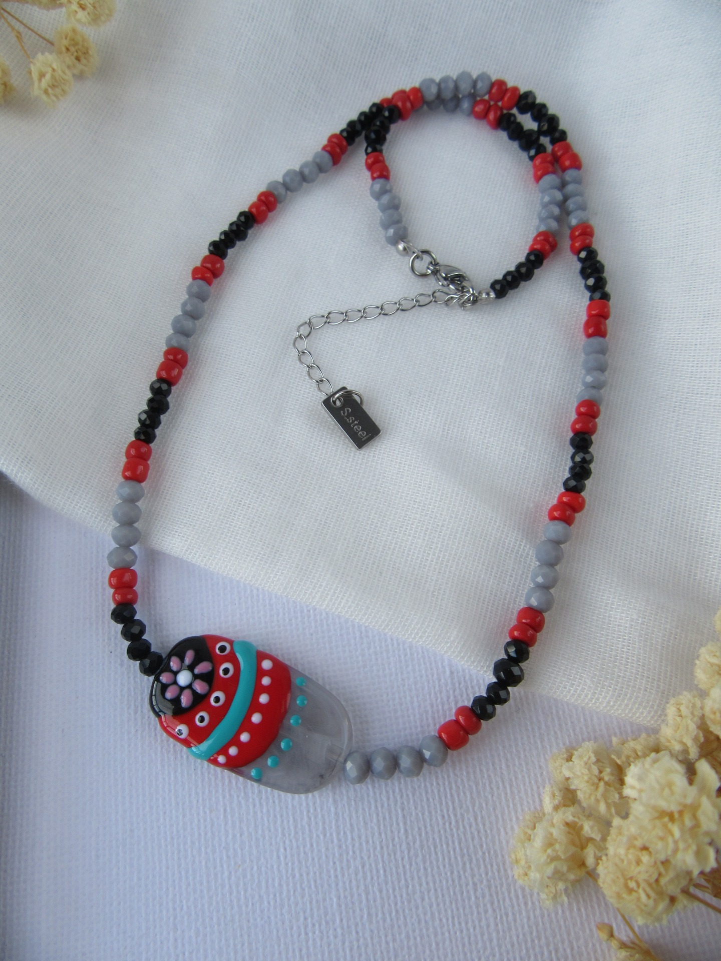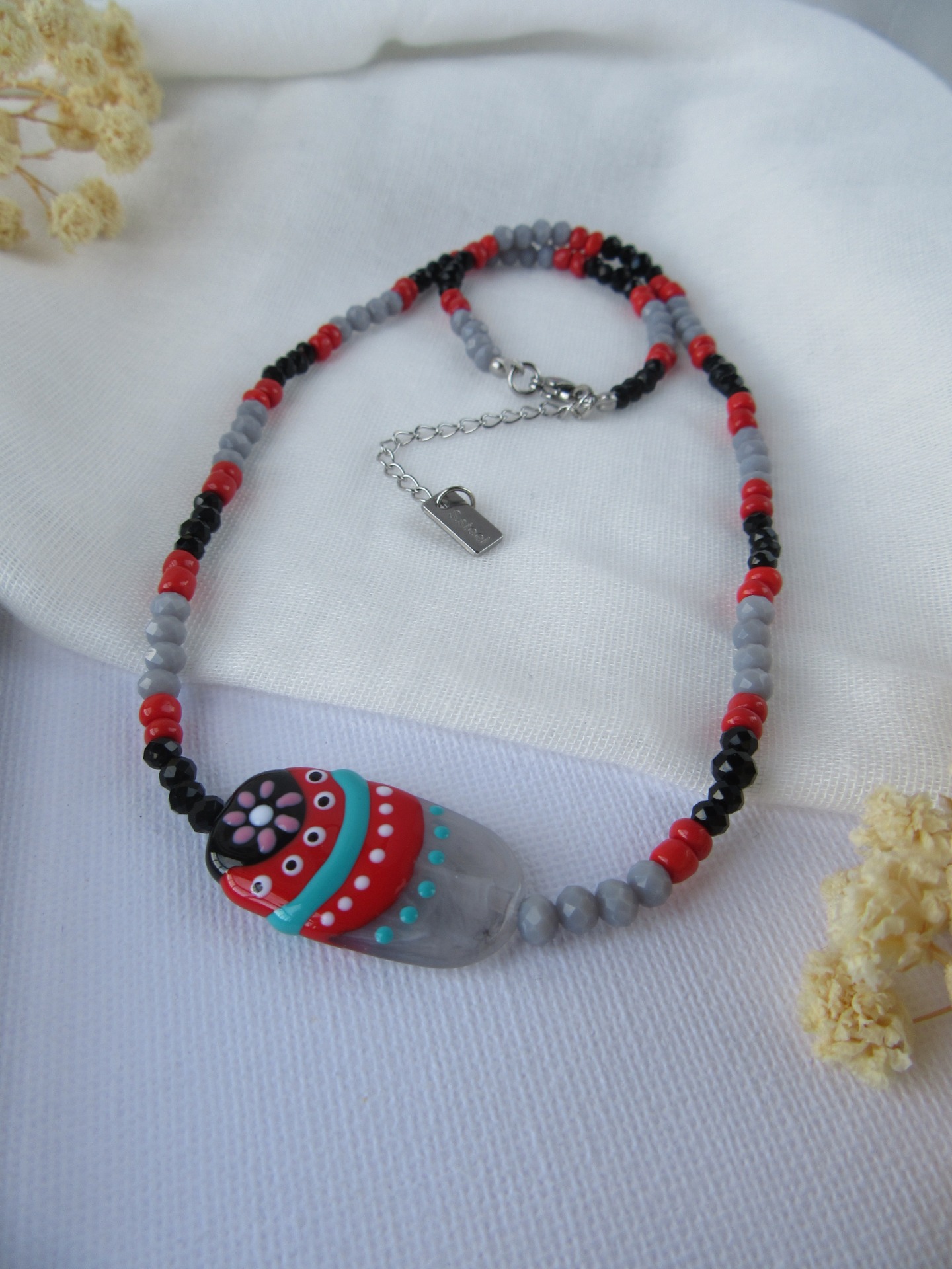 Colar feito à mão com cristais facetados preto e cinzento e missangas vermelhas, com medalha oval acrílica, e com terminais de fecho e com extensor de 5 cm em aço inoxidável prateados garatindo o ajuste perfeito, a durabilidade e o conforto.