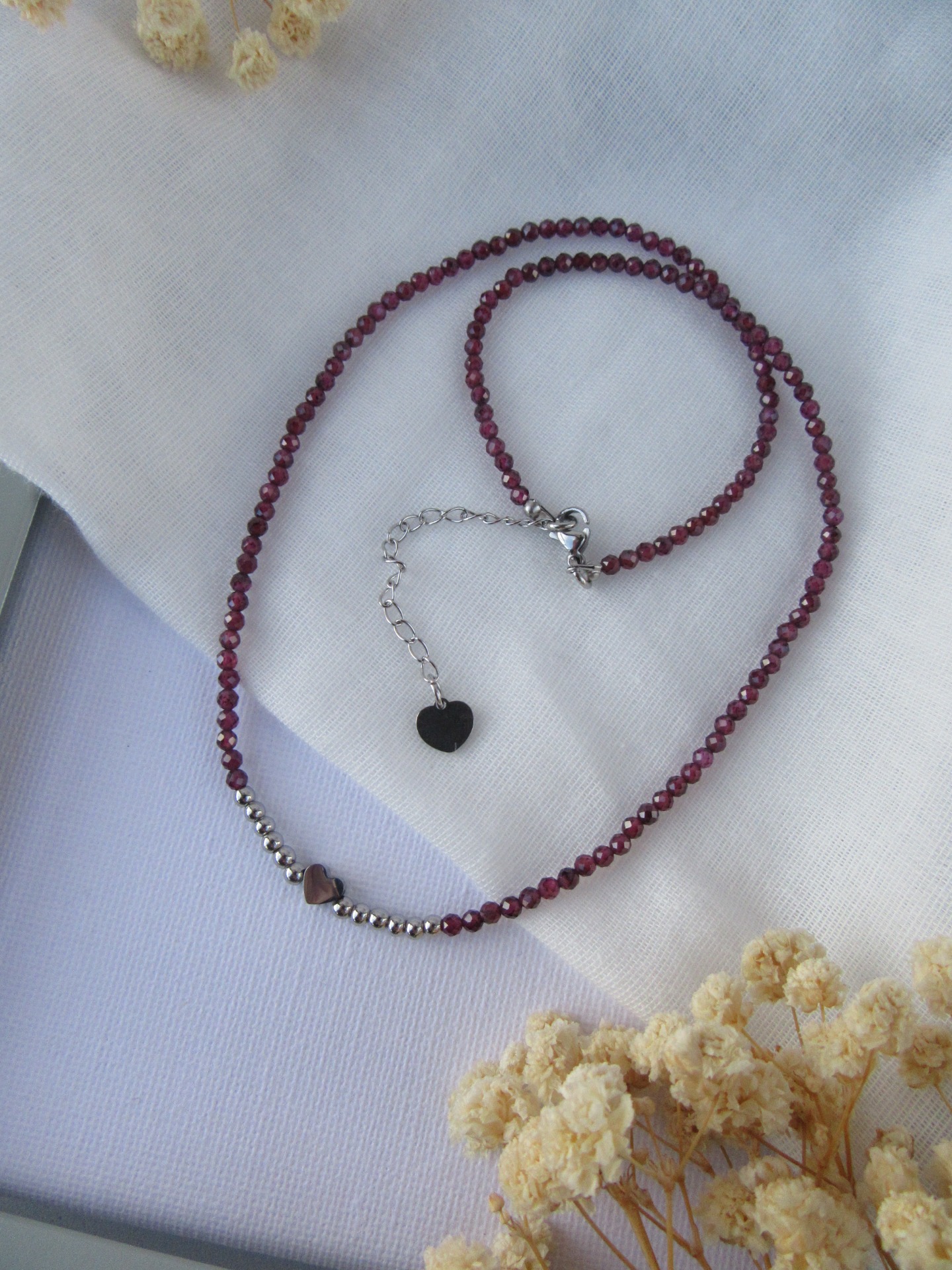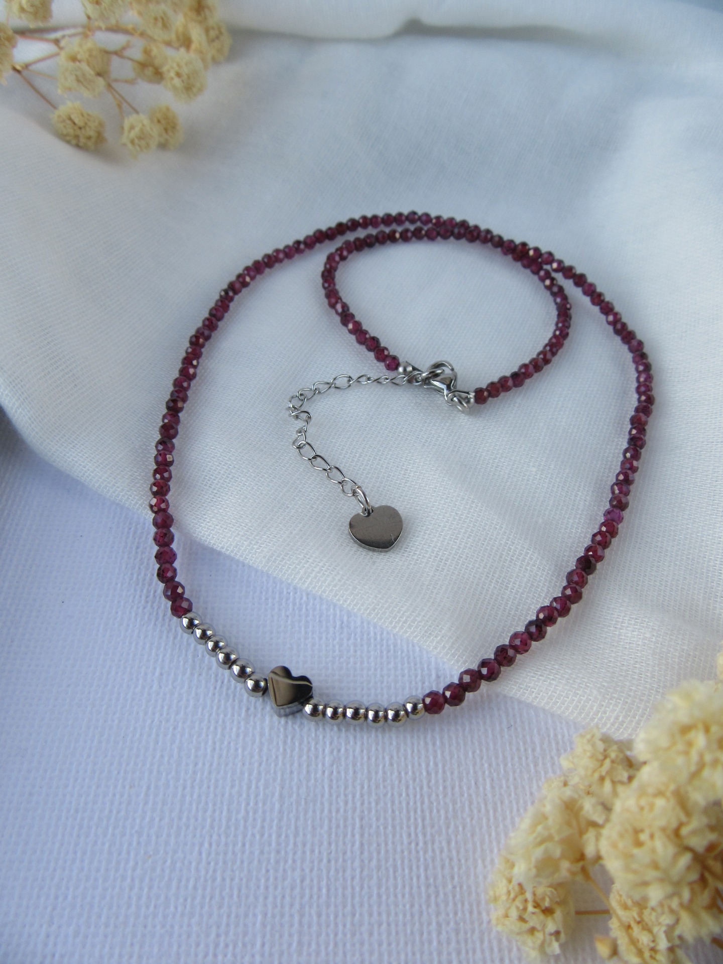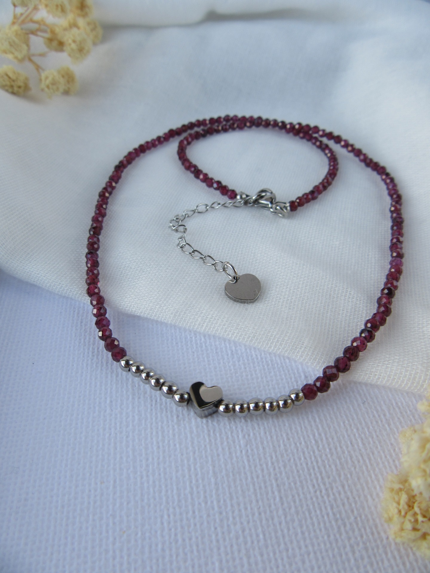 Colar feito à mão com cristais pequenos facetados roxos, medalha coração e bolinhas lisas em aço inoxidável prateadas, e com terminais de fecho e com extensor de 5 cm em aço inoxidável prateados garatindo o ajuste perfeito, a durabilidade e o conforto.
