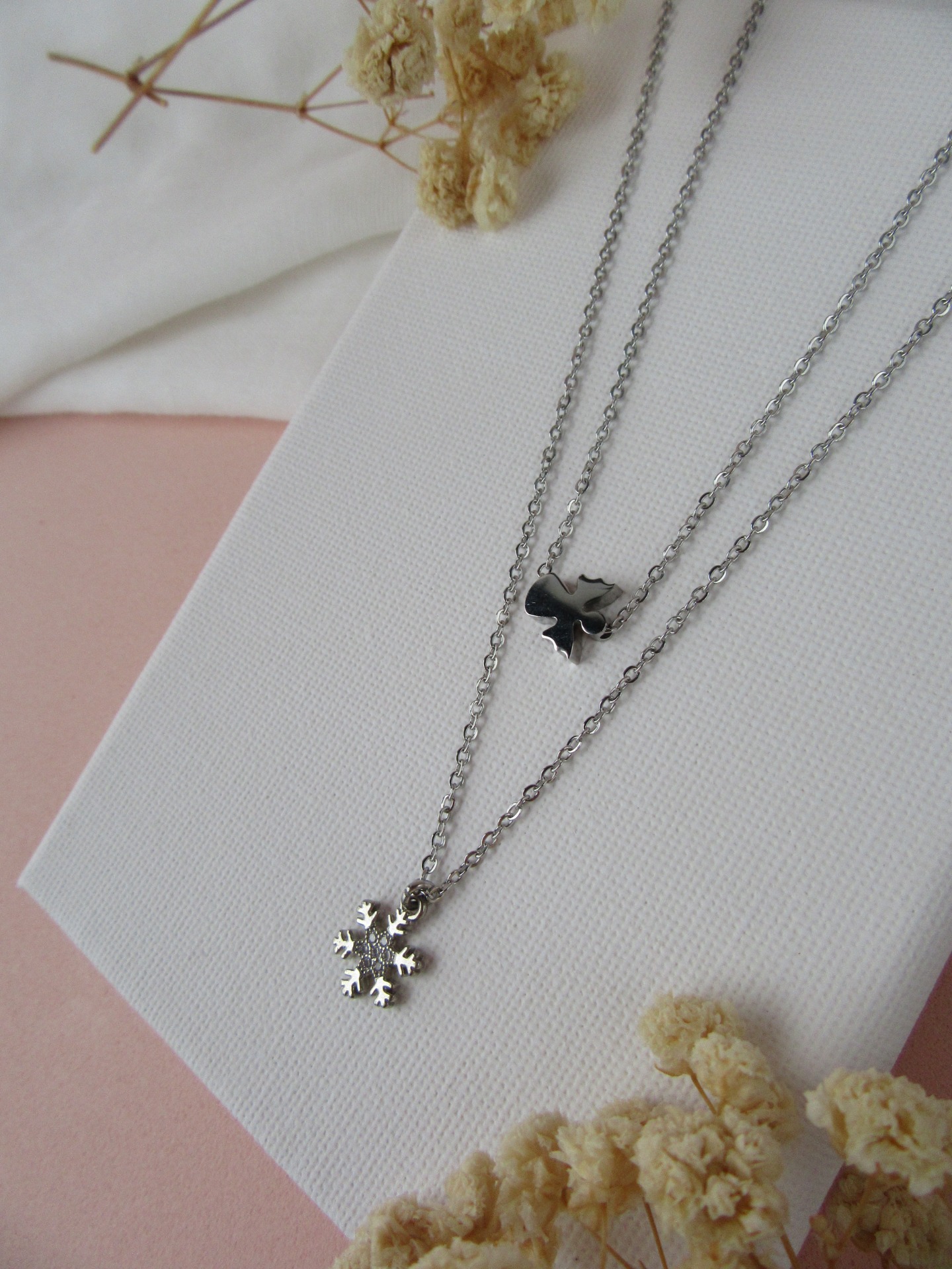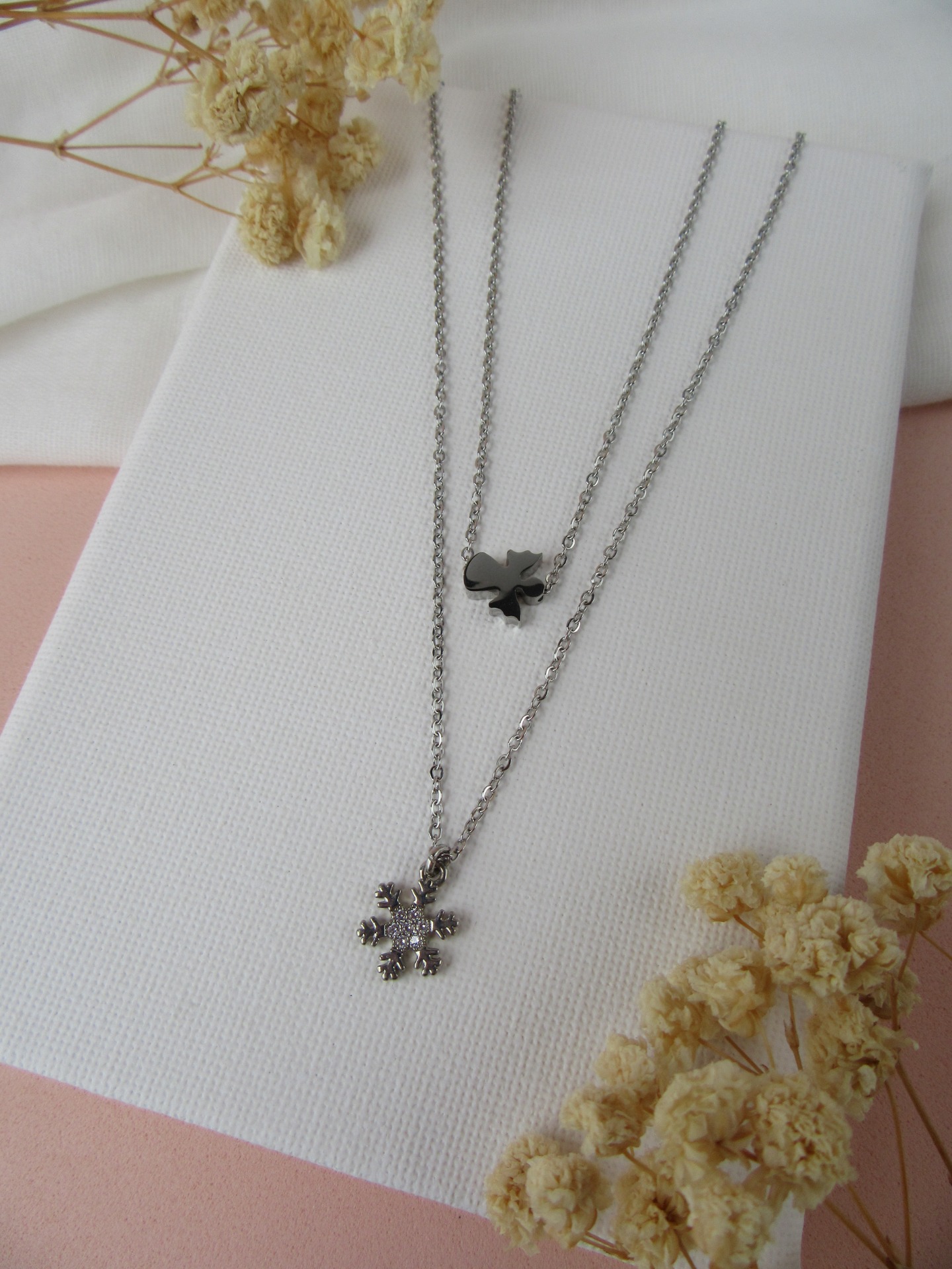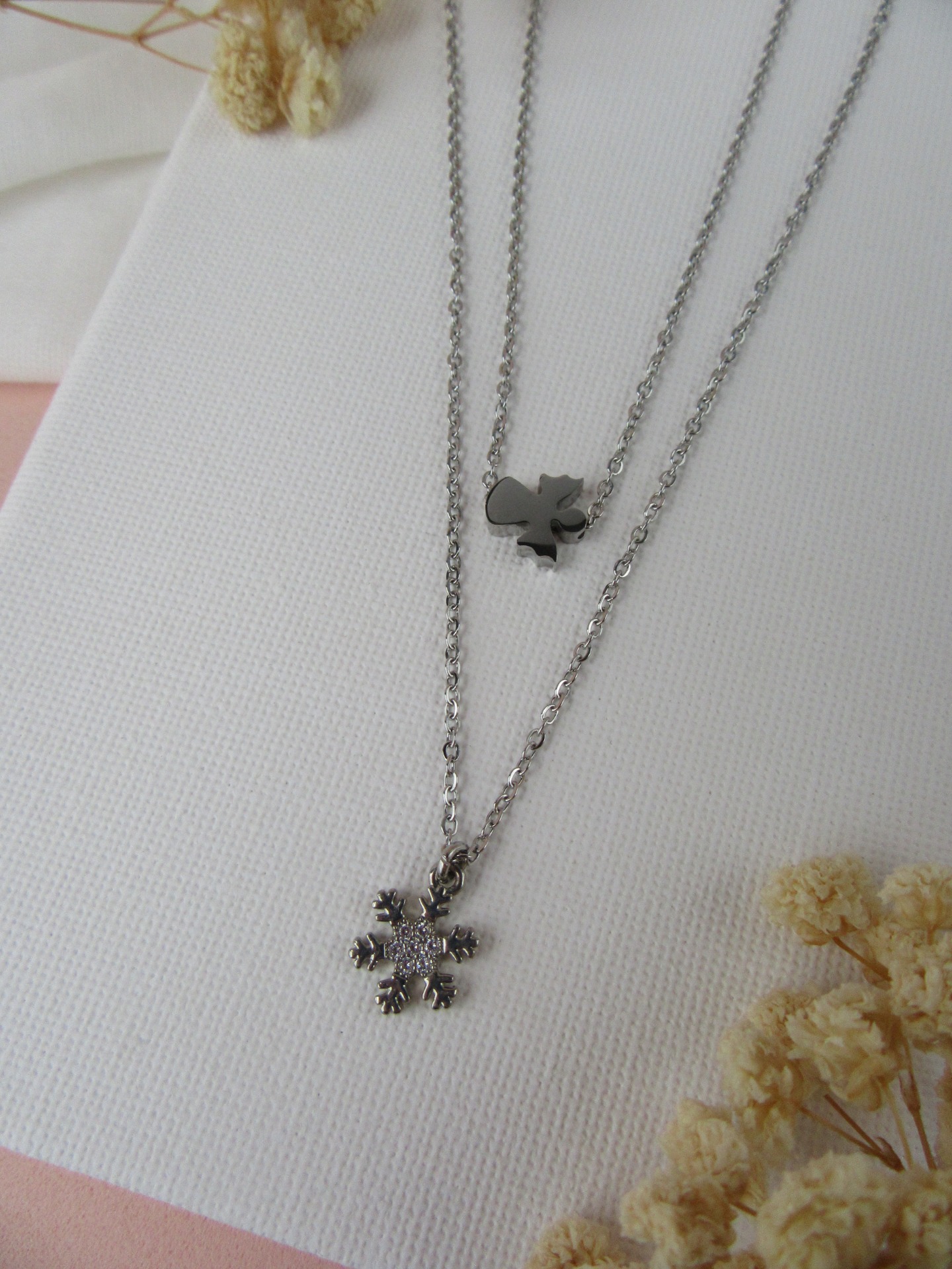 Colar duplo simples feito à mão em aço inoxidável prateado, com medalha floco de neve com zircónias e com medalhada anjo em aço inoxidável e com extensor de 5 cm garatindo o ajuste perfeito, a durabilidade e o conforto.