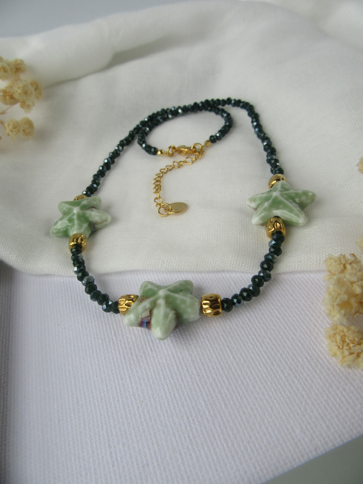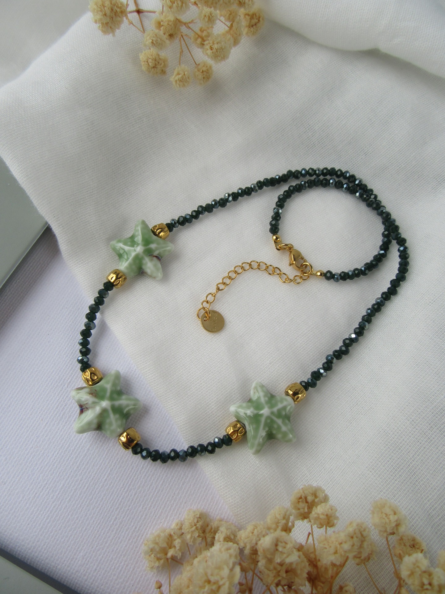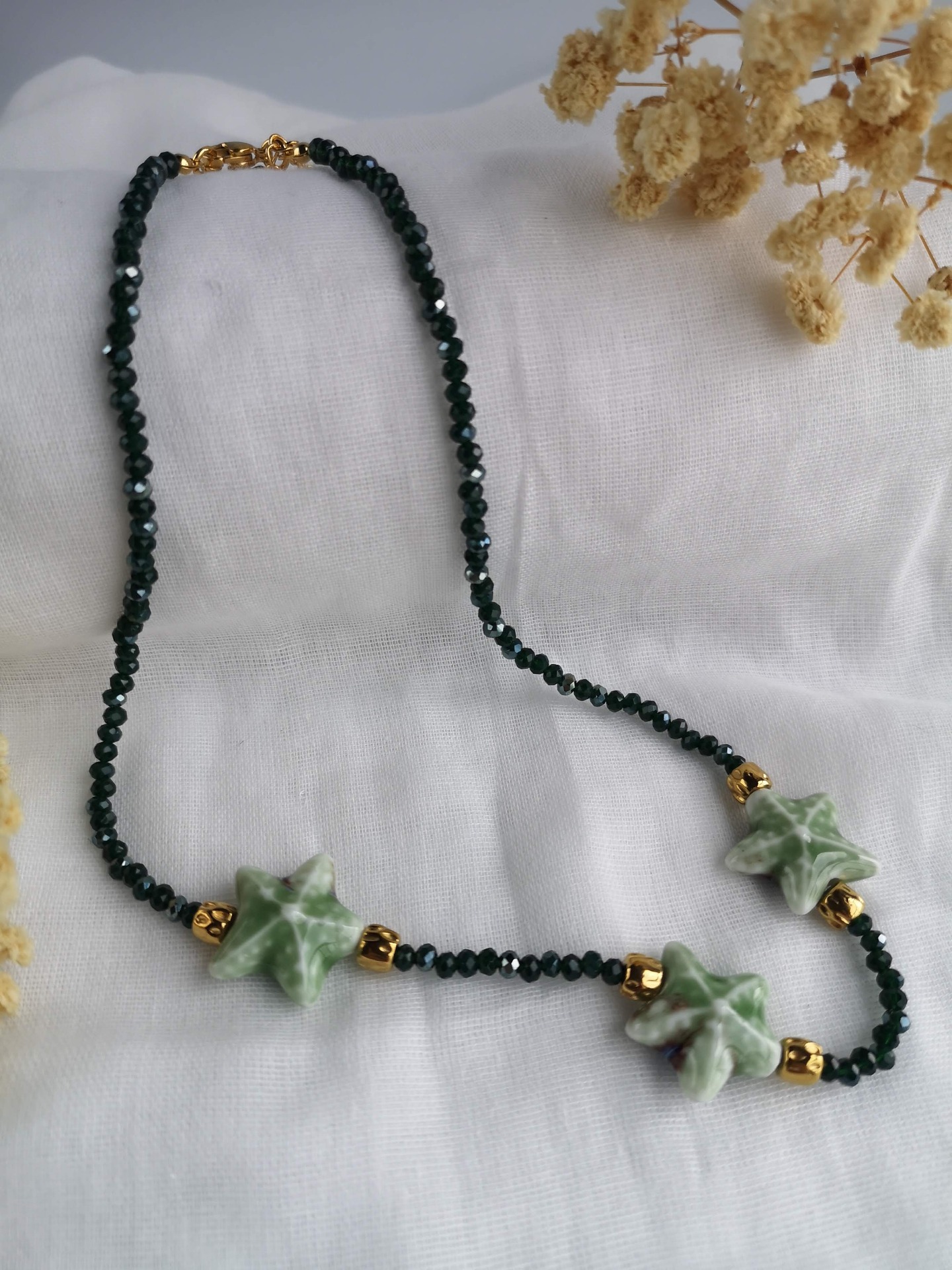Colar feito à mão com cristais facetados verde escuro, com estrelas verde claro em cerâmica e com detalhes dourados em aço inoxidável, e com terminais de fecho e com extensor de 5 cm em aço inoxidável dourados garatindo o ajuste perfeito, a durabilidade e o conforto.
