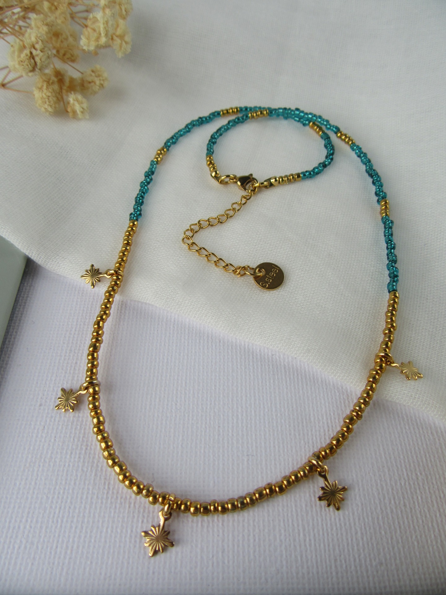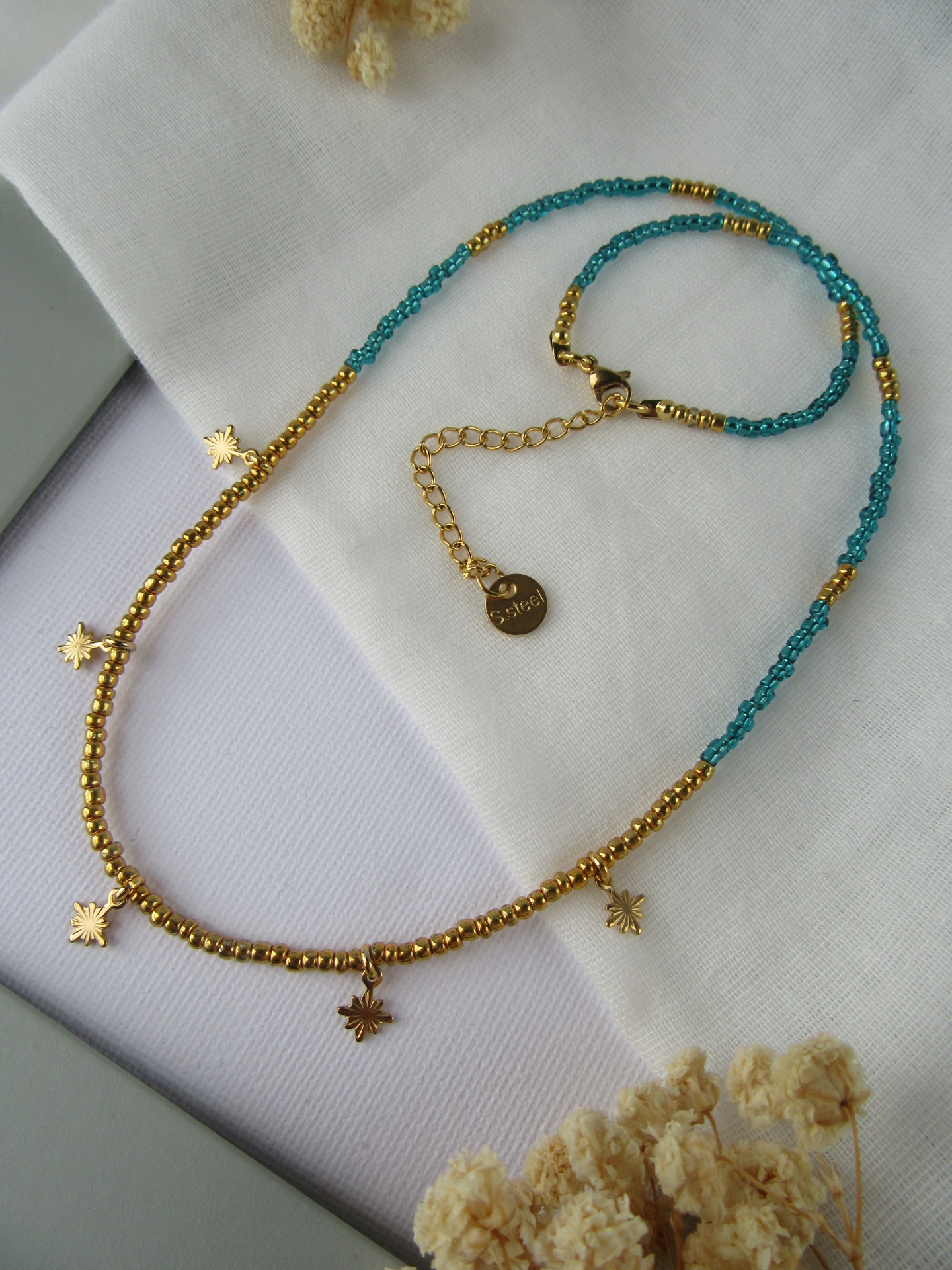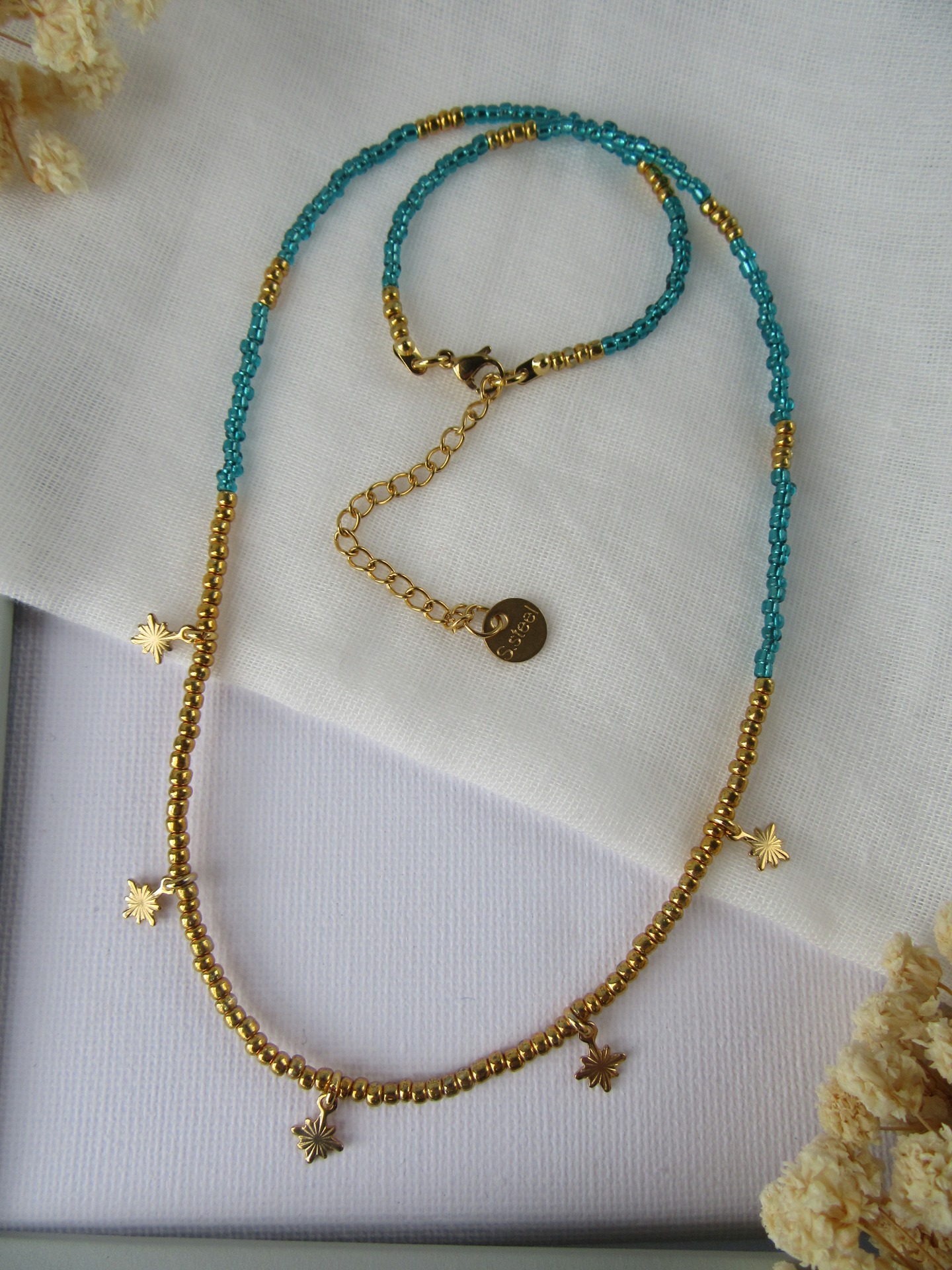 Colar feito à mão com missangas azul turquesa e douradas, com medalhinhas estrelas douradas e com terminais de fecho e com extensor de 5 cm em aço inoxidável dourados garatindo o ajuste perfeito, a durabilidade e o conforto.