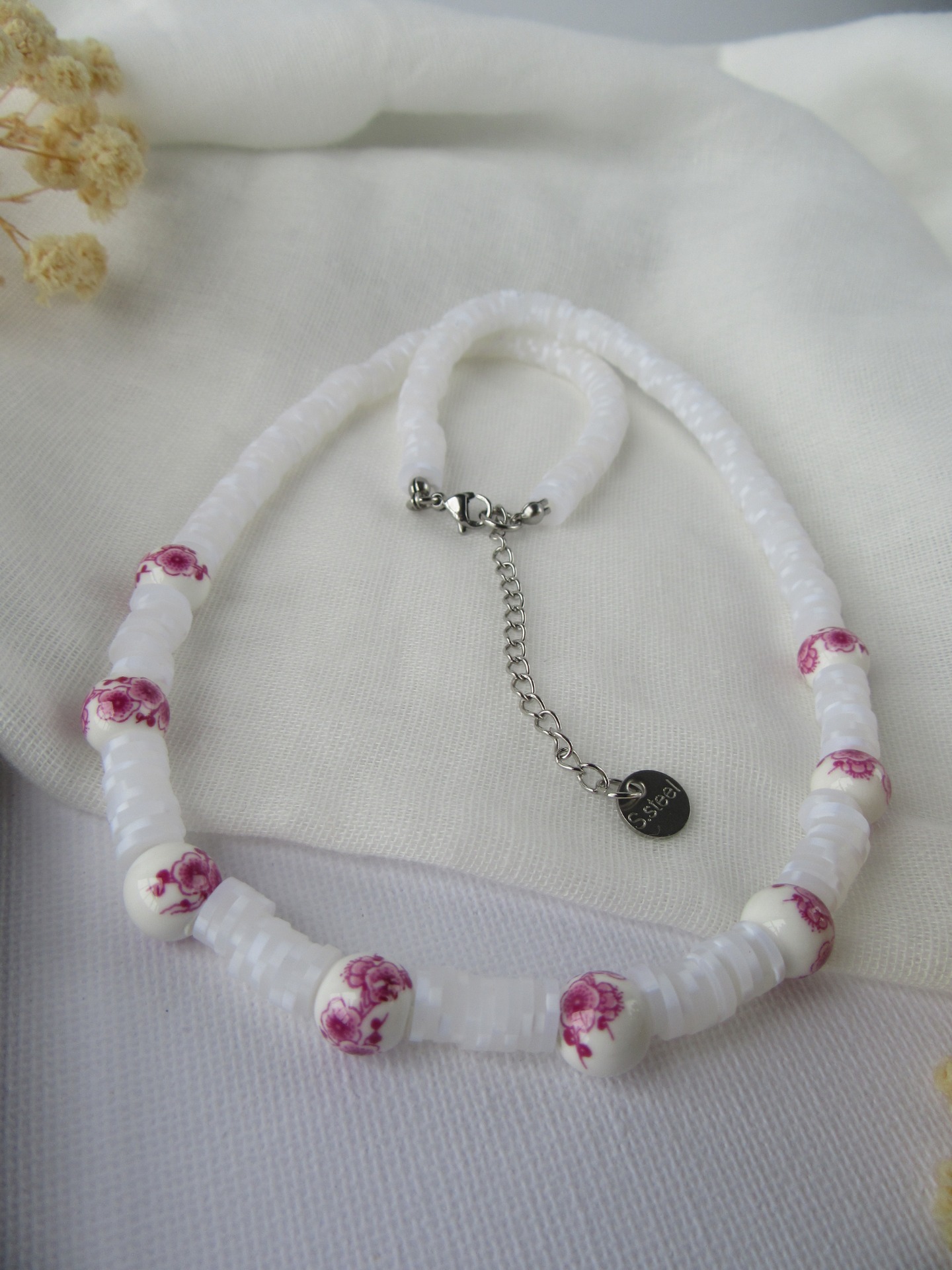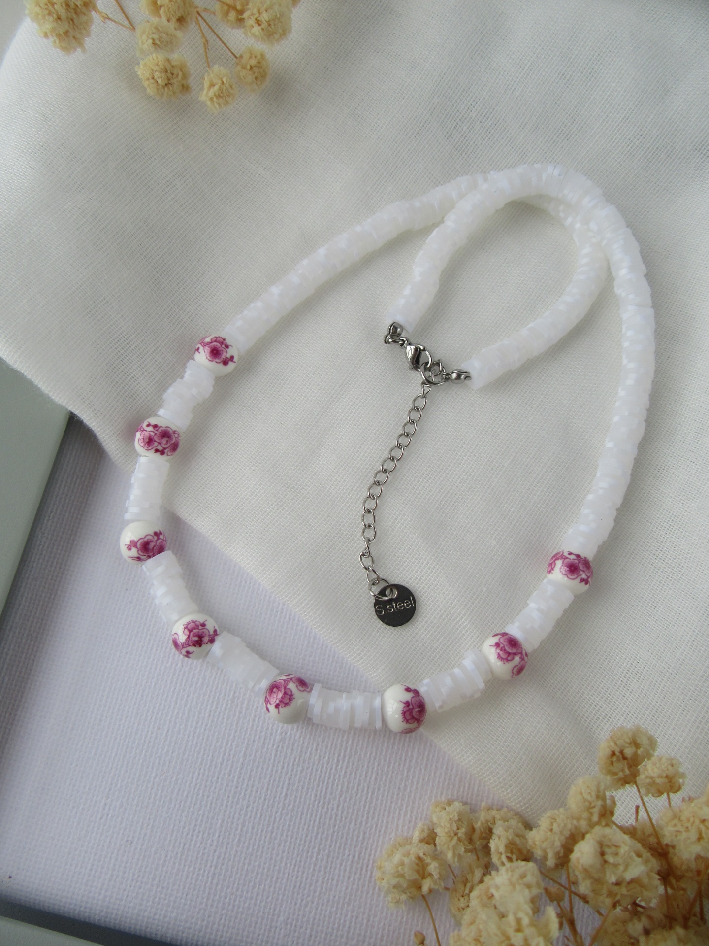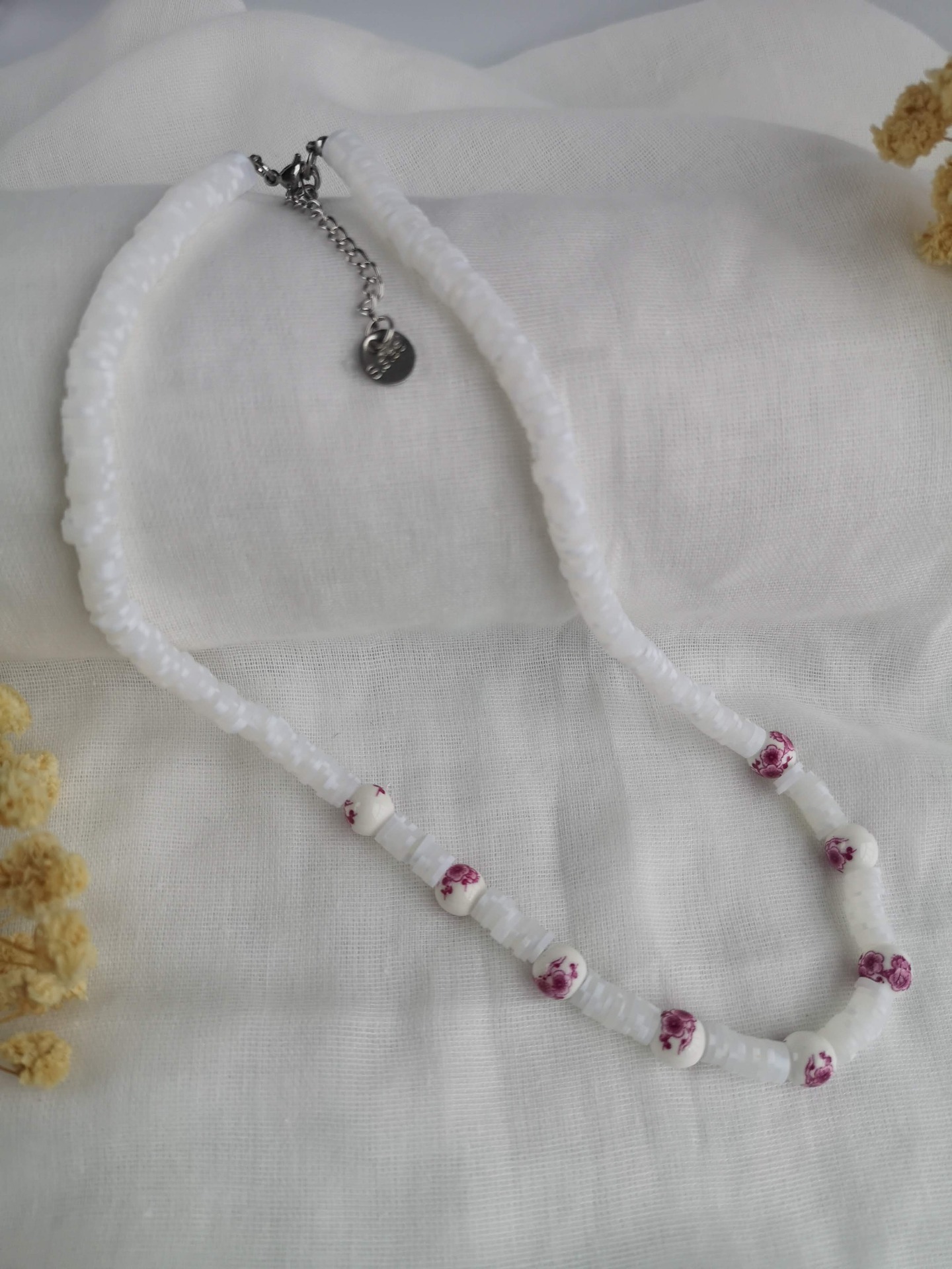 Colar feito à mão com borrachinhas brancas, com pérolas florais rosa em cerâmica, e com terminais de fecho e com extensor de 5 cm em aço inoxidável prateados garatindo o ajuste perfeito, a durabilidade e o conforto.