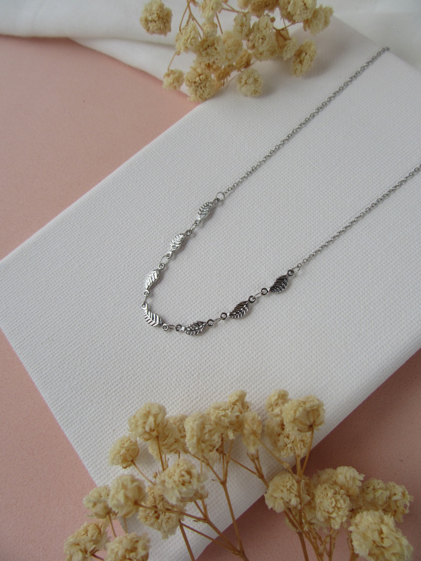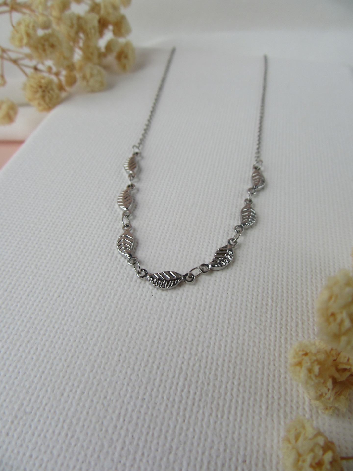 Colar simples feito à mão em aço inoxidável prateado, com entremeios em forma de folha e com extensor de 5 cm garatindo o ajuste perfeito, a durabilidade e o conforto.