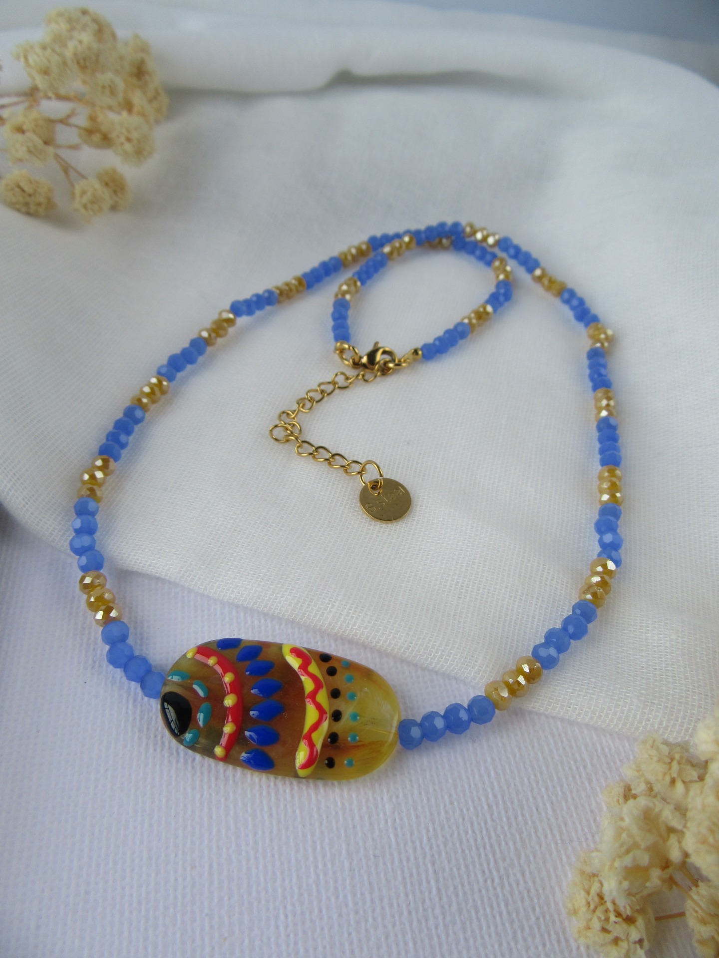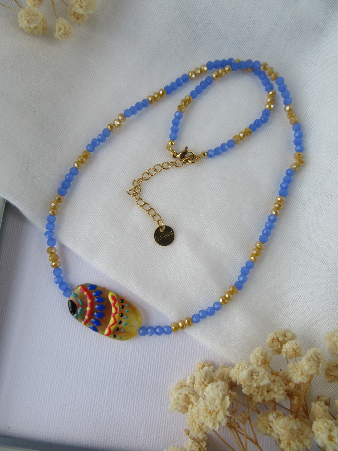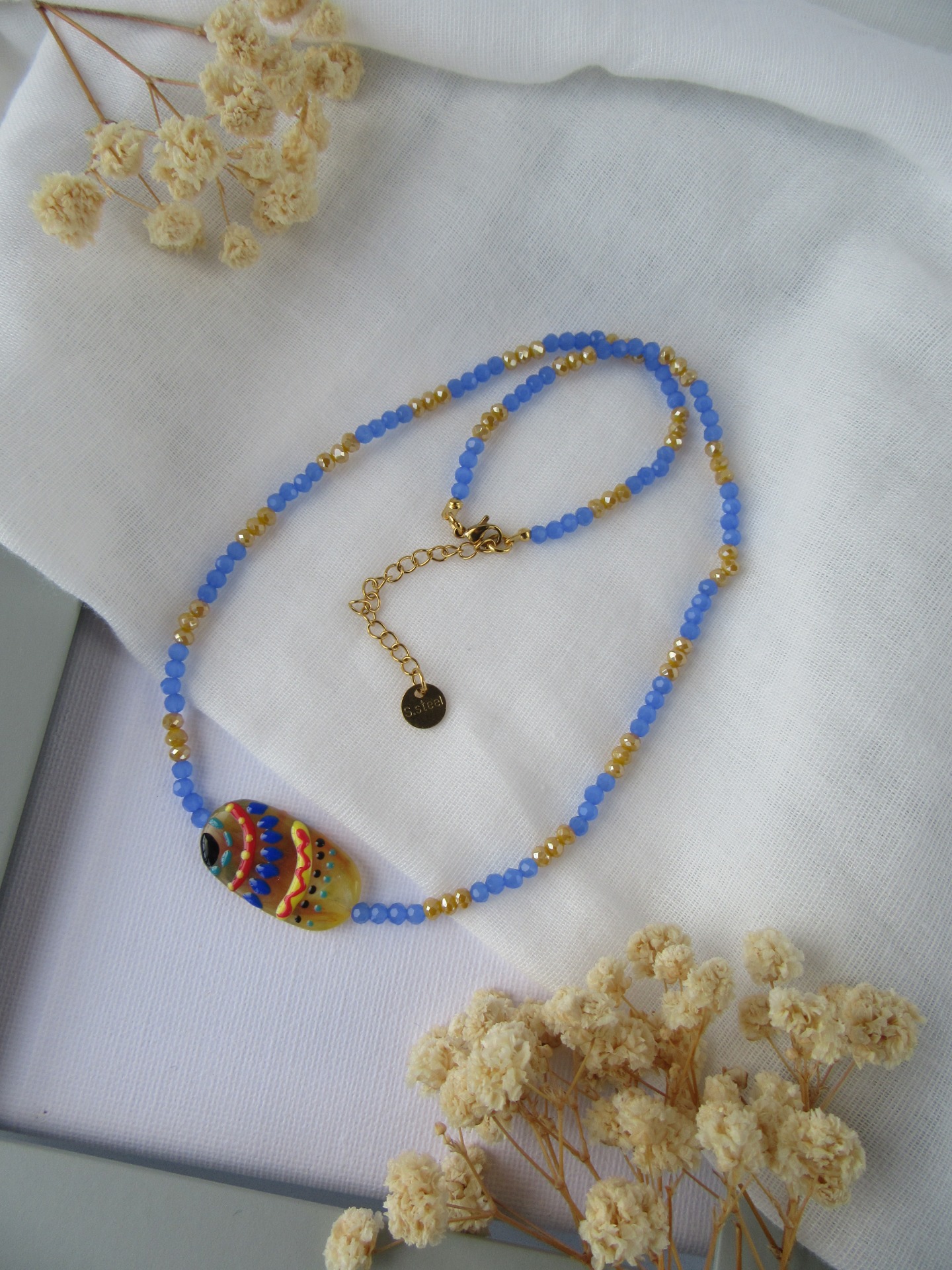 Colar feito à mão com cristais facetados azuis e amarelos, com medalha oval acrílica, e com terminais de fecho e com extensor de 5 cm em aço inoxidável dourados garatindo o ajuste perfeito, a durabilidade e o conforto.