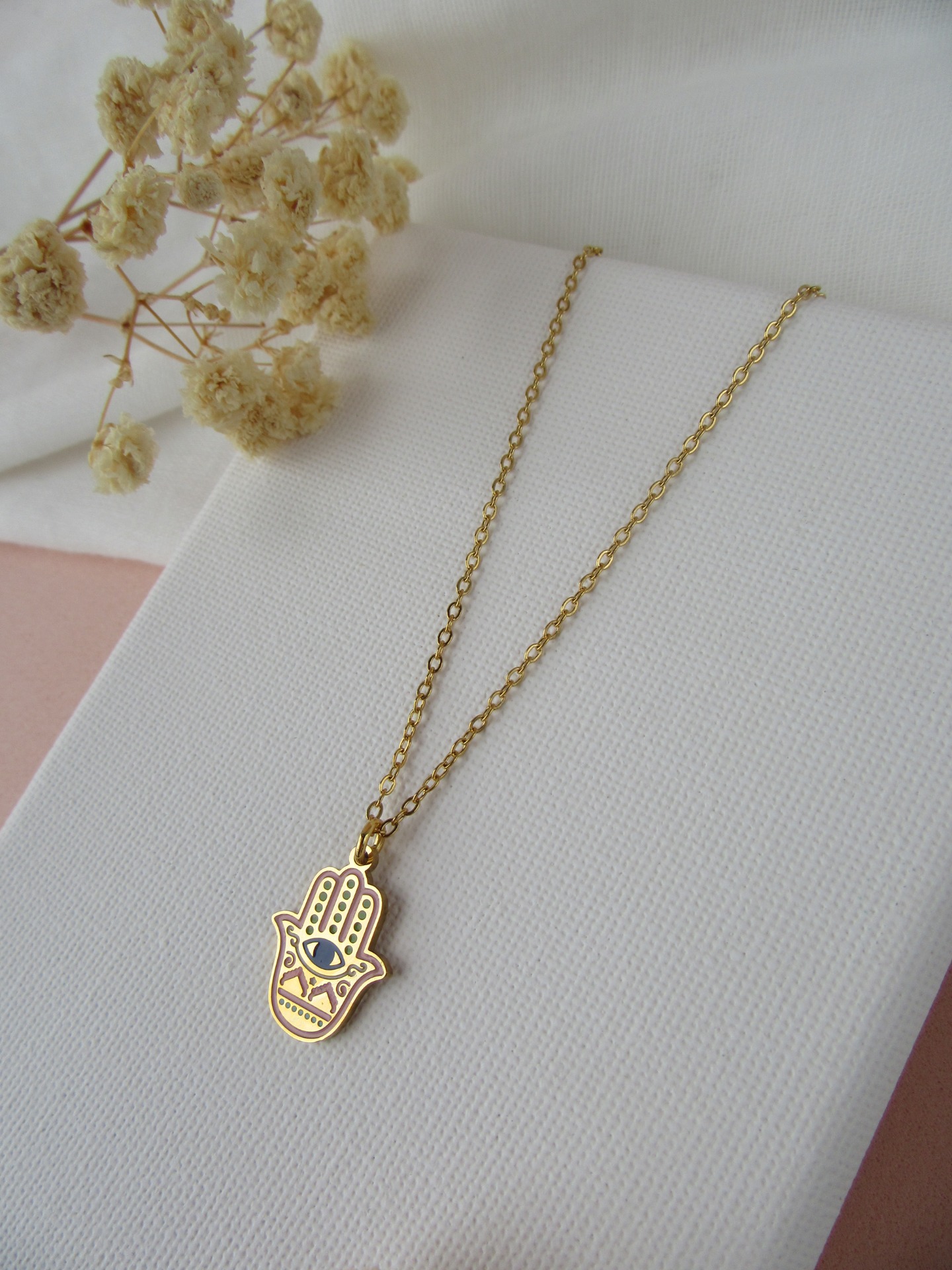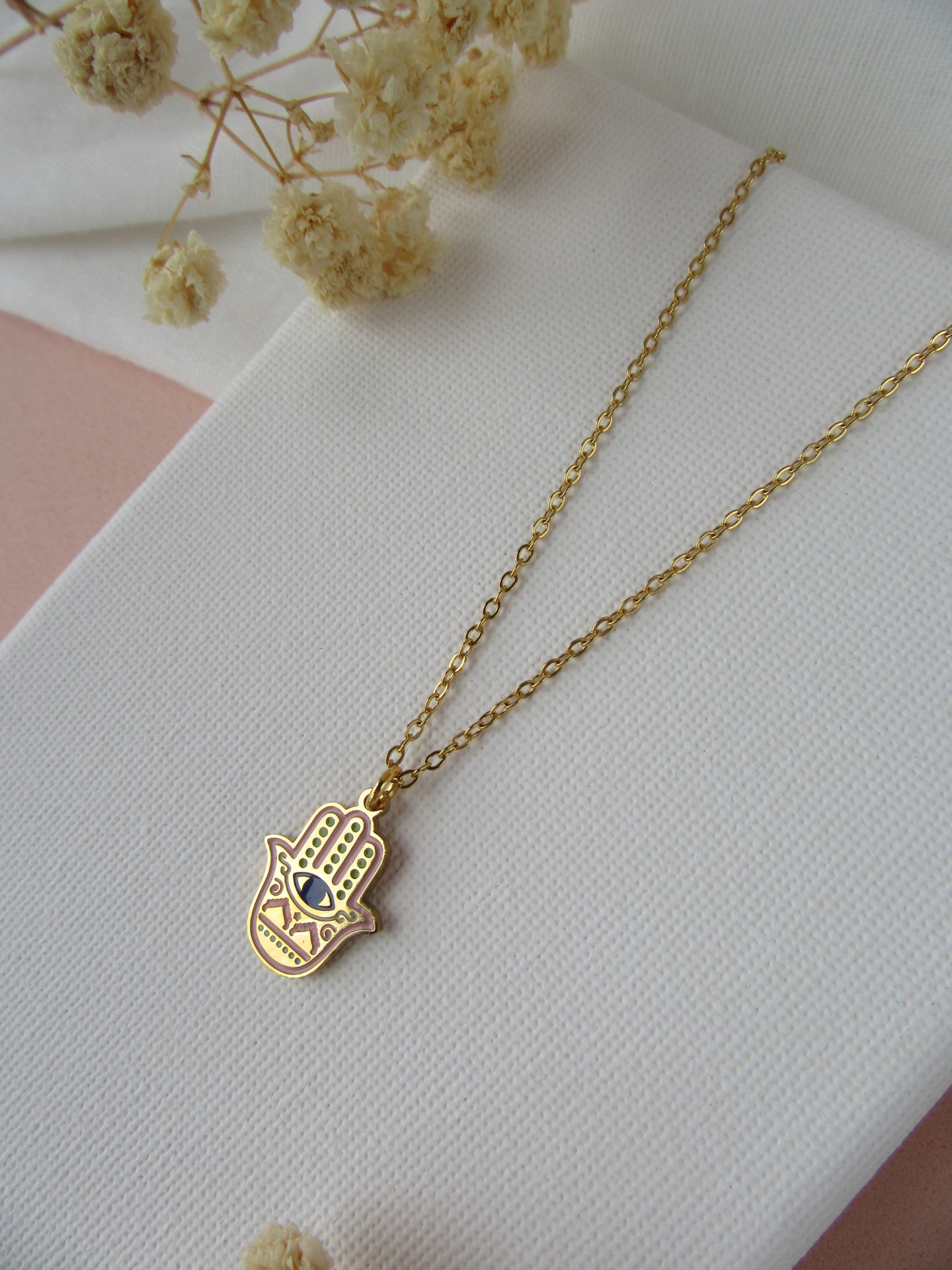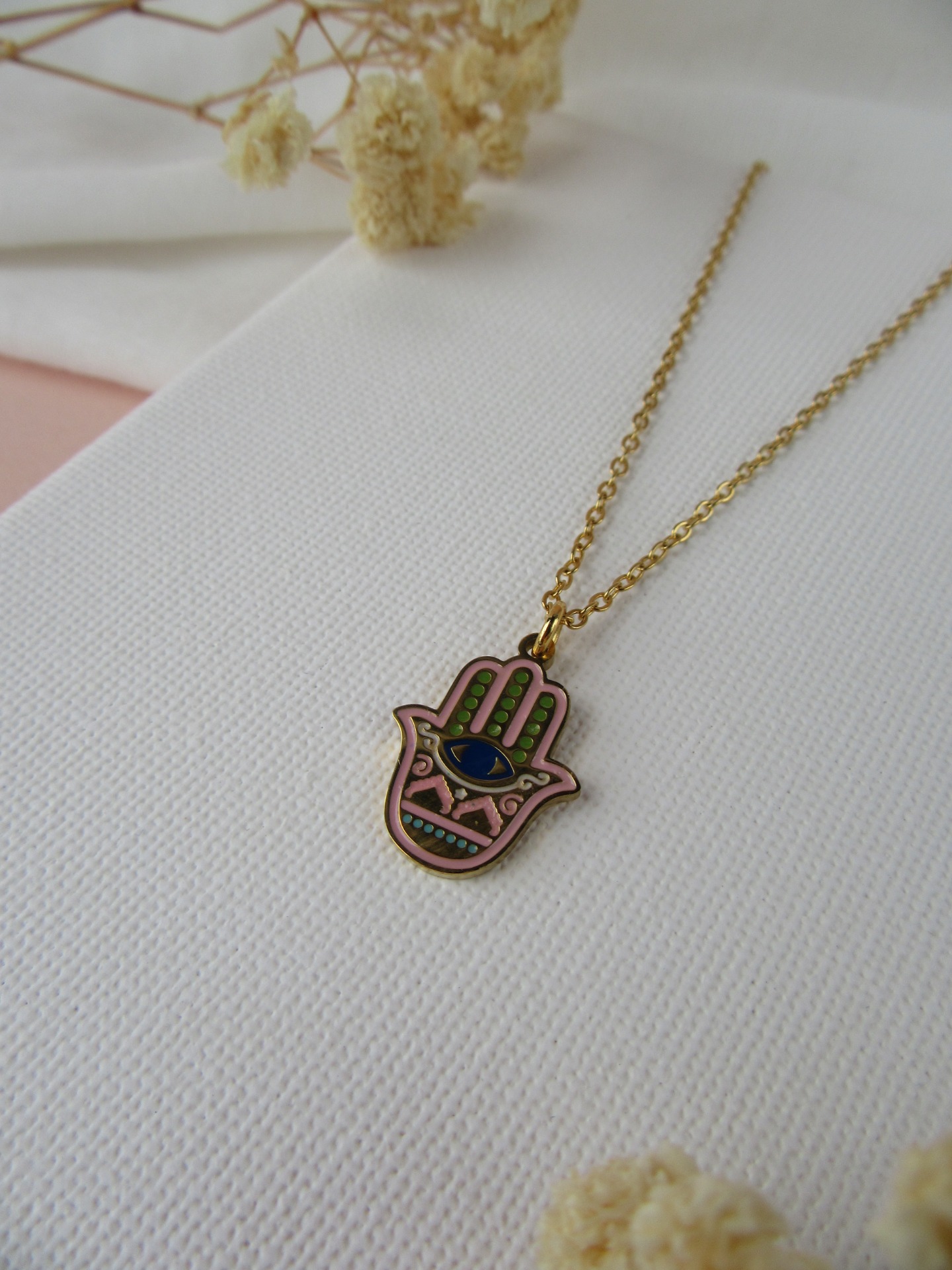 Colar simples em aço inoxidável dourado com medalha de mão de Fátima rosa e com extensor de 5 cm garatindo o ajuste perfeito, a durabilidade e o conforto.