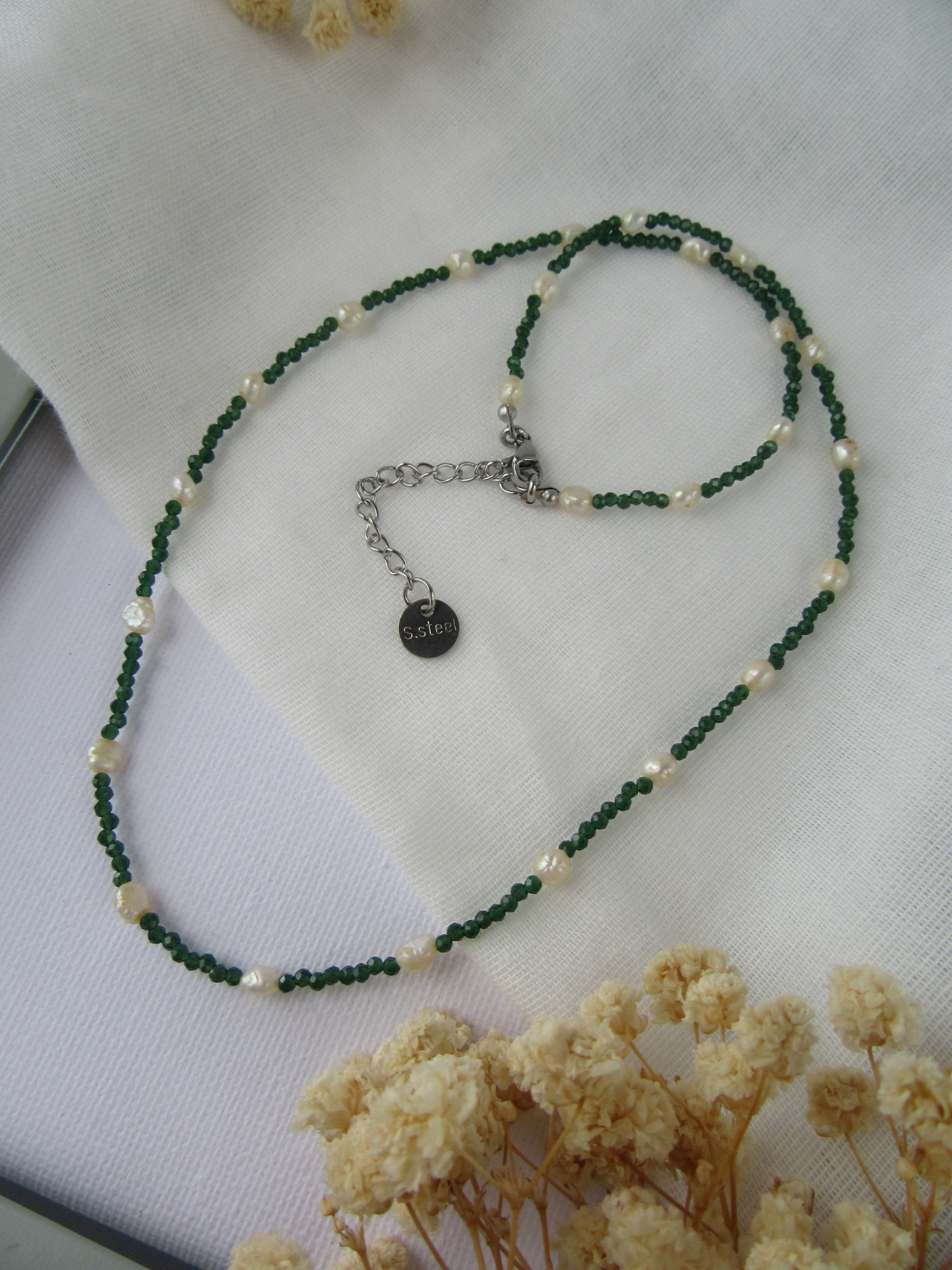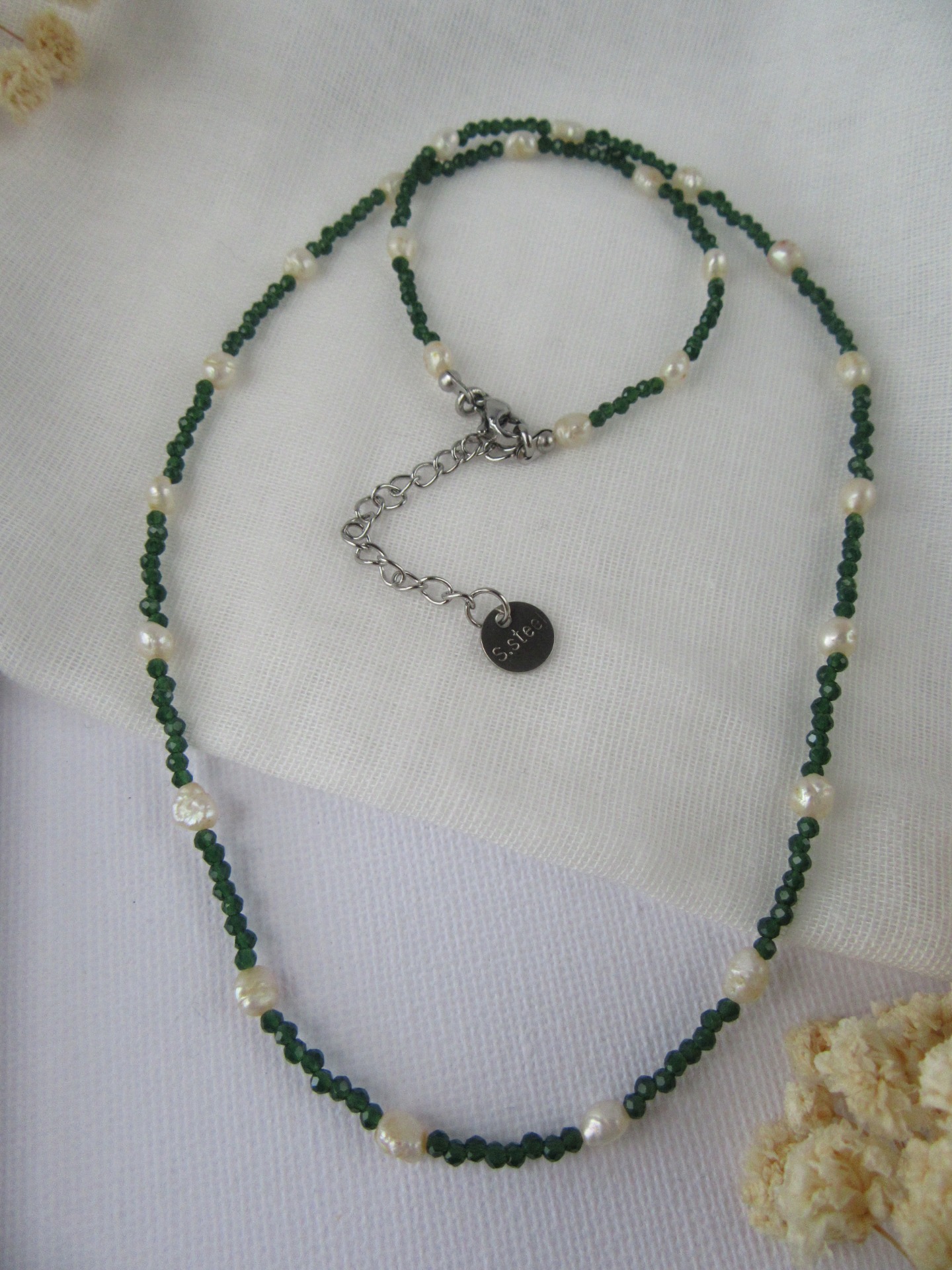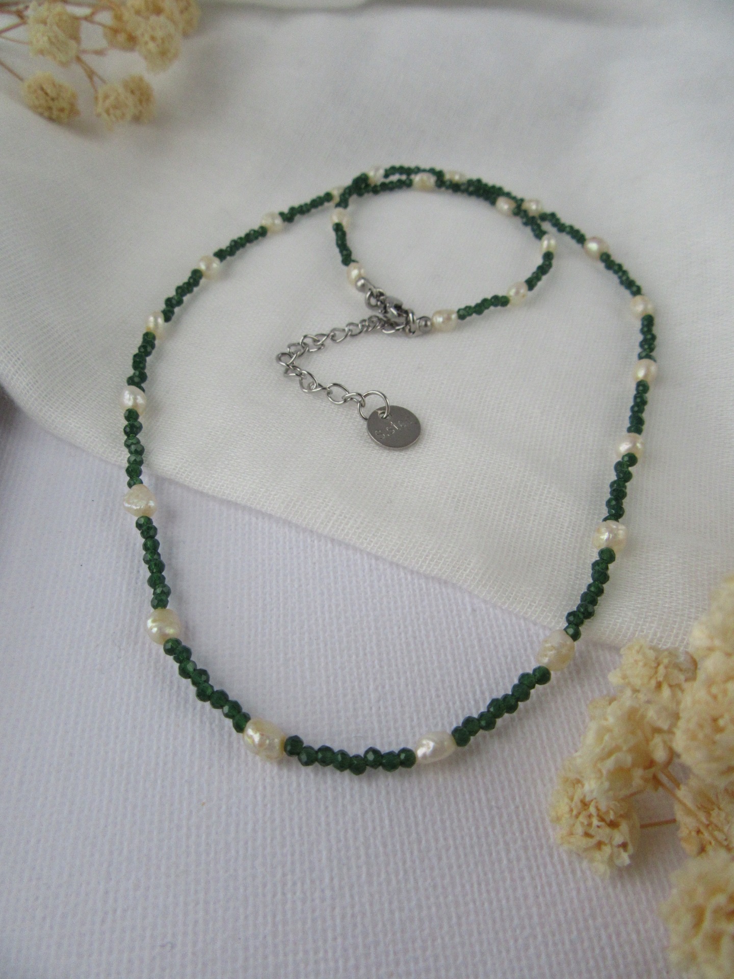 Colar feito à mão com microcristais facetados verde escuro e pérolas de água doce, e com terminais de fecho e com extensor de 5 cm em aço inoxidável prateados garatindo o ajuste perfeito, a durabilidade e o conforto.