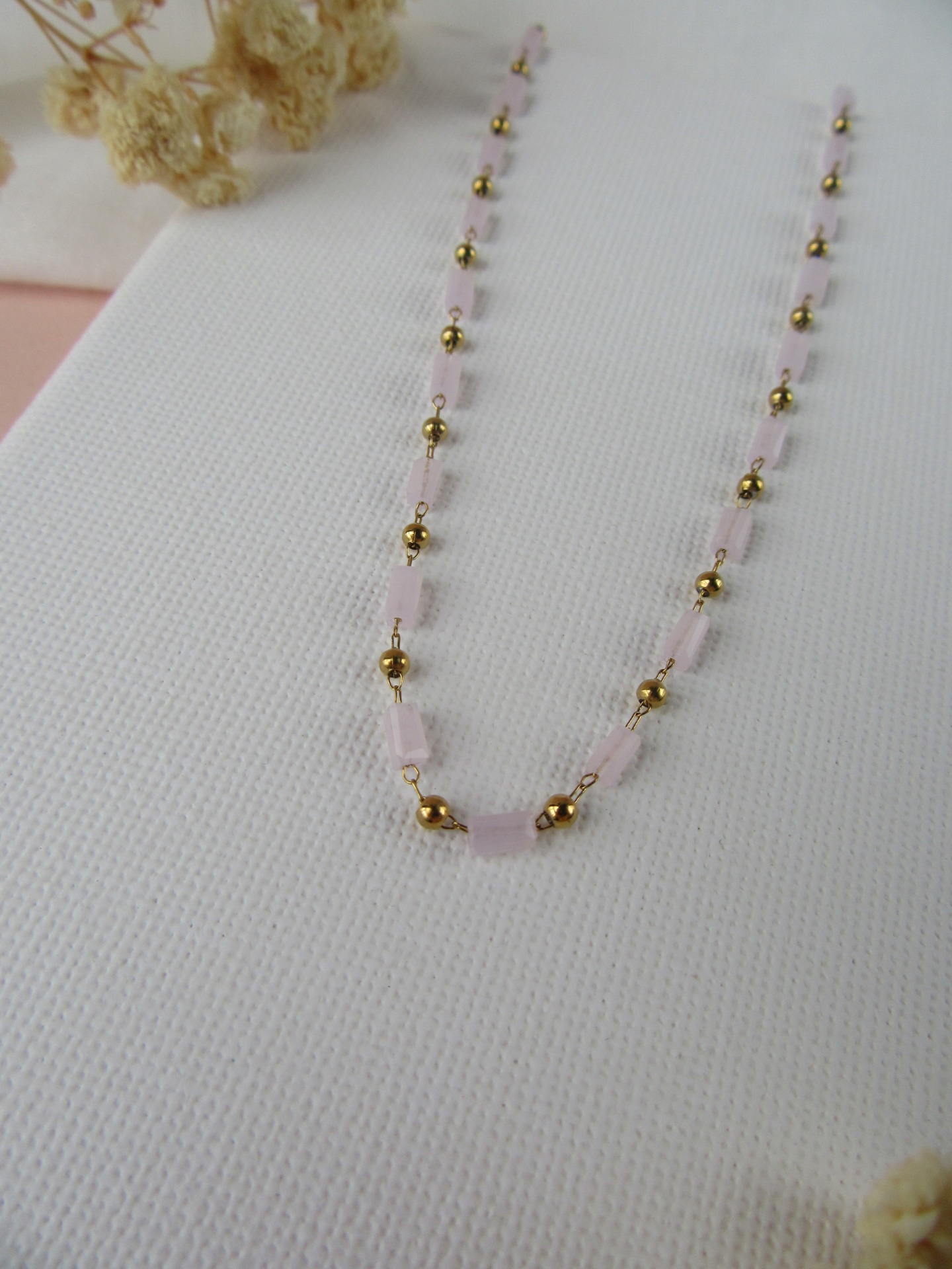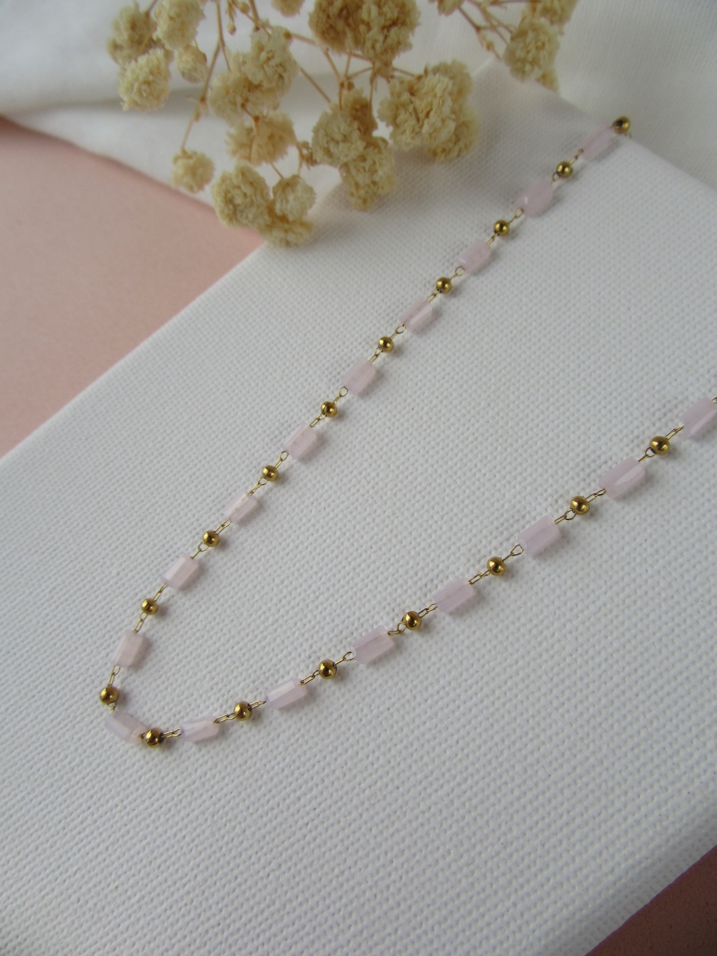 Colar simples em aço inoxidável dourado com detalhe em rosa claro e com extensor de 5 cm garatindo o ajuste perfeito, a durabilidade e o conforto.