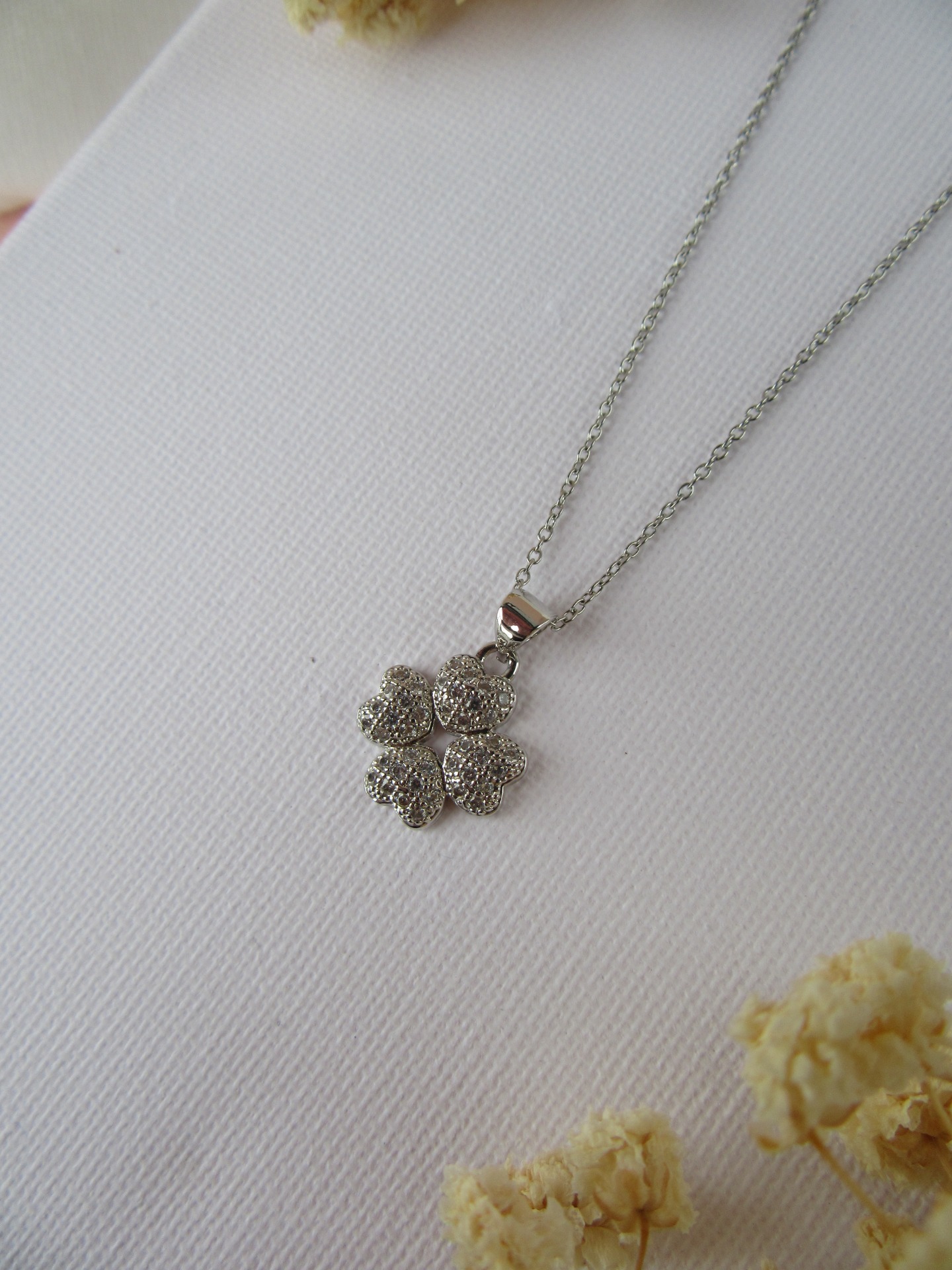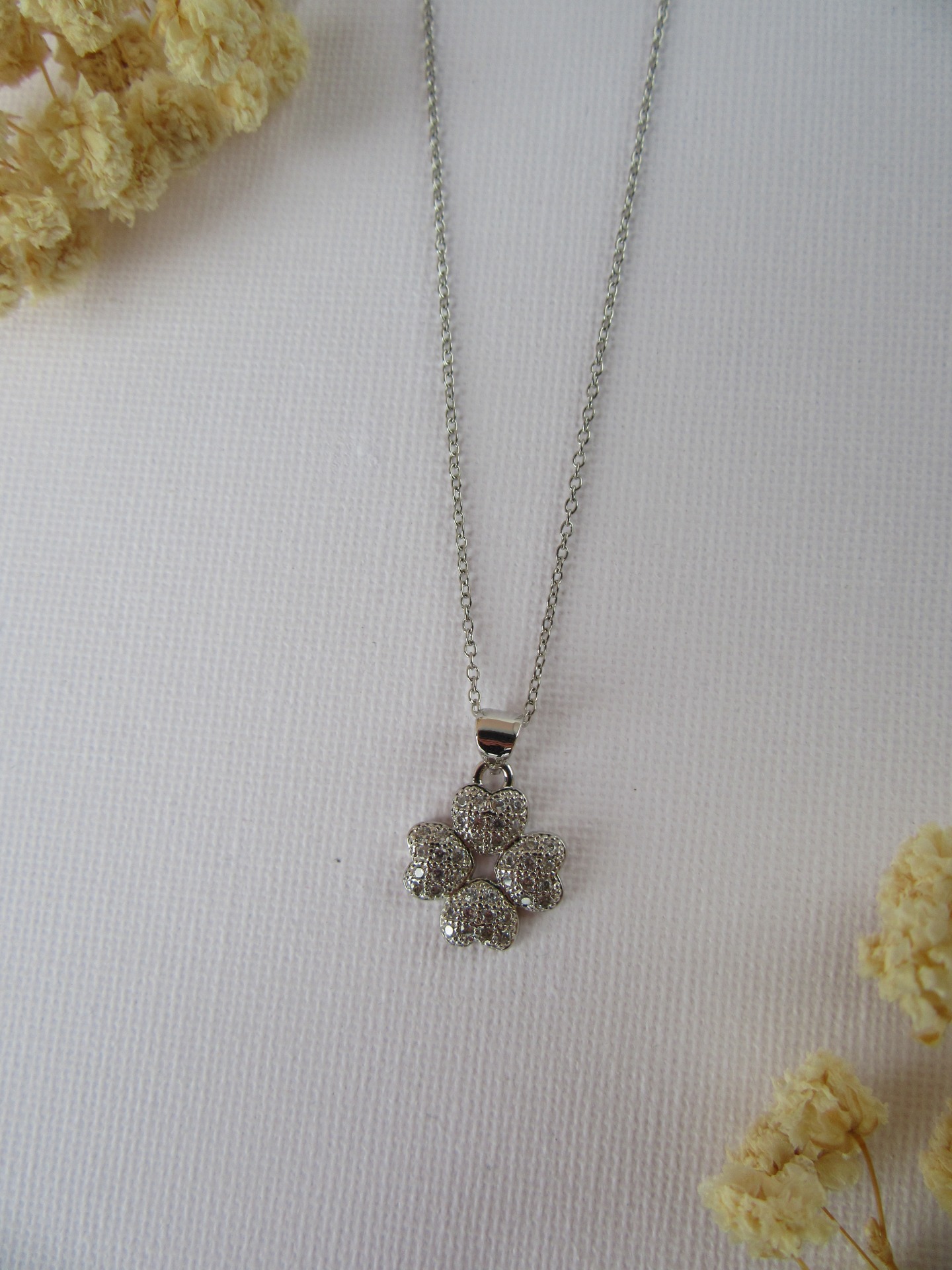 Colar simples feito à mão em aço inoxidável prateado, com medalha trevo com zircónias e com extensor de 5 cm garatindo o ajuste perfeito, a durabilidade e o conforto.