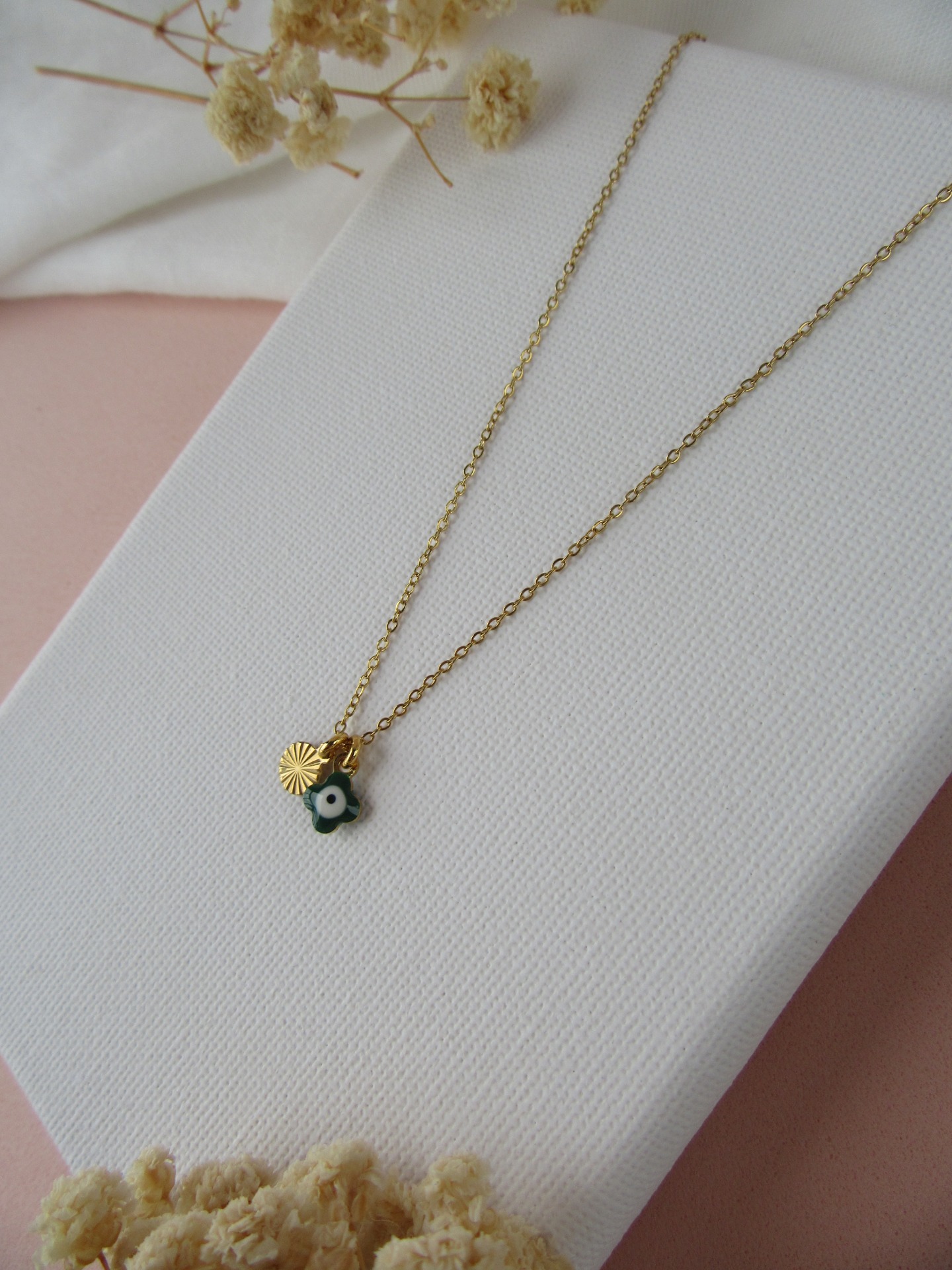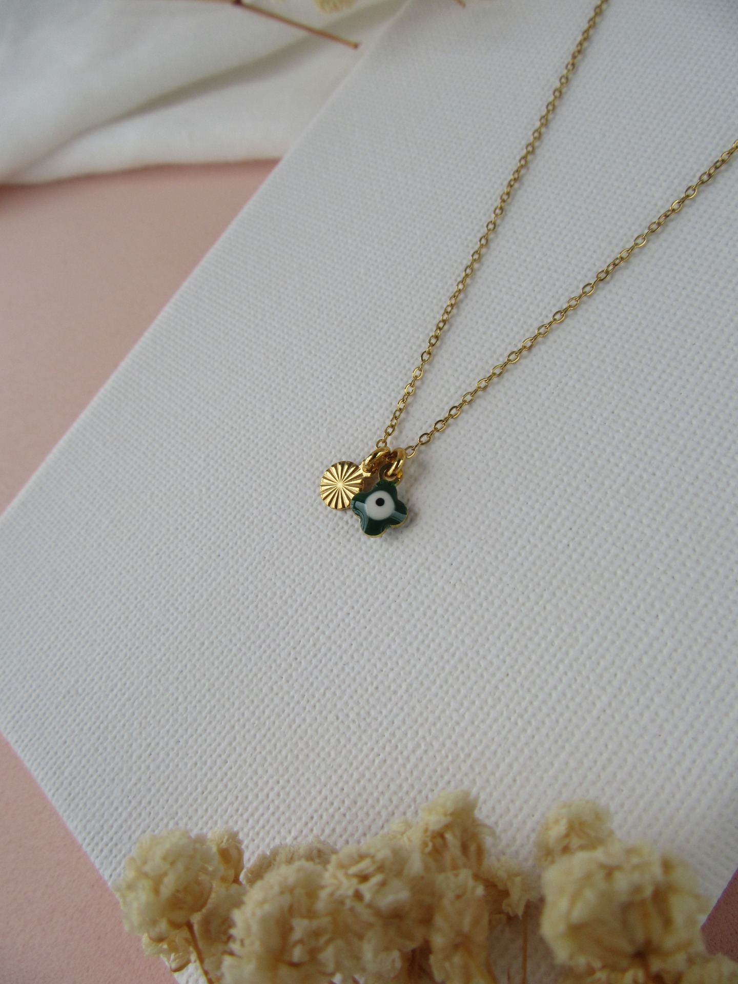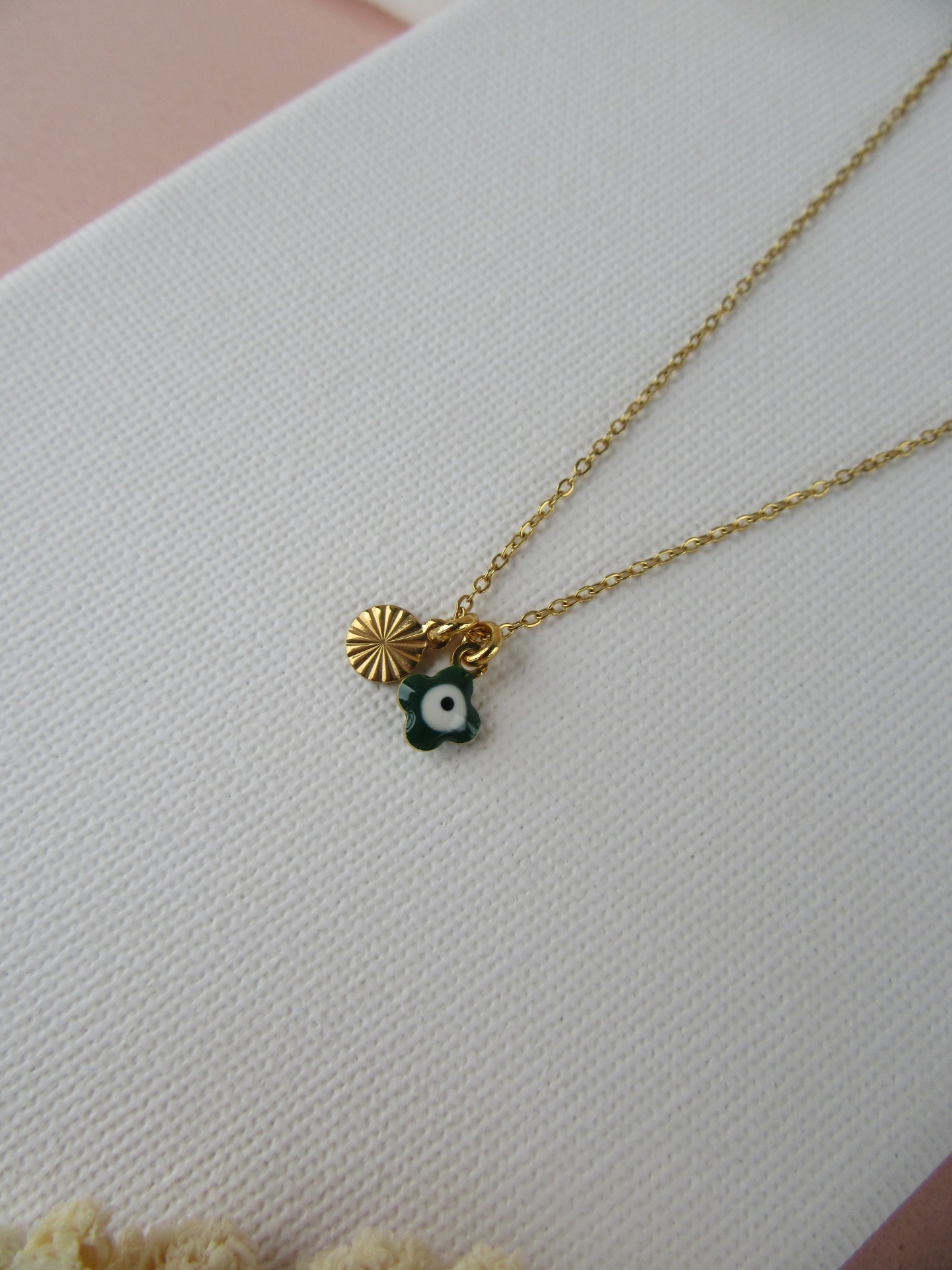 Colar simples feito à mão em aço inoxidável dourado, com medalhina trevo verde e medalhinha redonda em aço inoxidável, e com extensor de 5 cm garatindo o ajuste perfeito, a durabilidade e o conforto.