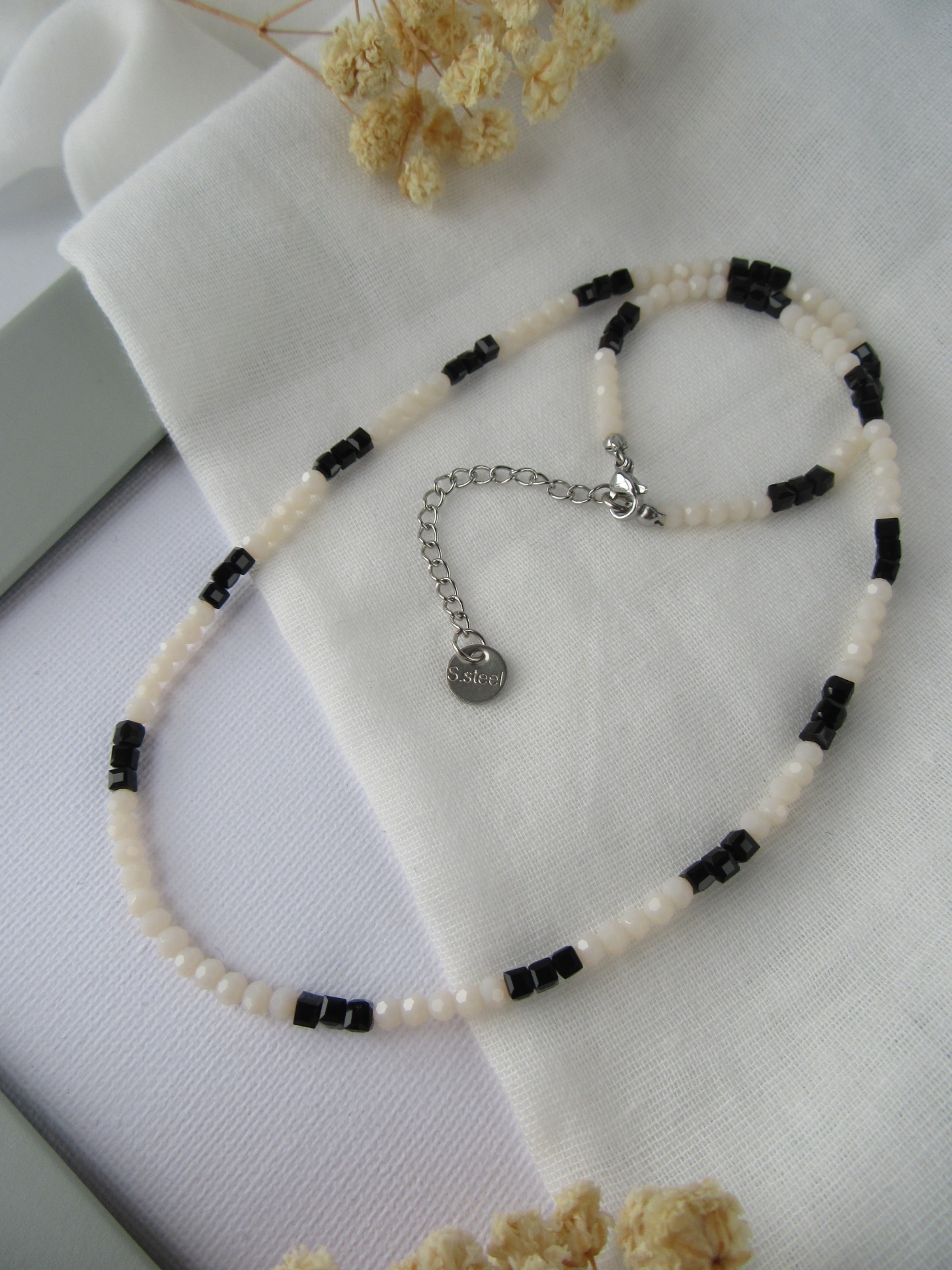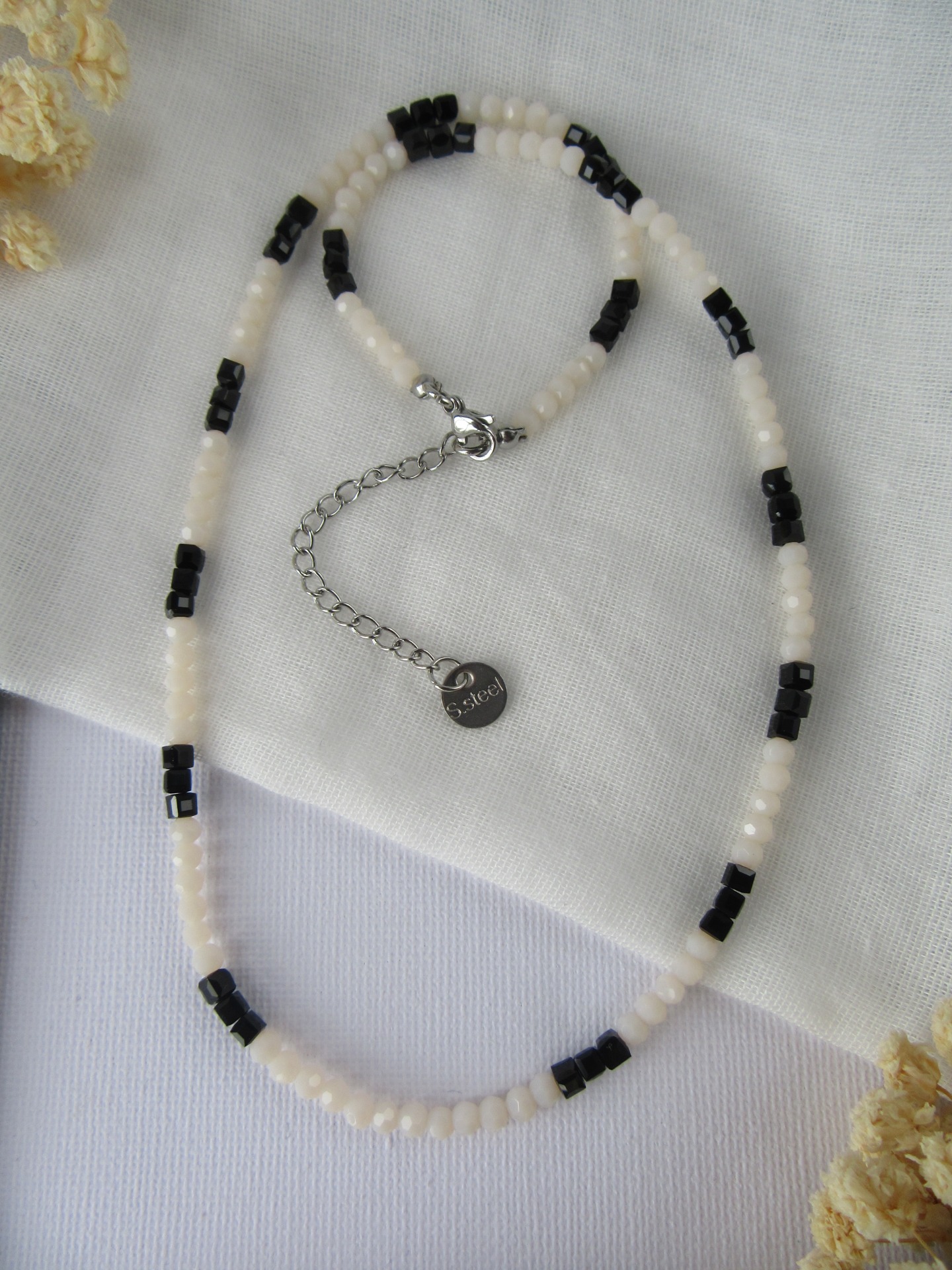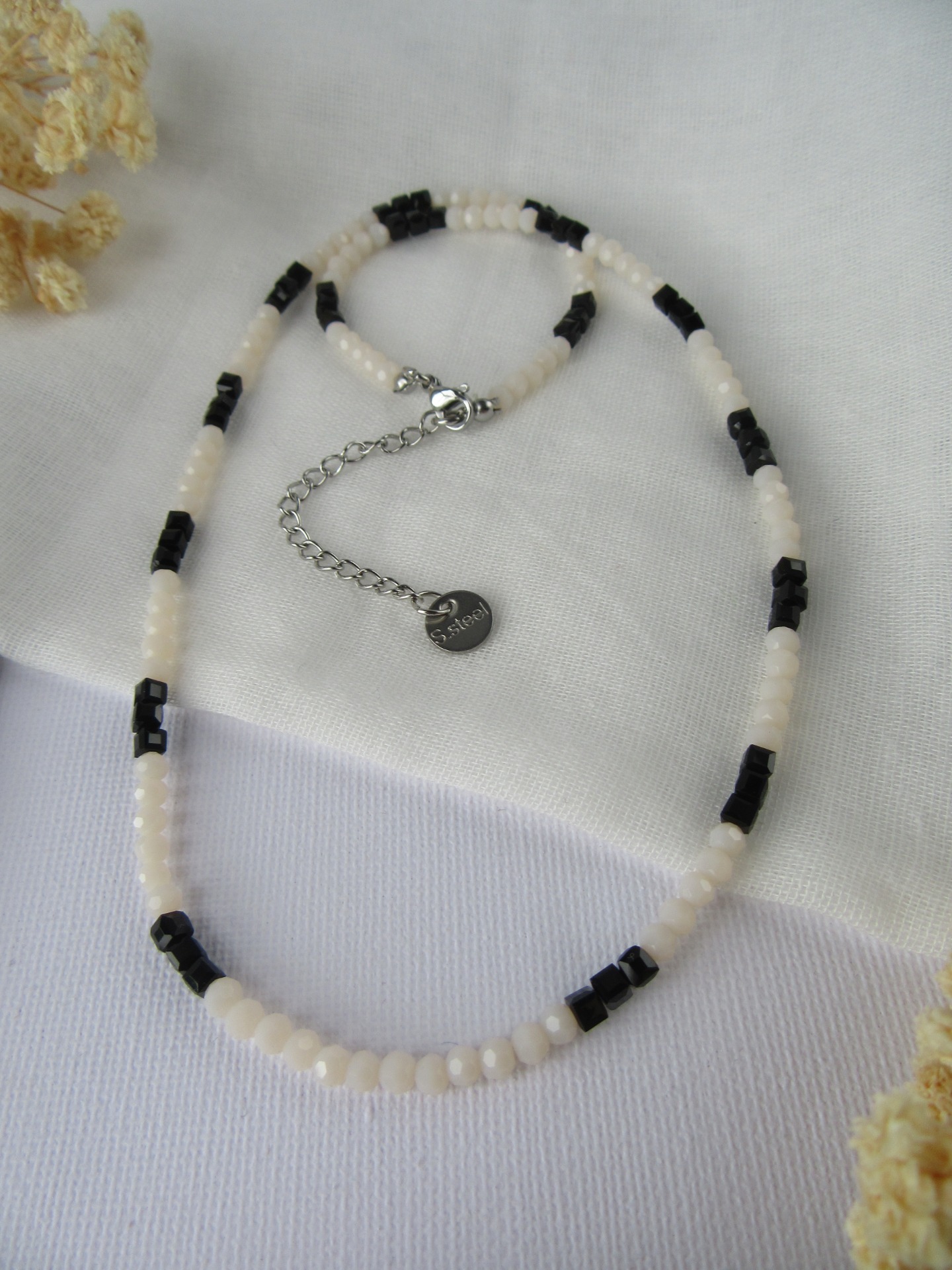 Colar feito à mão com cristais facetados bejes e cristais quadrados pretos, e com terminais de fecho e com extensor de 5 cm em aço inoxidável prateado garatindo o ajuste perfeito, a durabilidade e o conforto.