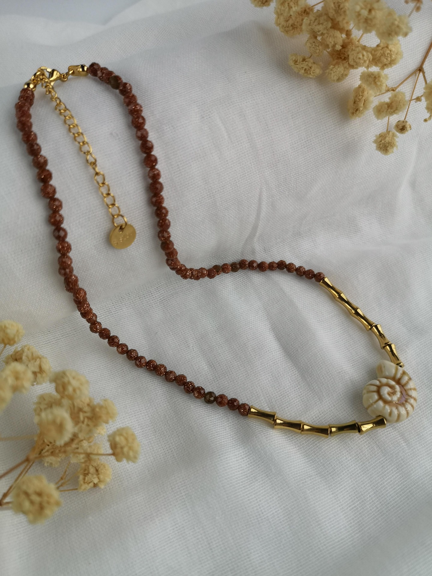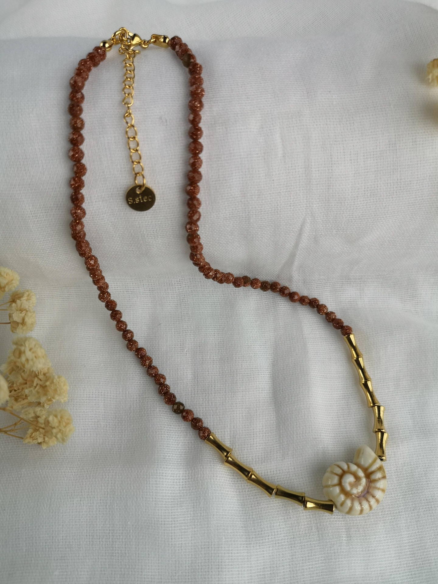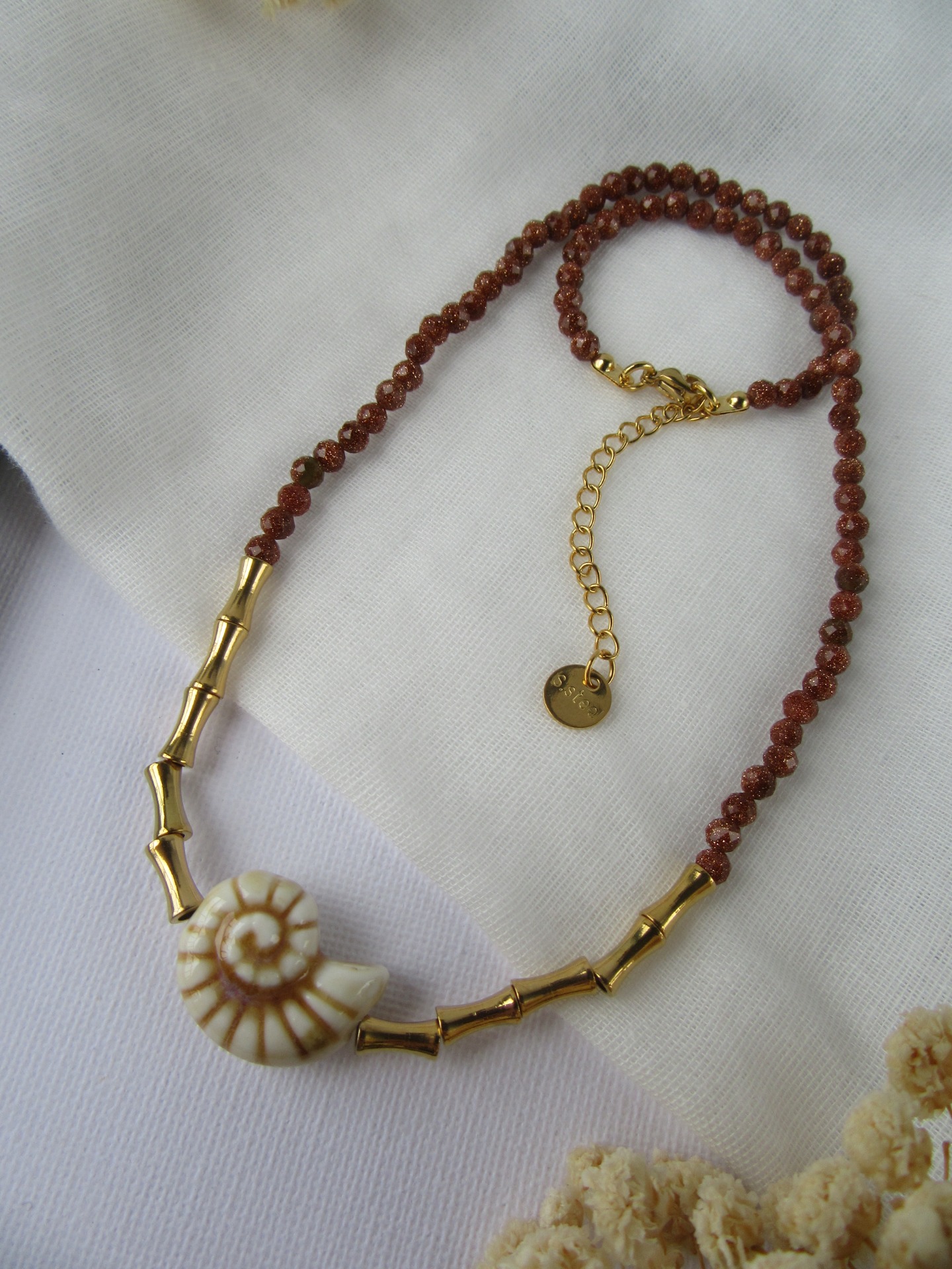 Colar feito à mão com cristais facetados castanho, com efeito brilhante e pedra em cerâmica em forma de búzio, com detalhes dourados em aço inoxidável, e com terminais de fecho e com extensor de 5 cm em aço inoxidável dourados garatindo o ajuste perfeito, a durabilidade e o conforto.