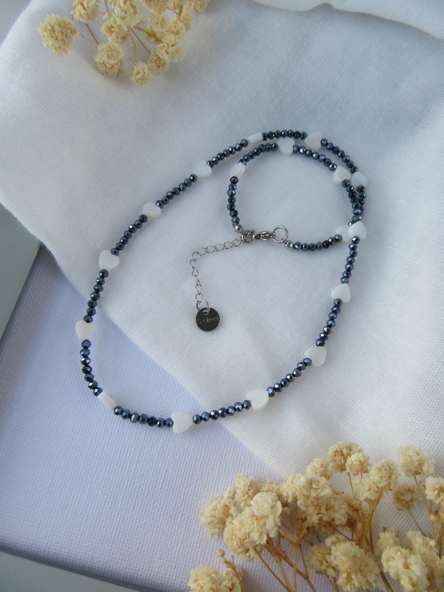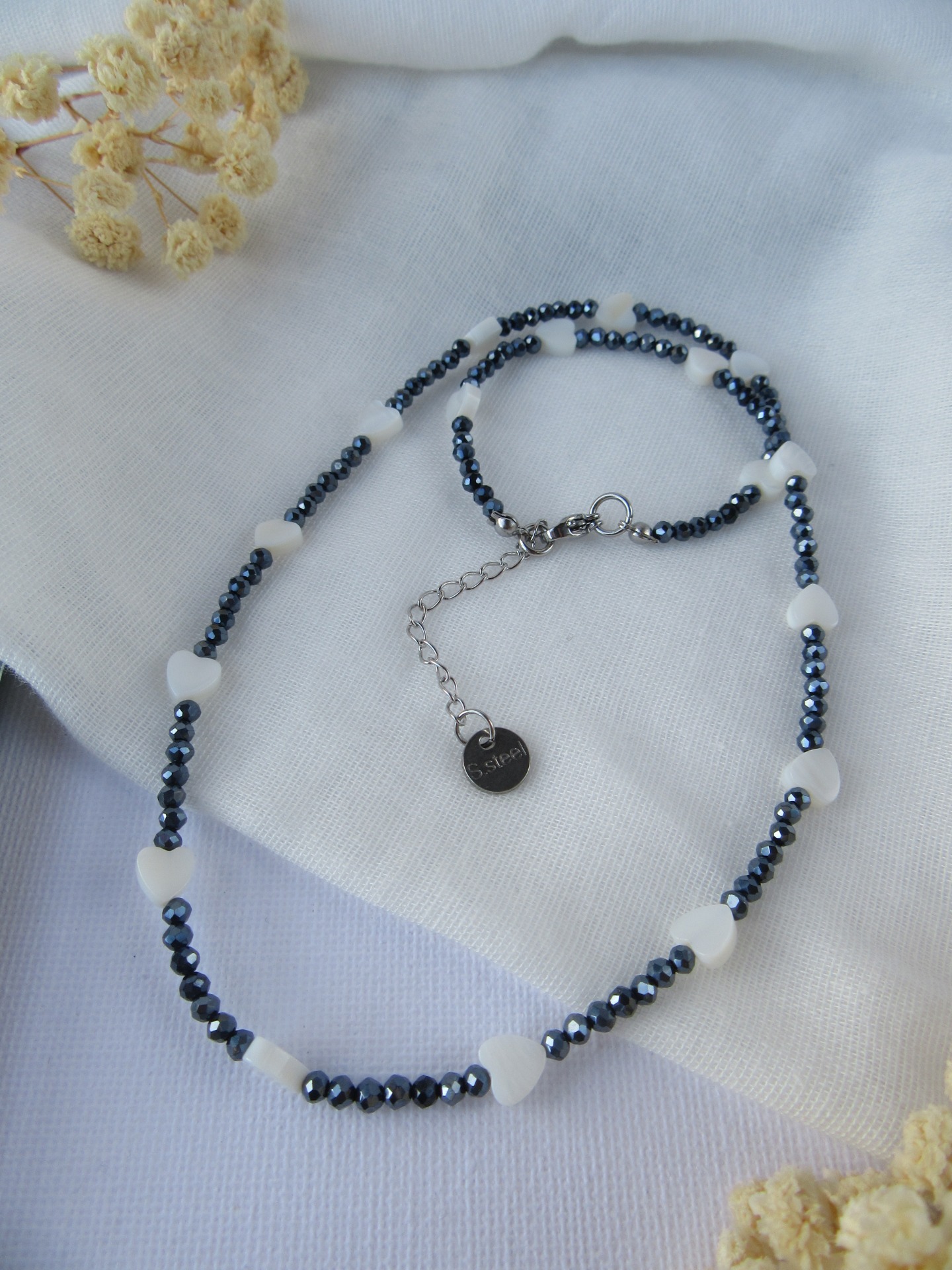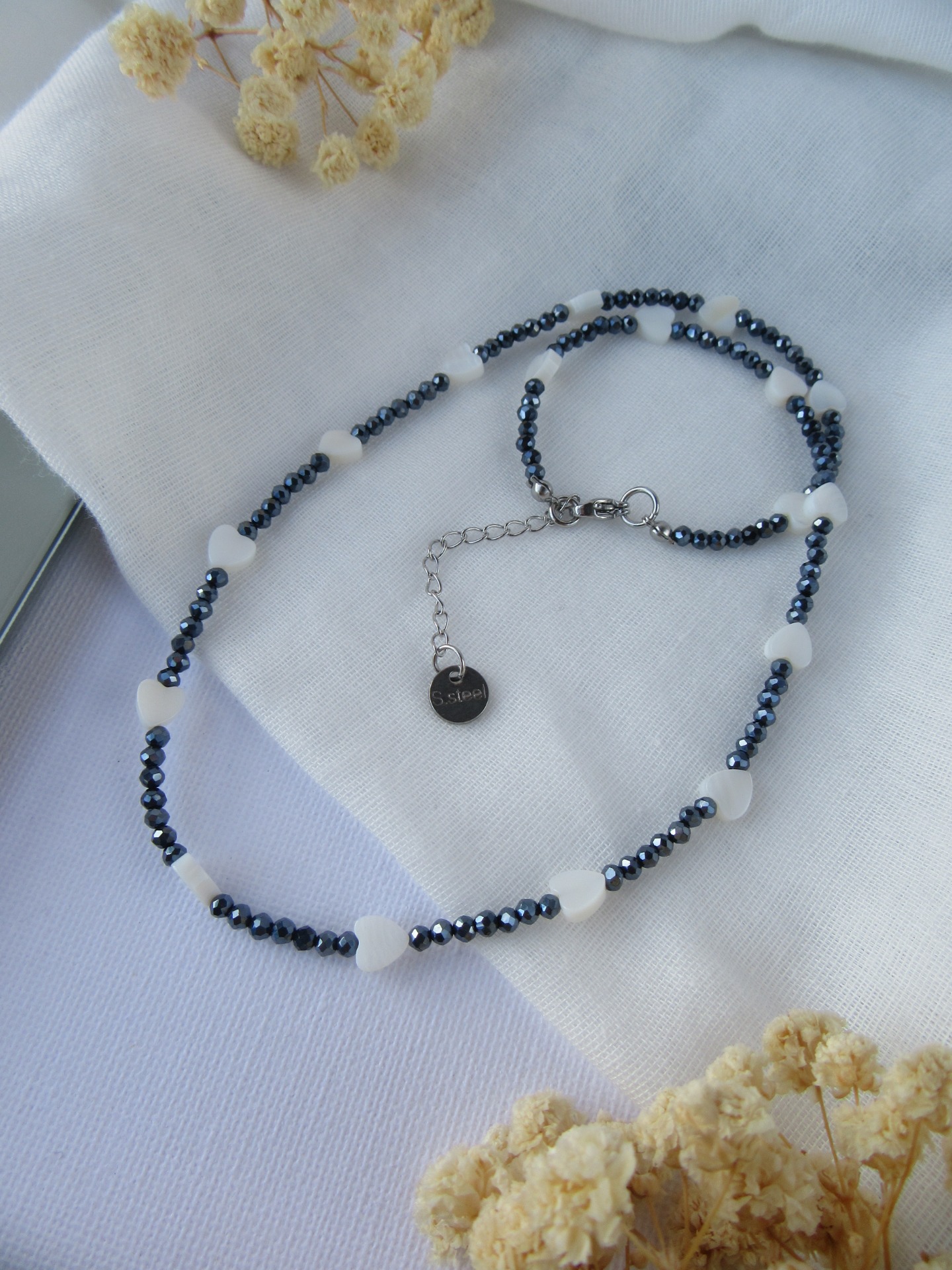 Colar feito à mão com cristais facetados azul escuro e corações em madrepérola, e com terminais de fecho e com extensor de 5 cm em aço inoxidável prateados garatindo o ajuste perfeito, a durabilidade e o conforto.