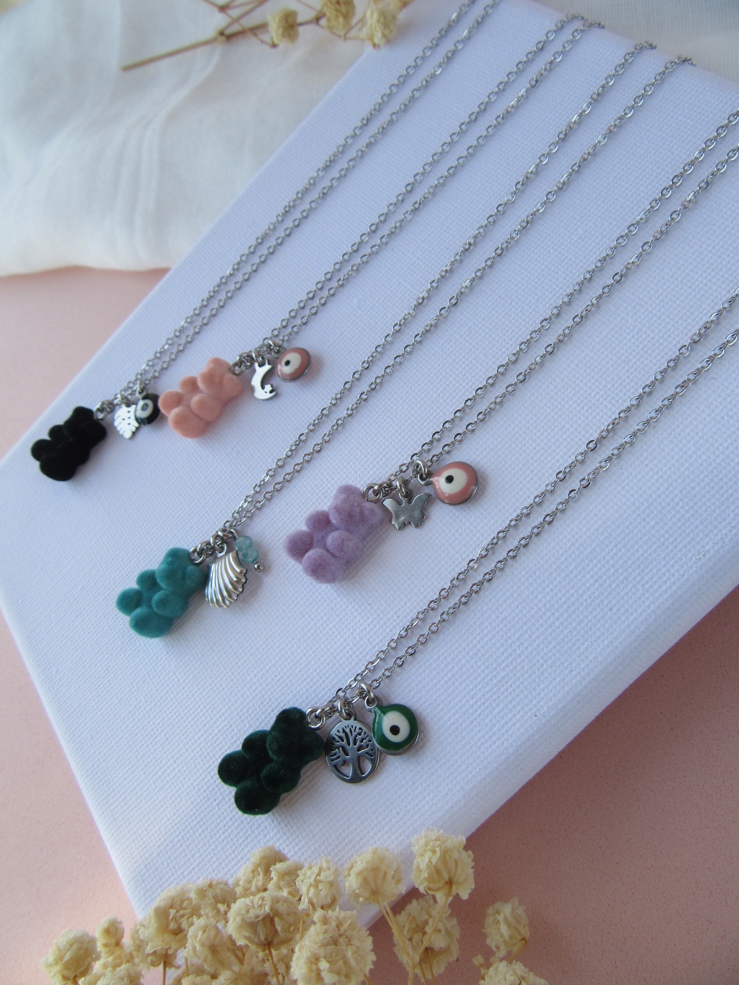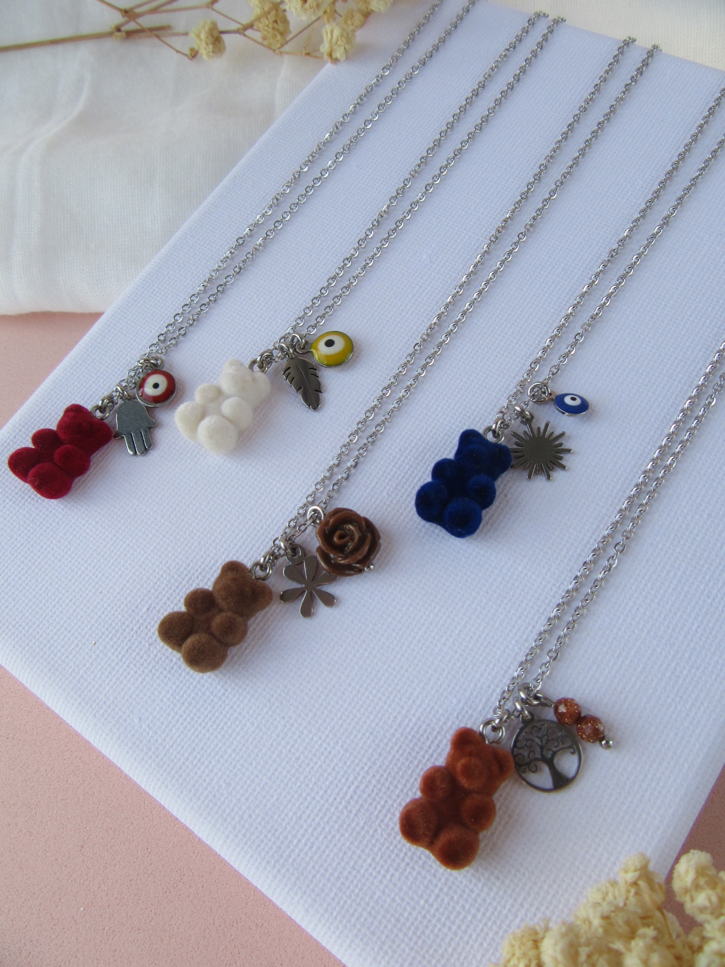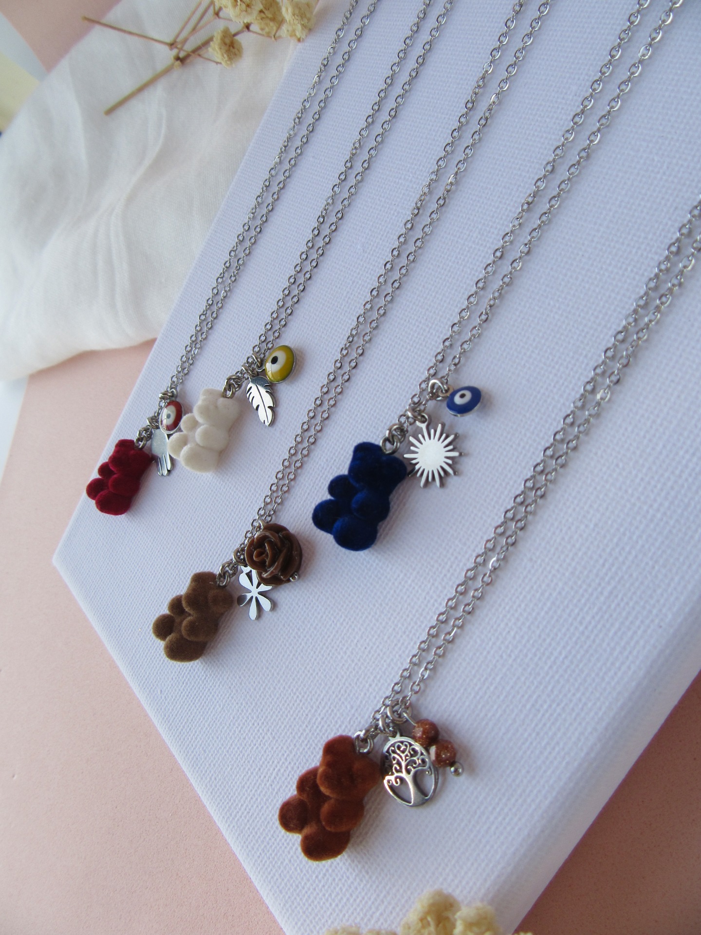 Colares feitos à mão em aço inoxidável prateado com medalhas em forma de ursinho revestidas a veludo e medalhinhas em aço inoxidável, e com extensor de 5 cm garatindo o ajuste perfeito, a durabilidade e o conforto.
