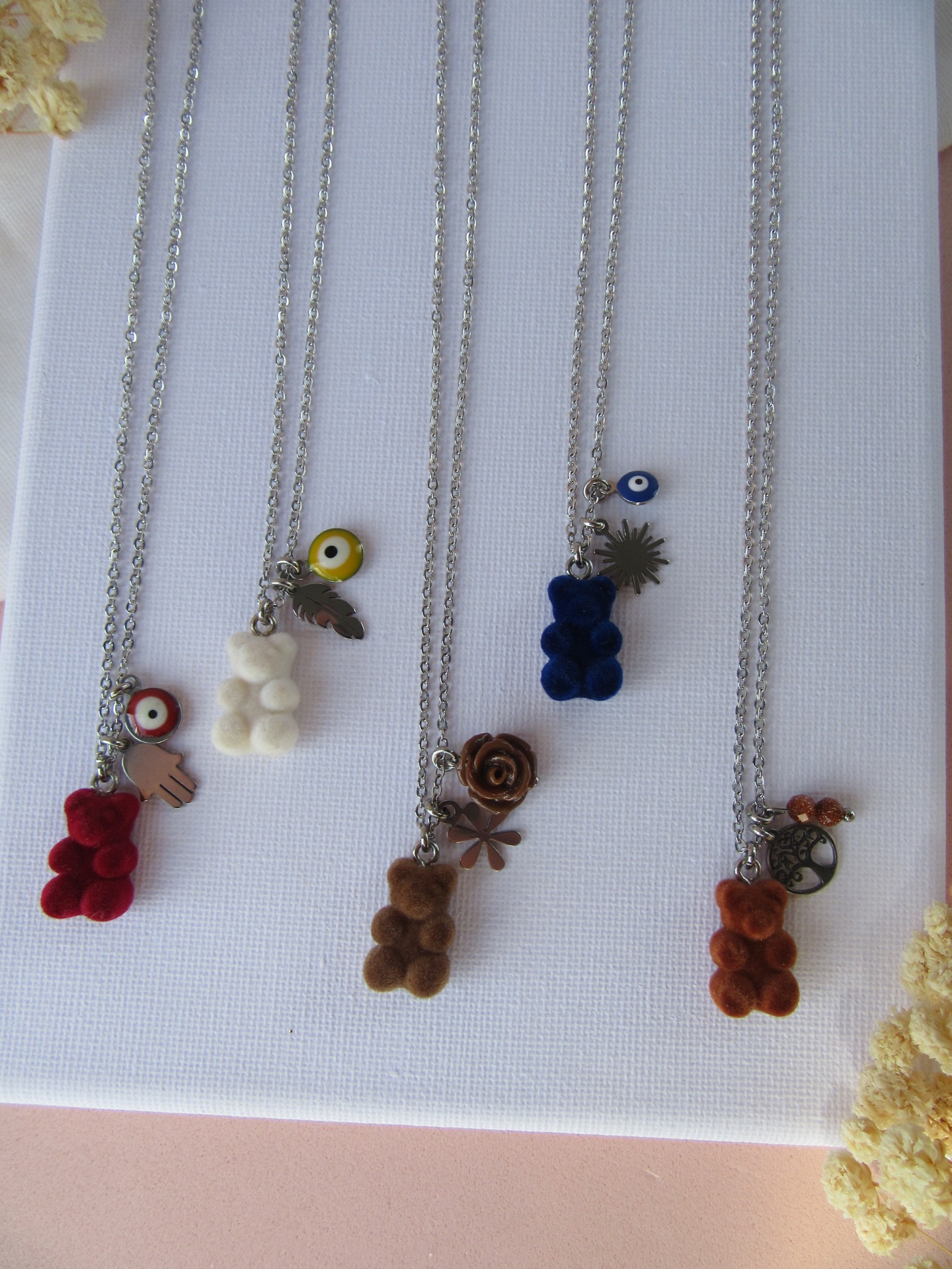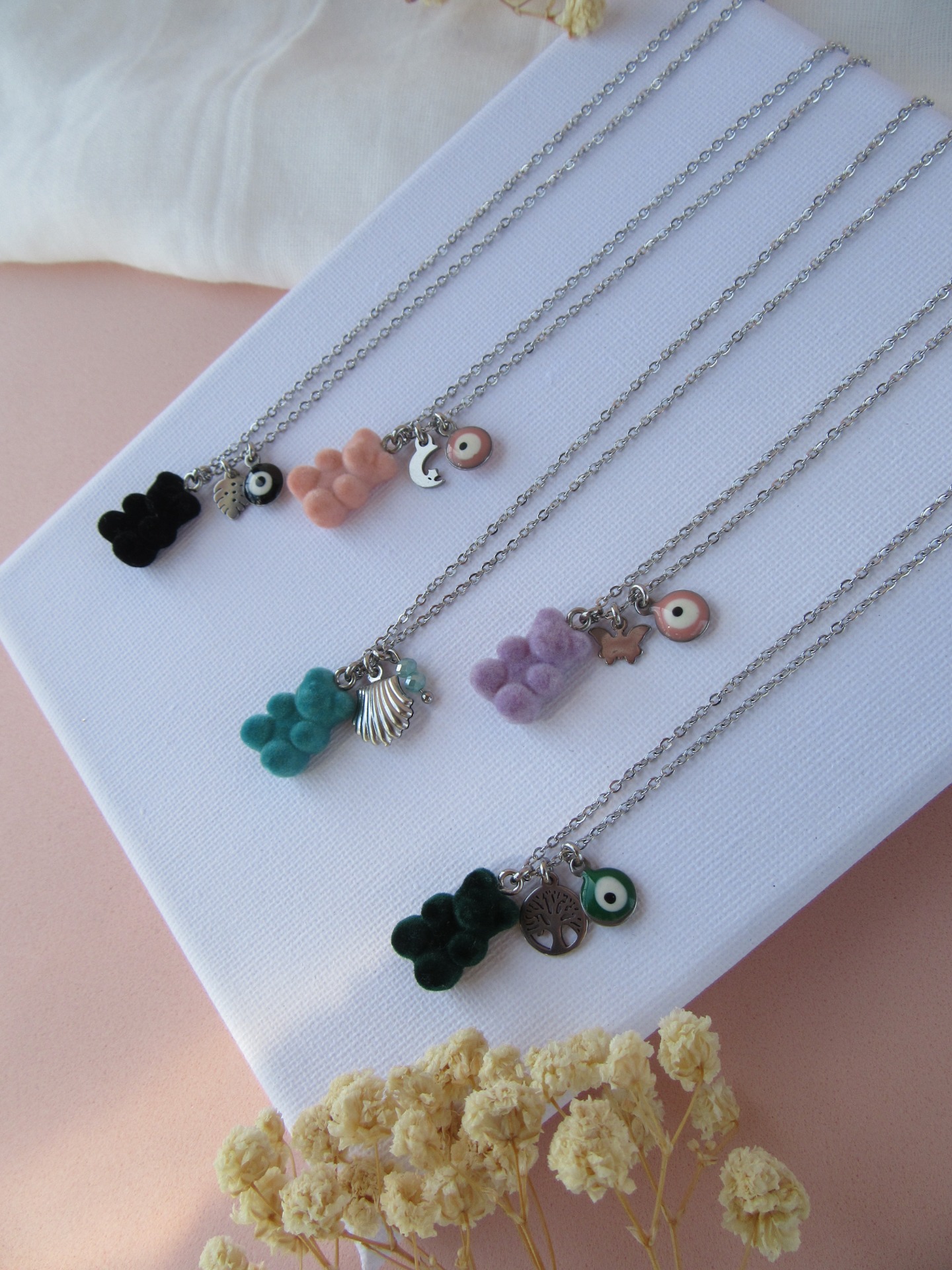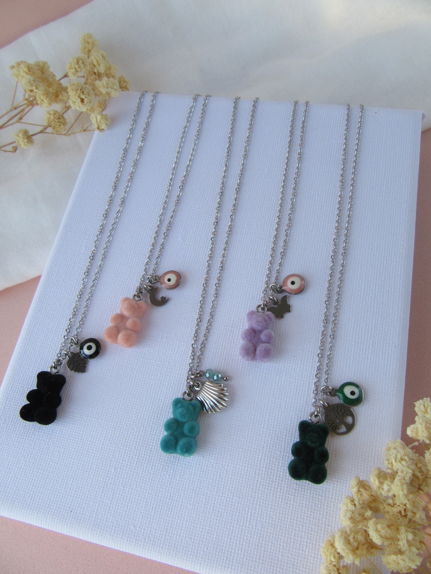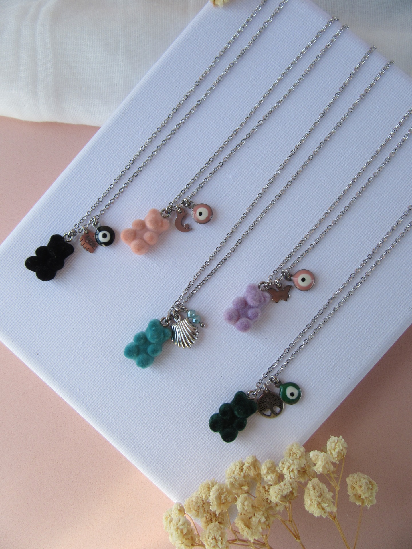 Colares feitos à mão em aço inoxidável prateado com medalhas em forma de ursinho revestidas a veludo e medalhinhas em aço inoxidável, e com extensor de 5 cm garatindo o ajuste perfeito, a durabilidade e o conforto.