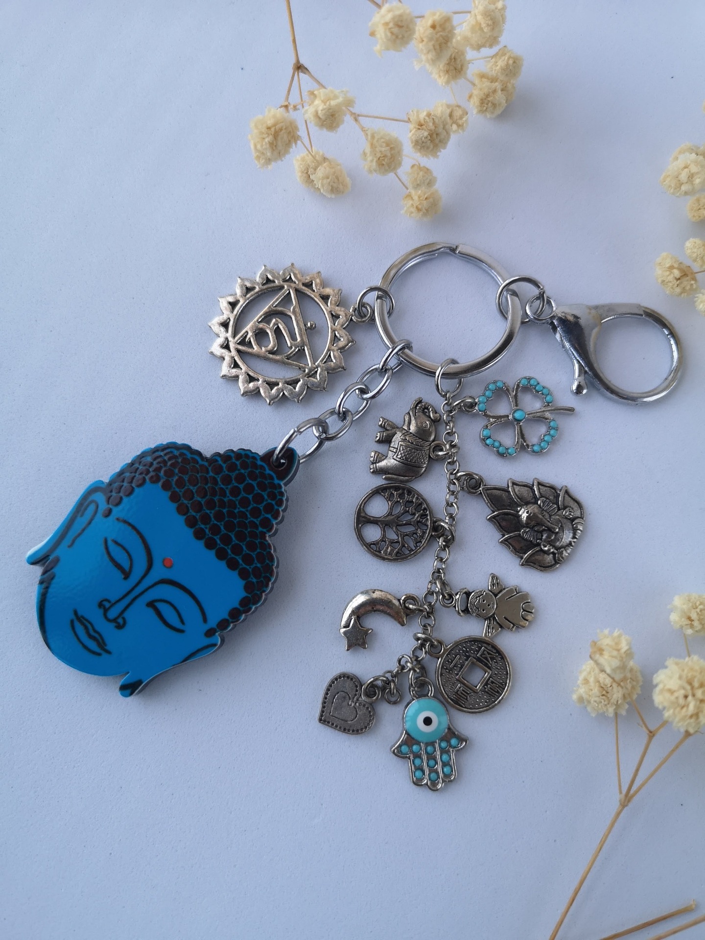 Feita à mão com vários materiais, como o latão, acrílico e vários pendentes.